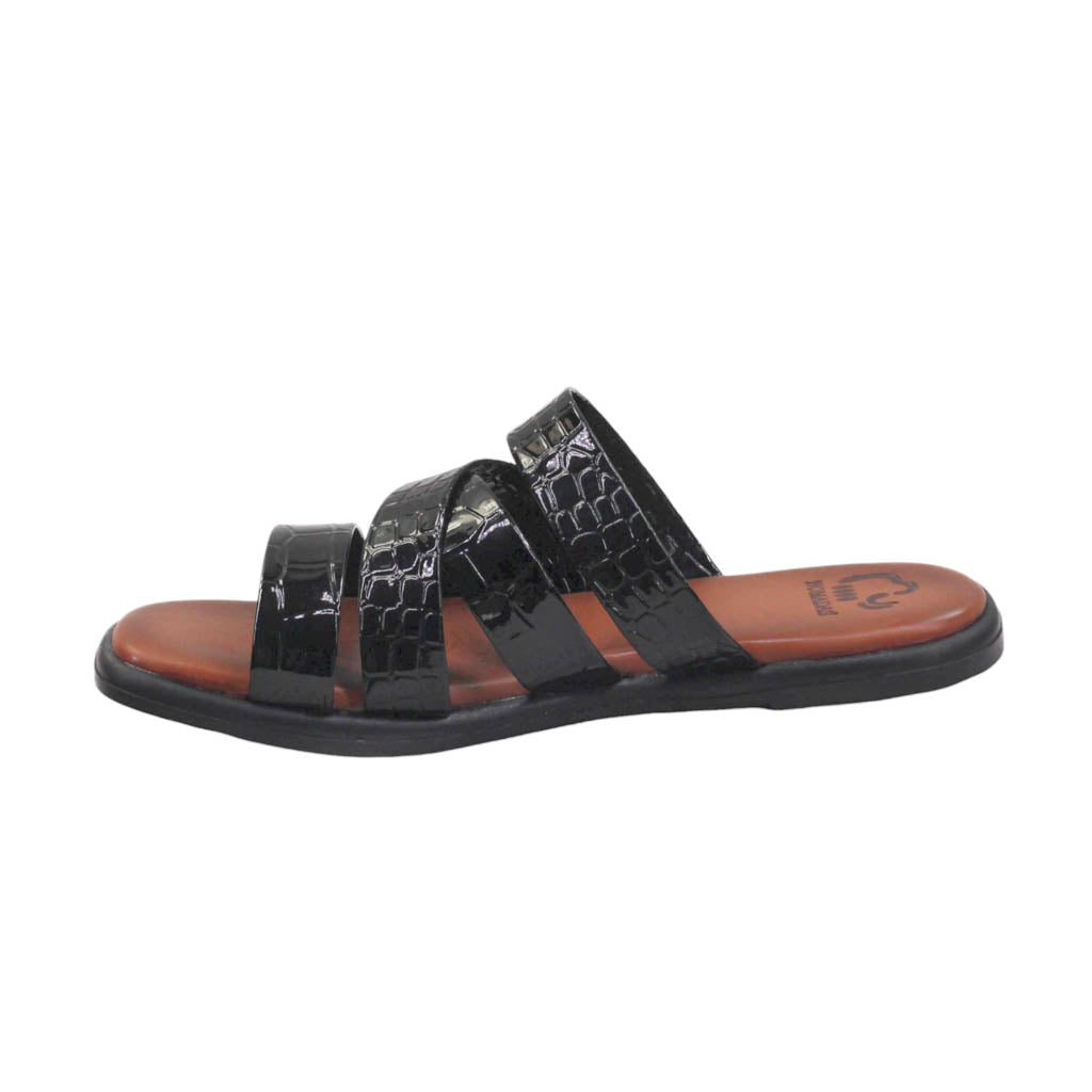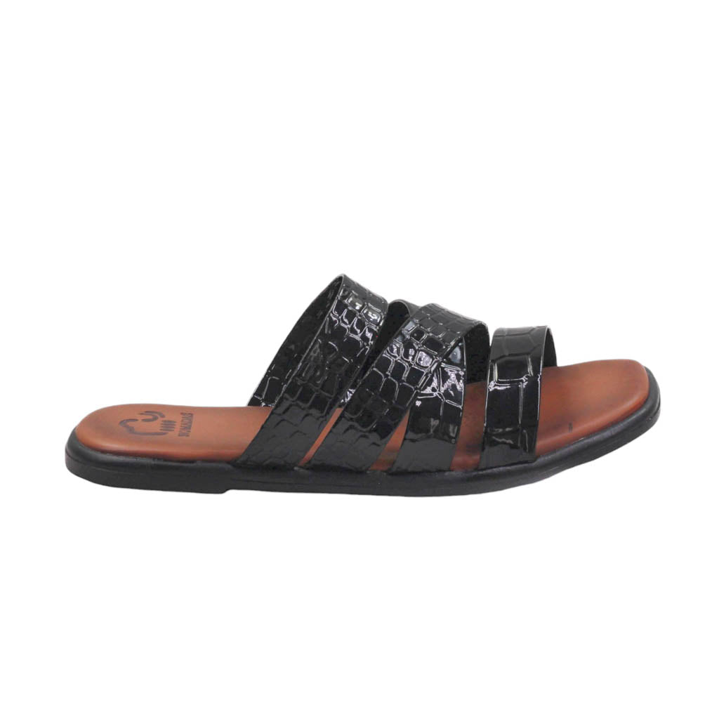 Sandalia para dama marca Nómadas en colores negro charol. Es un modelo con tiras medias y plantilla de confort. Este modelo destaca por la suavidad que te dará paso a paso.