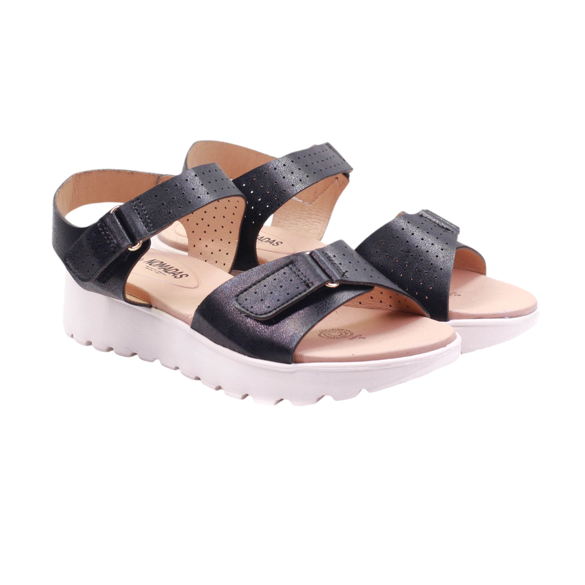 Sandalia para dama marca nómadas en color negro. Cuenta con tira ancha delantera y tira ajustable en tobillo. Este tipo de sandalia es especial y refleja mucha originalidad, su tacón de 2,00 centímetros de altura te da un caminar cómodo y suave.