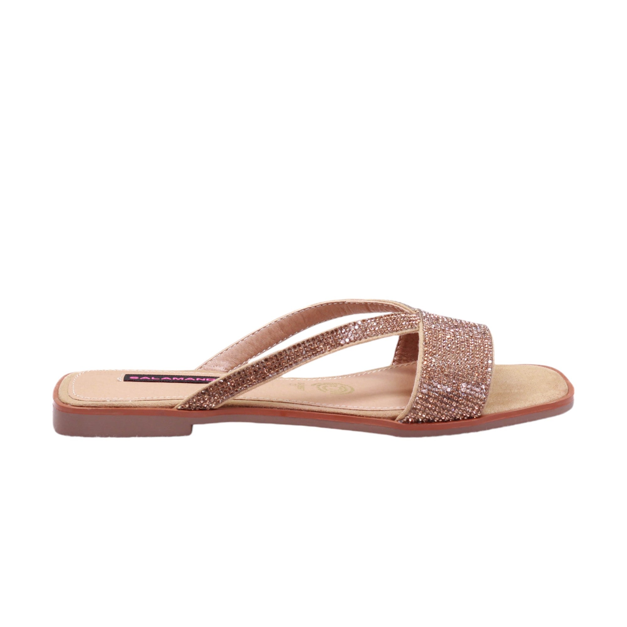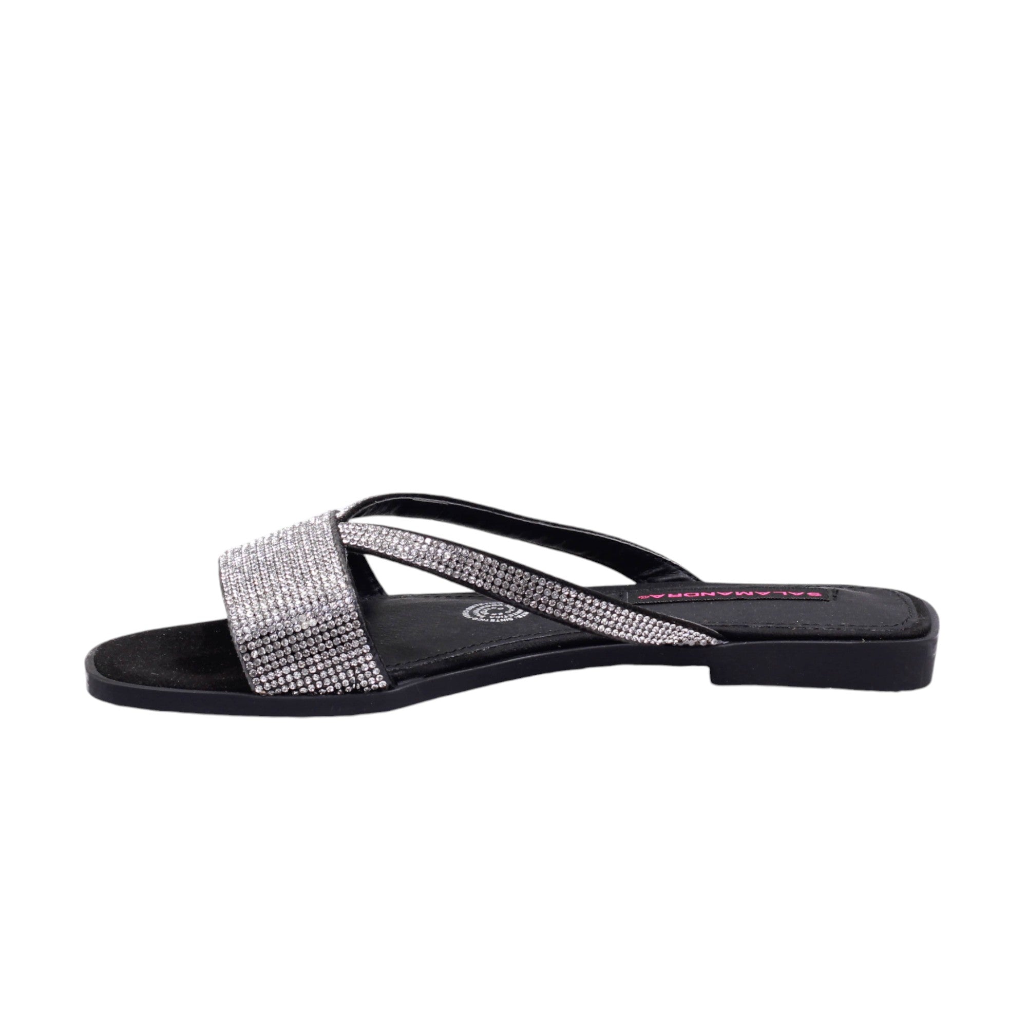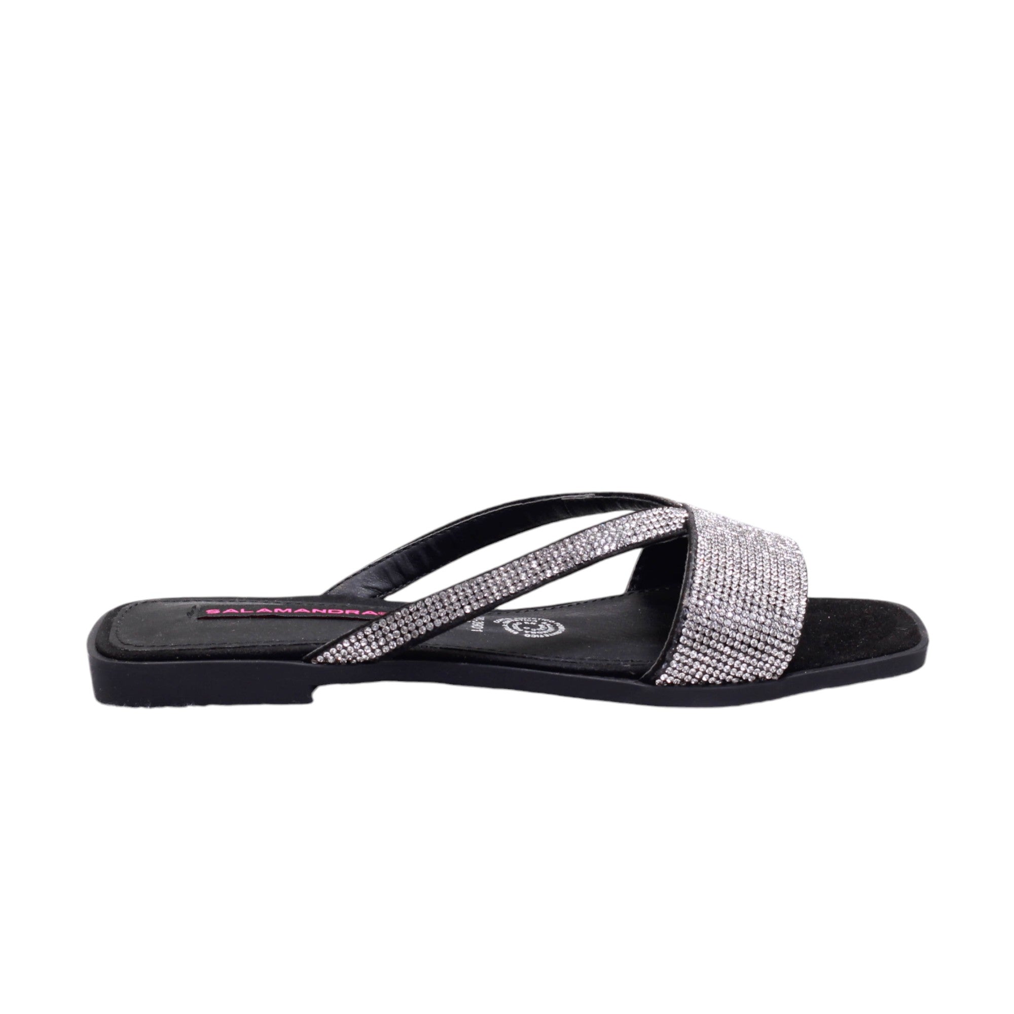 Sandalia para dama marca Salamandra en colores negro y ocre. Esta bella sandalia cuenta con tiras cubierta en pedrería, plantilla de confort y tiras delgadas de enredadera al tobillo, lo cual brinda una comodidad excepcional, fácil de combinar con casi cualquier tipo de prenda.