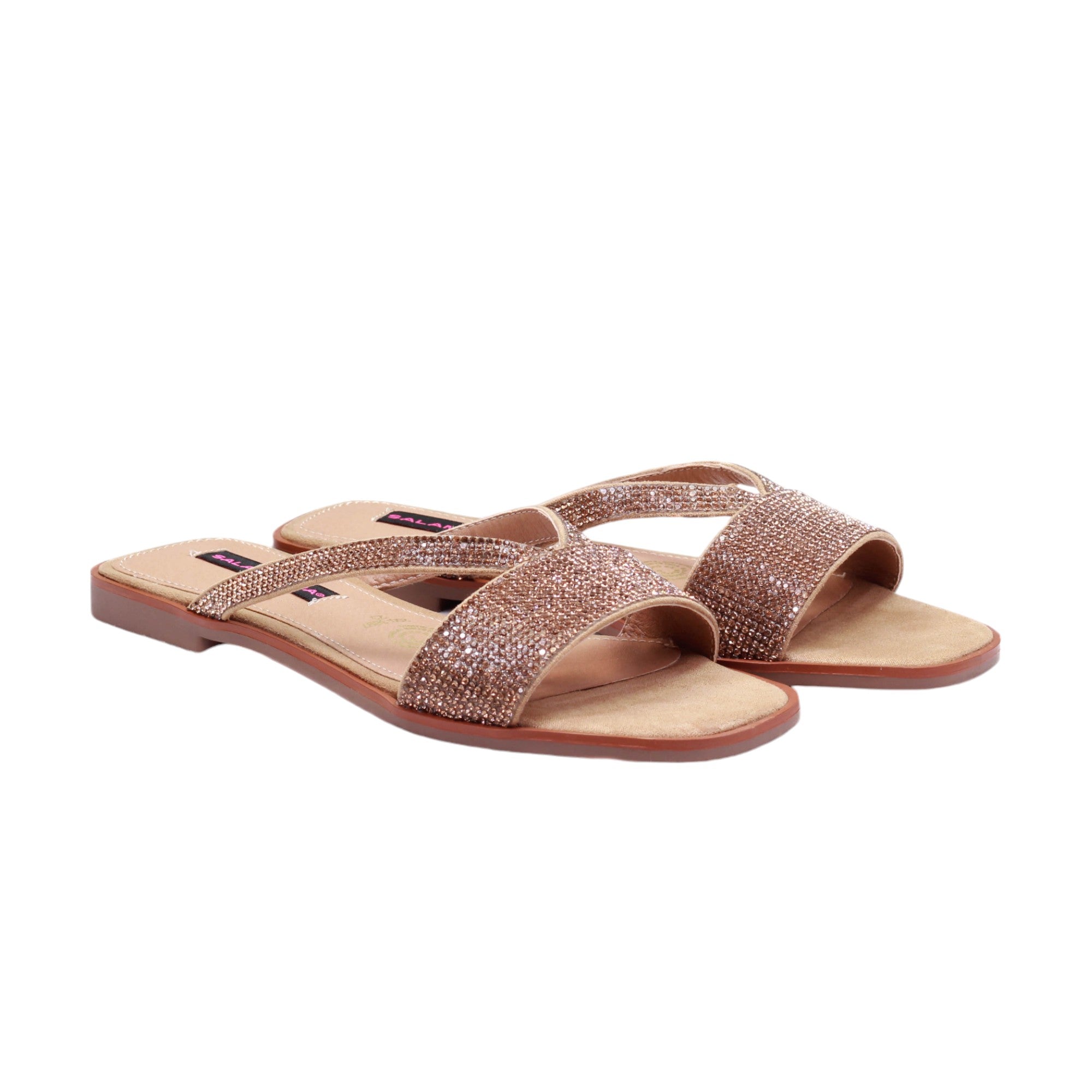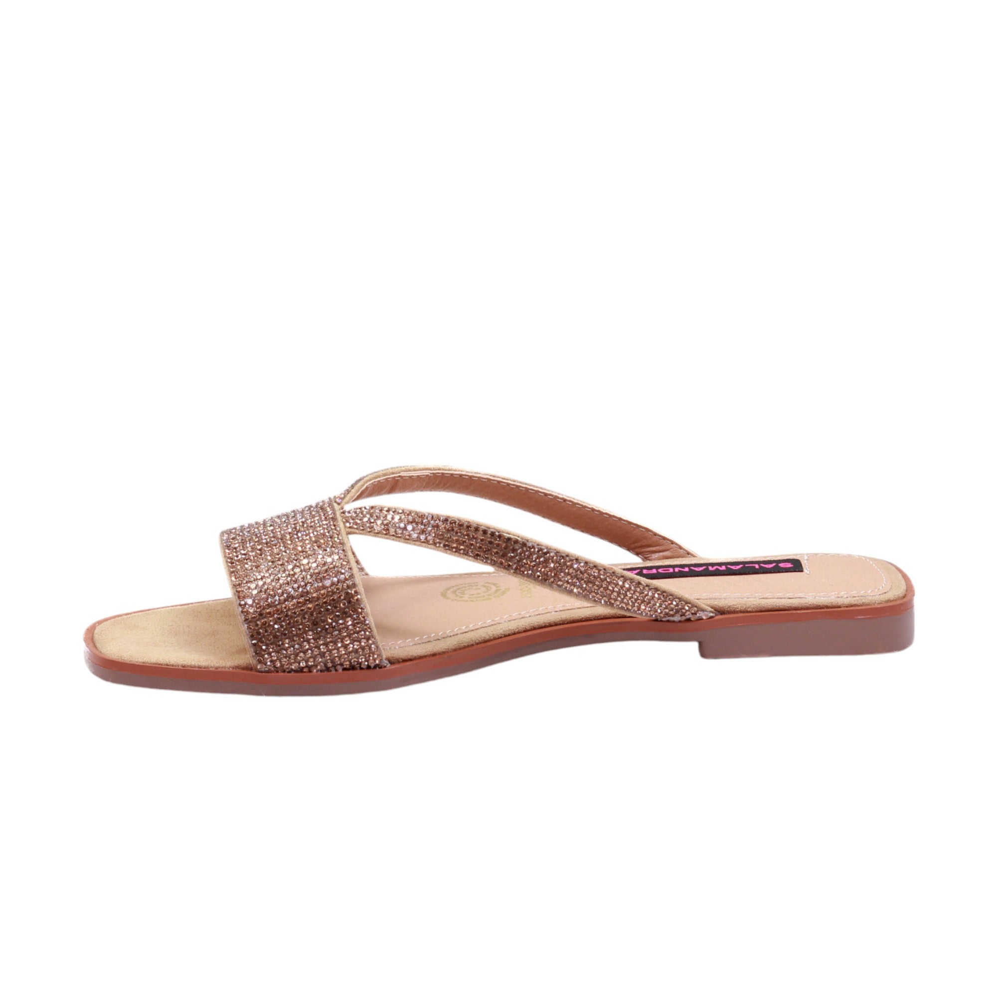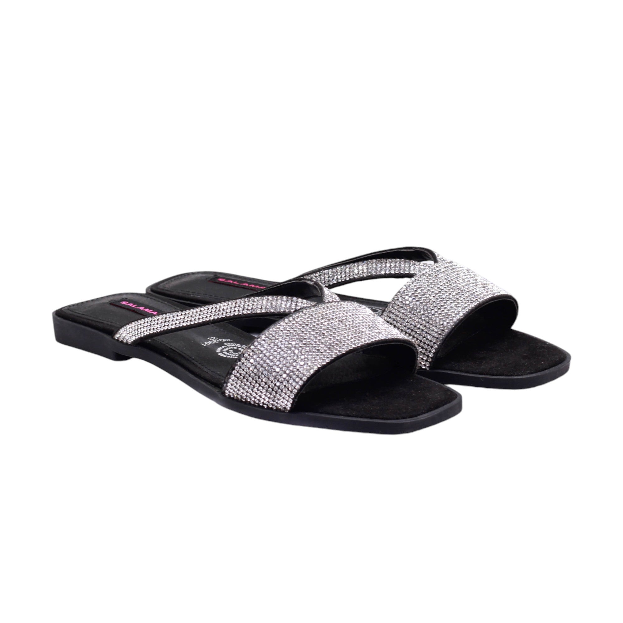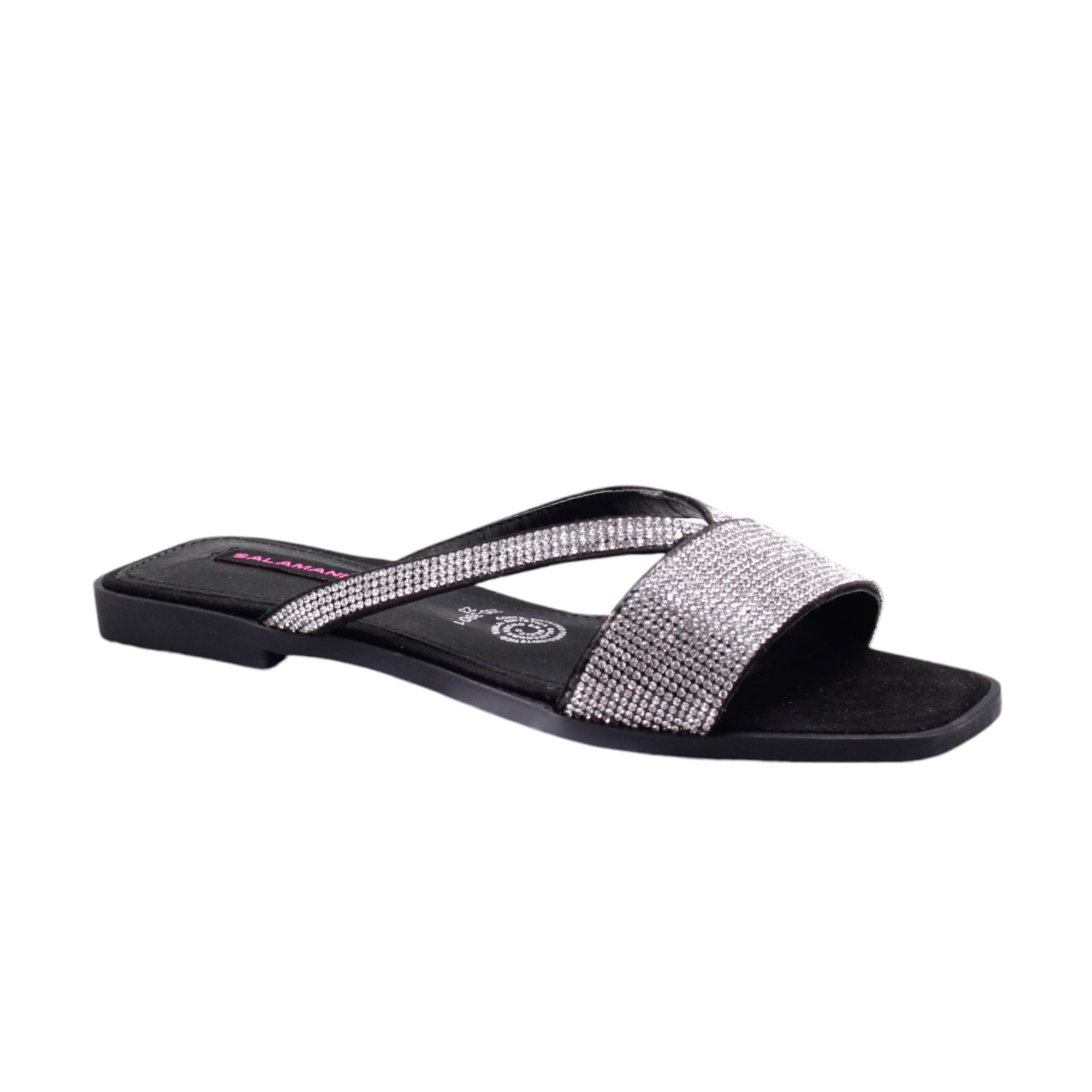 Sandalia para dama marca Salamandra en colores negro y ocre. Esta bella sandalia cuenta con tiras cubierta en pedrería, plantilla de confort y tiras delgadas de enredadera al tobillo, lo cual brinda una comodidad excepcional, fácil de combinar con casi cualquier tipo de prenda.