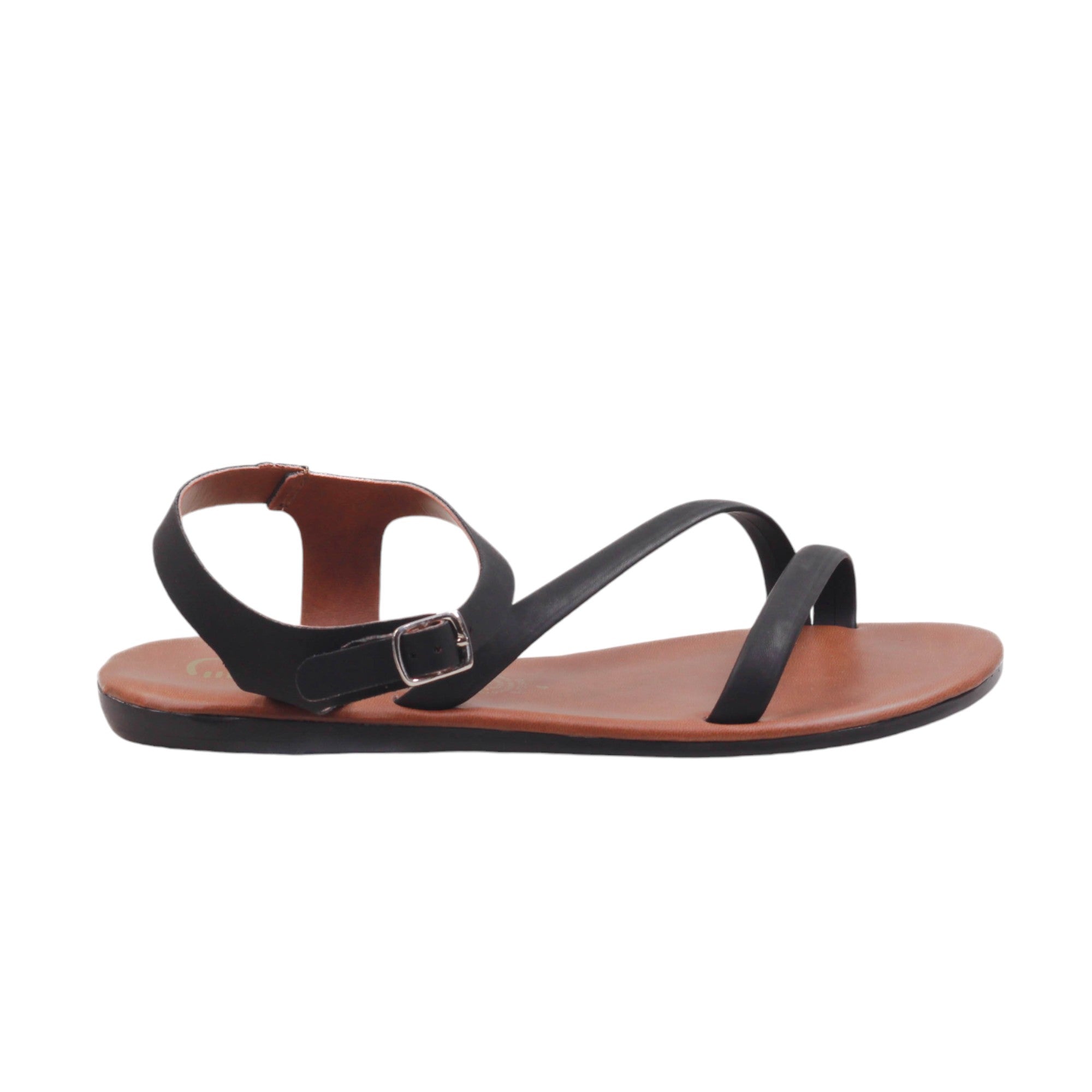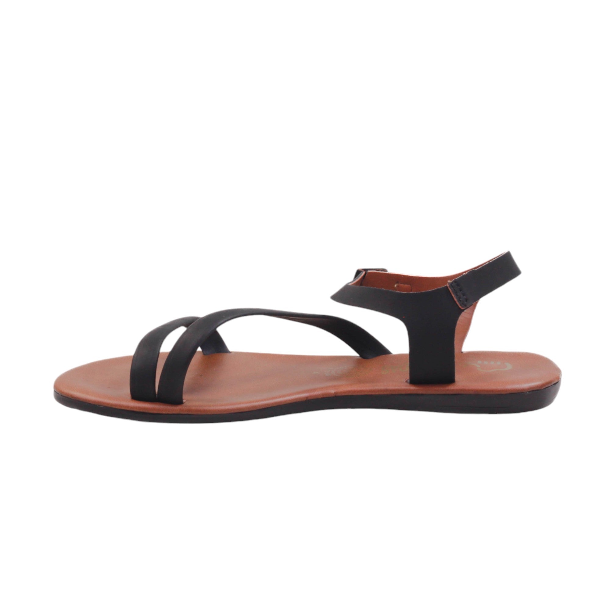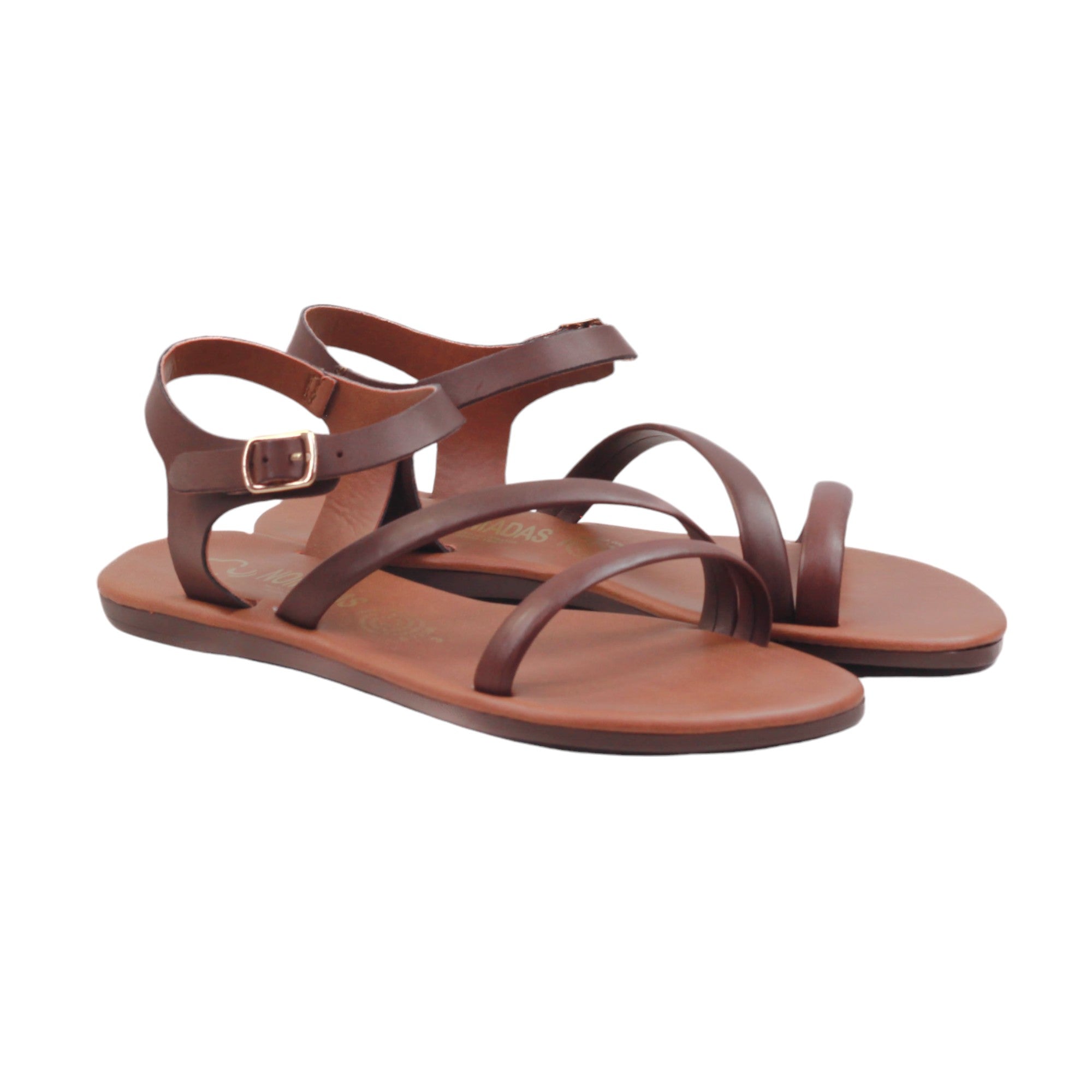 Sandalia para dama marca Nomadas en colores cogñac y negro. Es un modelo con doble tira delgada, plantilla de confort. Este modelo destaca por la suavidad que te dará paso a paso.