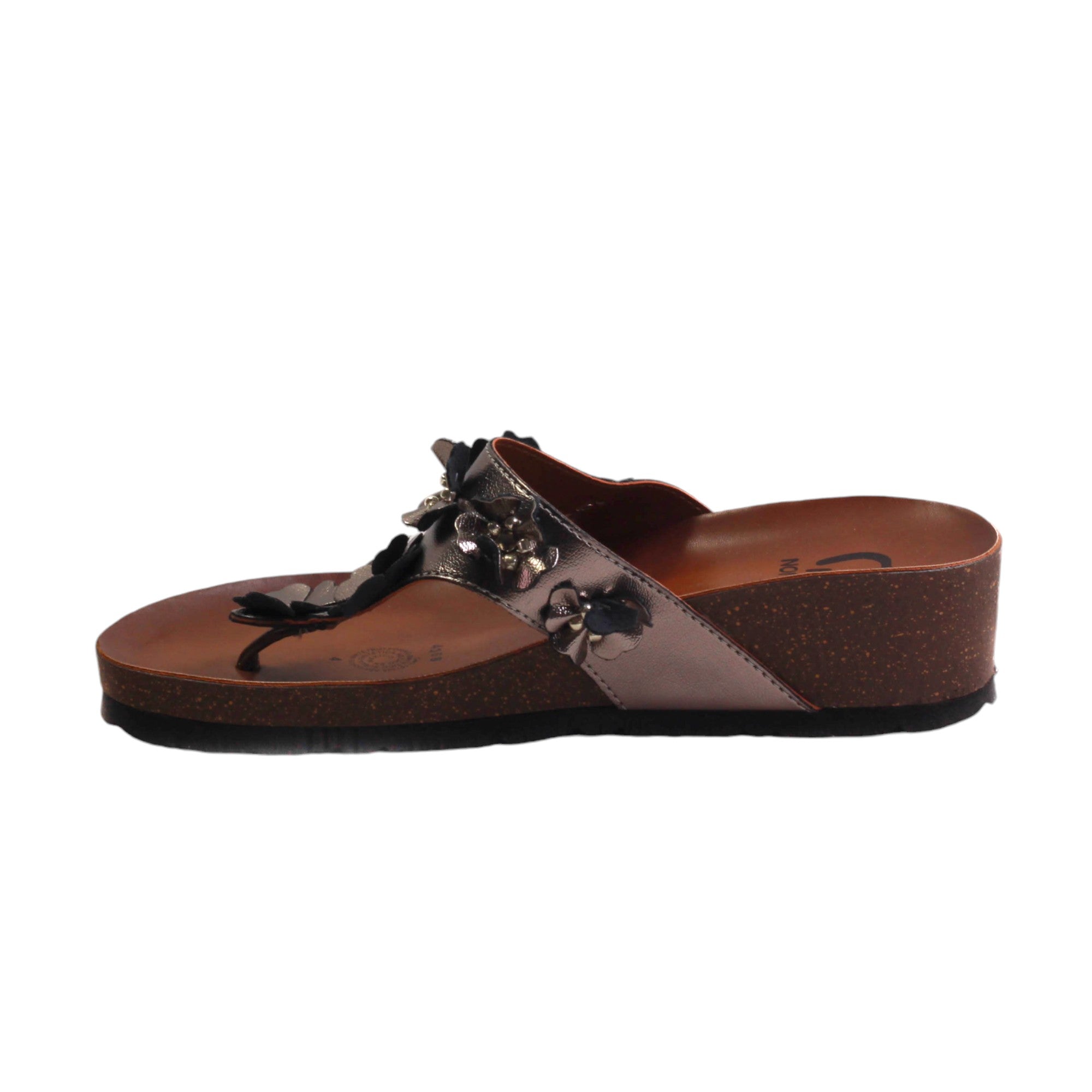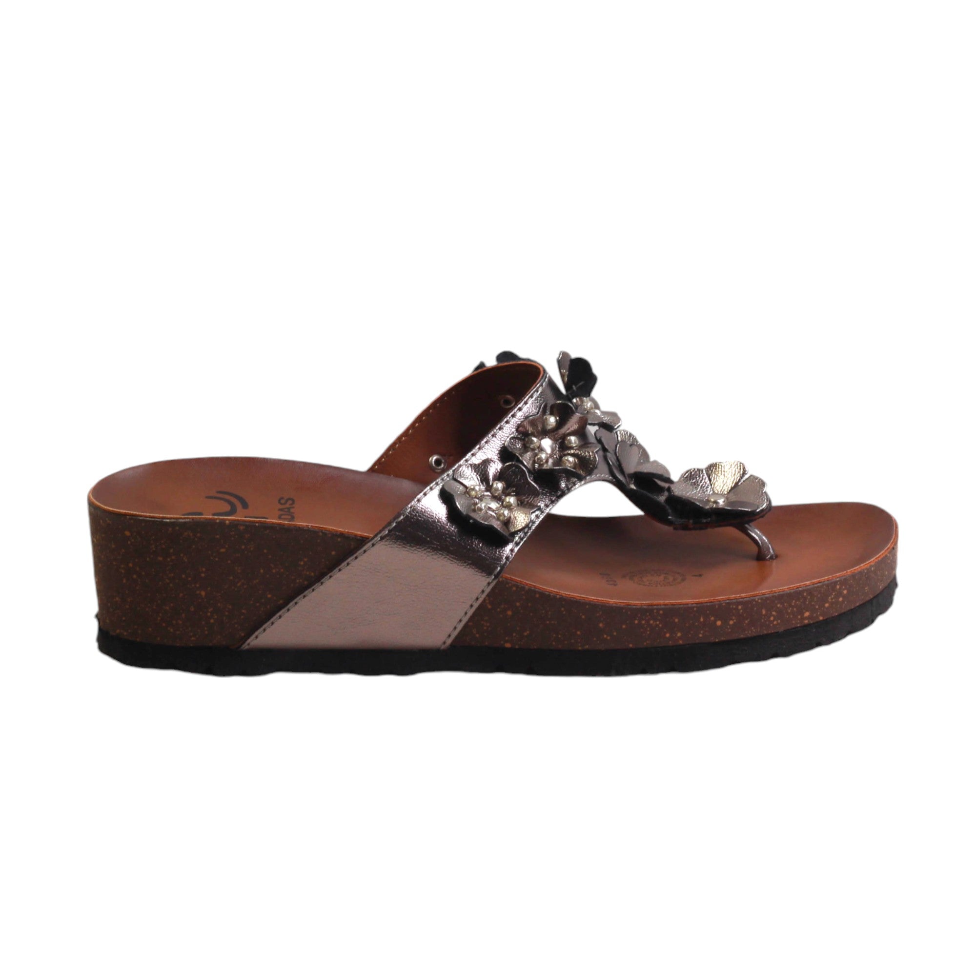 Sandalia para dama marca Nómadas en colores Inox. Bonito diseño con flores de adorno, cuenta con plantilla acojinada y ergonómica.