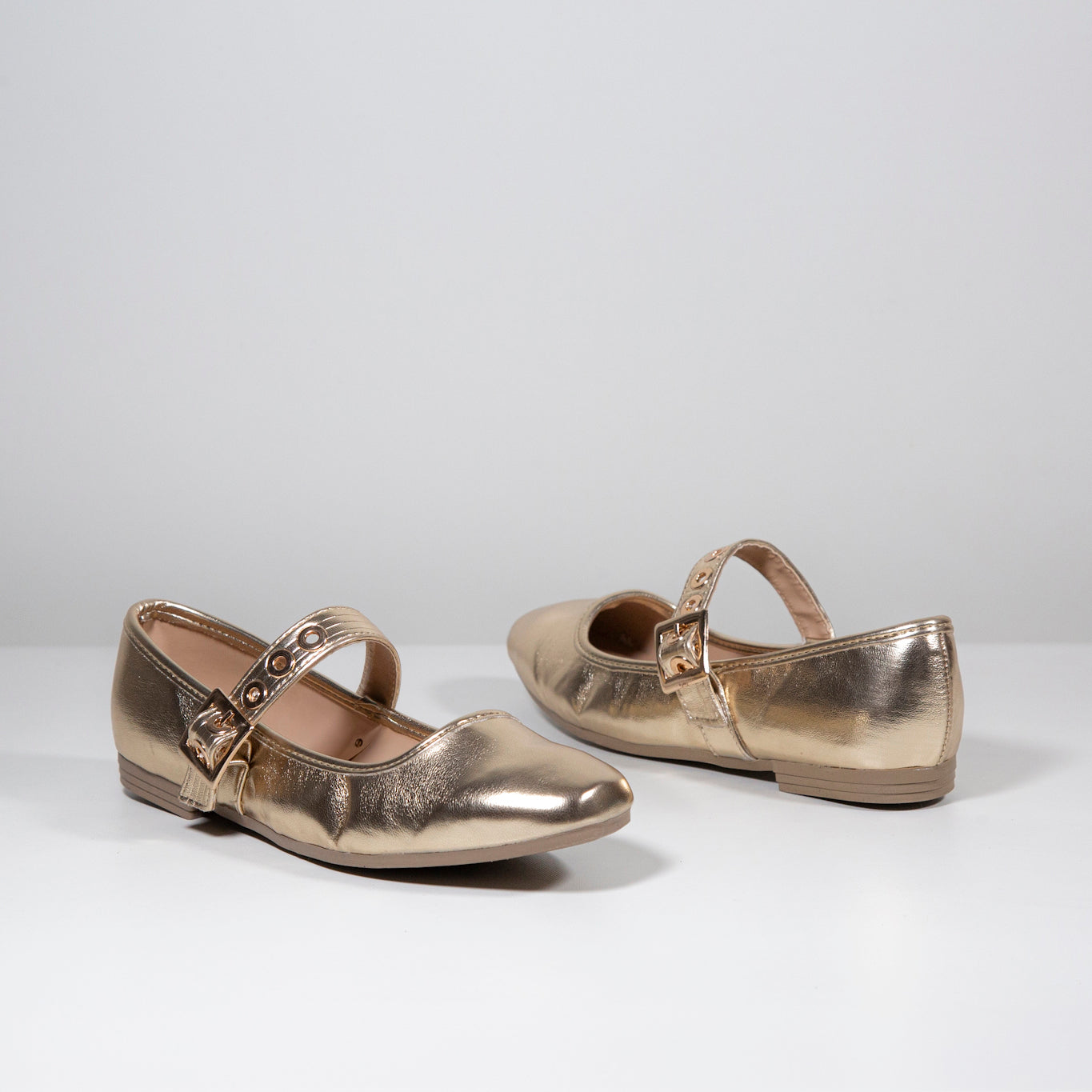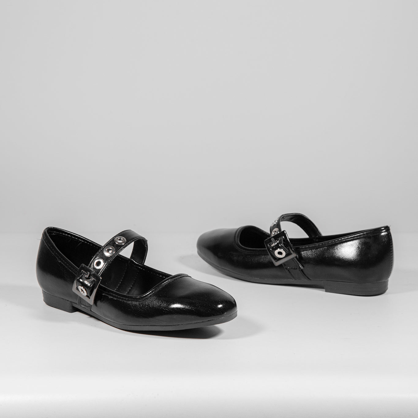 Balerina para dama marca Ivi Love en color negro y oro. Con el modelo de plantilla de confort y la tira con hebilla, estos zapatos brindan comodidad y estilo. Su punta redonda y su acabado en piel lisa los hacen perfectos para cualquier ocasión. Disfruta de su diseño elegante y de la sensación de confort que te proporcionarán.