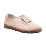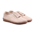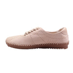 Calzado para dama marca Camina.mx en color beige. Fabricado en piel bovina con forro porcino, este modelo presenta una suela de 2.5 cm con dibujo zigzag para mejor agarre. El diseño incluye perforaciones geométricas laterales para ventilación, costuras visibles en todo el contorno y cordones gruesos trenzados que aportan textura. Plantilla acolchada y acabado mate en tono rosa claro, ideal para uso diario con estilo relajado.