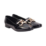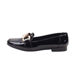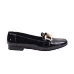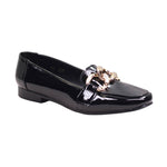 Calzado para dama marca Zócalo en color Negro charol, Diseño moderno y cómodo, cuenta con eslabones dorados de adorno y una suela ligera, este modelo te permite la comodidad que necesitas en un calzado.