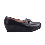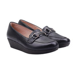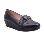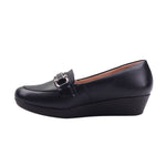 Destaca una hebilla metálica decorativa en el empeine, que aporta carácter al diseño sin interferir con el calce. La plantilla de confort acolchada está pensada para largas jornadas, mientras que la punta redonda suaviza el perfil del zapato. La suela corrida de goma negra complementa el diseño con discreción.