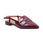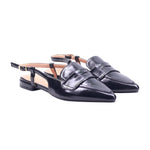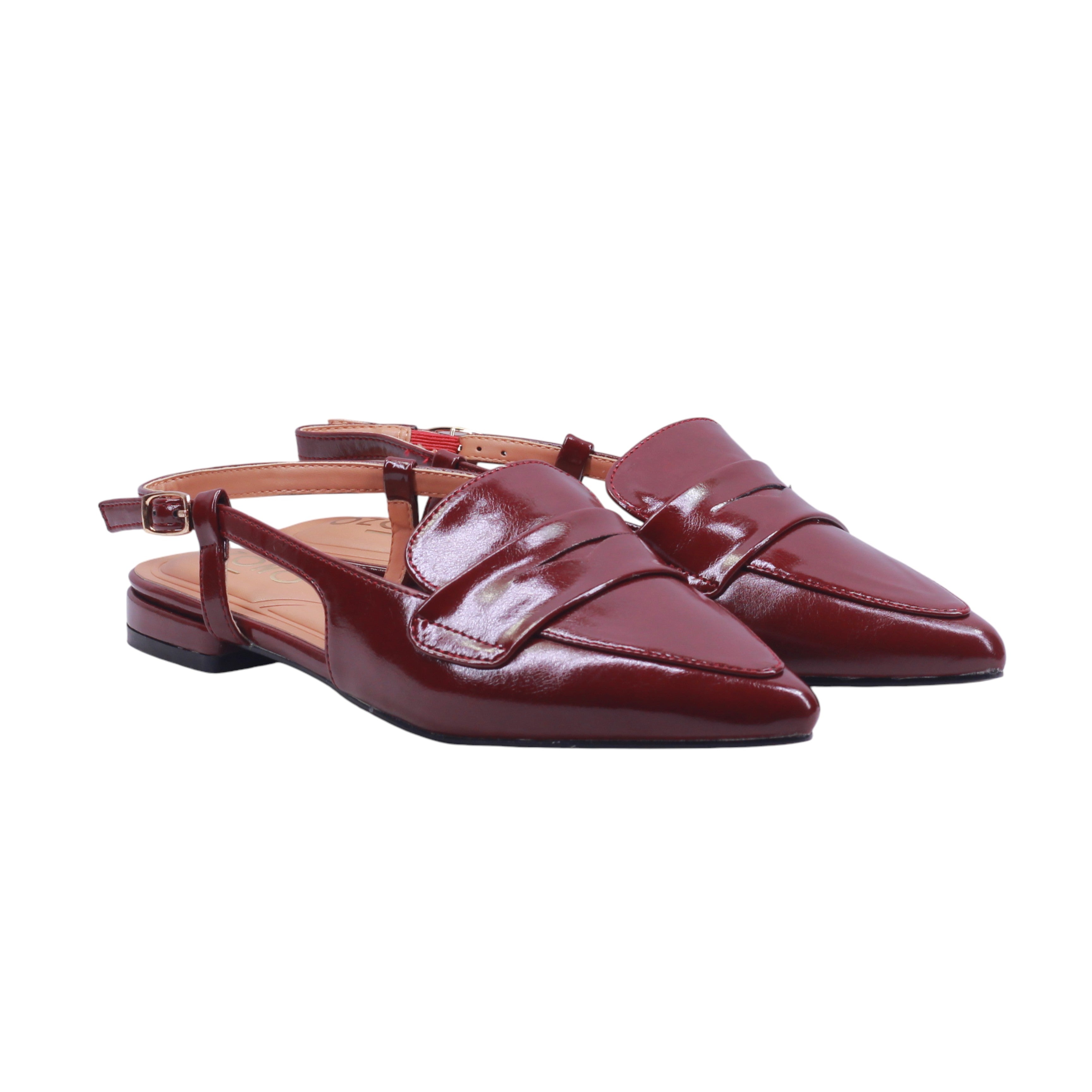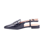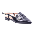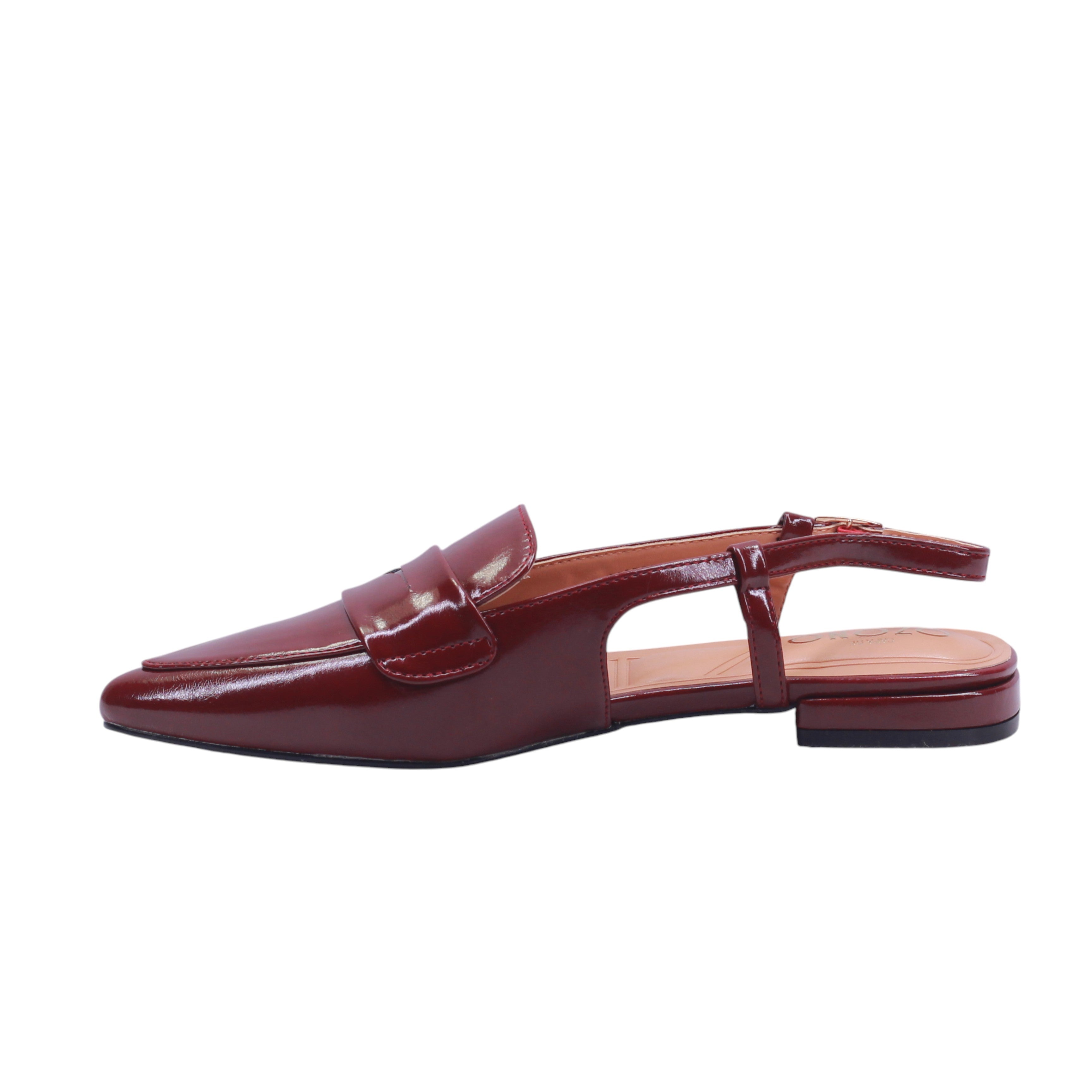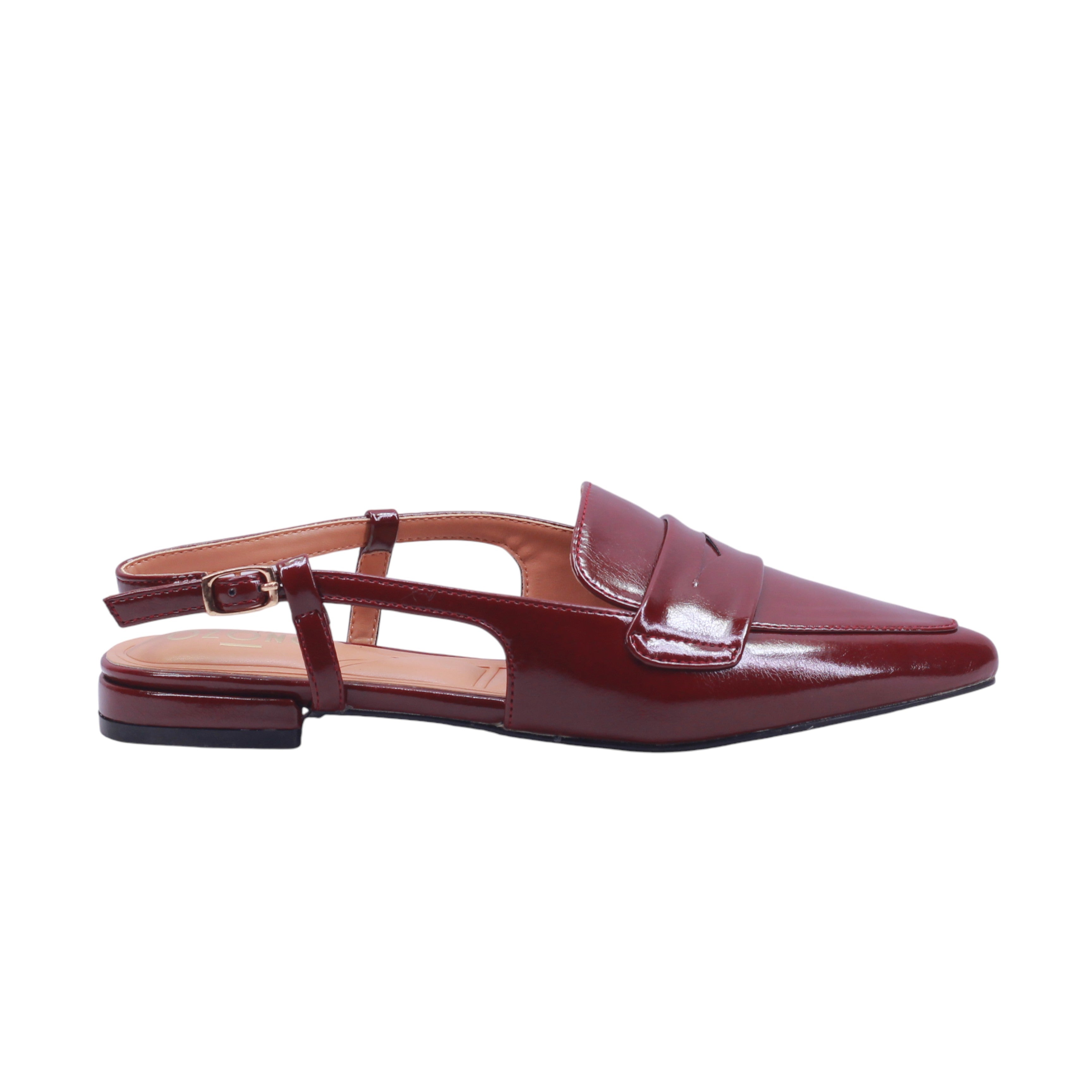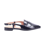 La silueta presenta punta fina y acabado acharolado en tono negro, aportando sofisticación. El empeine tipo mocasín incluye una banda decorativa que refuerza el estilo clásico, mientras que la estructura abierta en el talón lo convierte en una opción ideal para climas cálidos o transiciones entre temporadas.