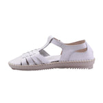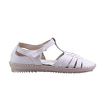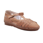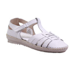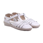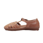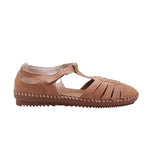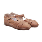 Huarache para dama marca Camina.mx en colores cuoio y blanco. Fabricada en piel vacuna con forro porcino, esta sandalia presenta suela plana de 2.5 cm con textura antiderrapante. El frente cerrado está formado por tiras entrelazadas en patrón tipo trenzado, mientras el ajuste al tobillo se realiza con velcro sobre tira tipo T. Costuras visibles y diseño estructurado que combina seguridad, frescura y estilo artesanal.