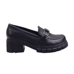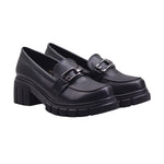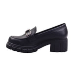 Calzado para dama marca Zócalo en color negro. Este mocasín negro ofrece una combinación perfecta de elegancia y estabilidad. Su tacón ancho de 5.00 cm proporciona una elevación cómoda y segura, ideal para jornadas largas sin sacrificar el estilo. El corte acharolado aporta un acabado brillante y moderno, mientras que el adorno metálico en el empeine añade un toque distintivo y refinado. Su diseño estructurado y su suela firme lo convierten en una excelente opción para looks ejecutivos, eventos formales o atuendos urbanos con carácter. Un calzado versátil que equilibra moda y funcionalidad.