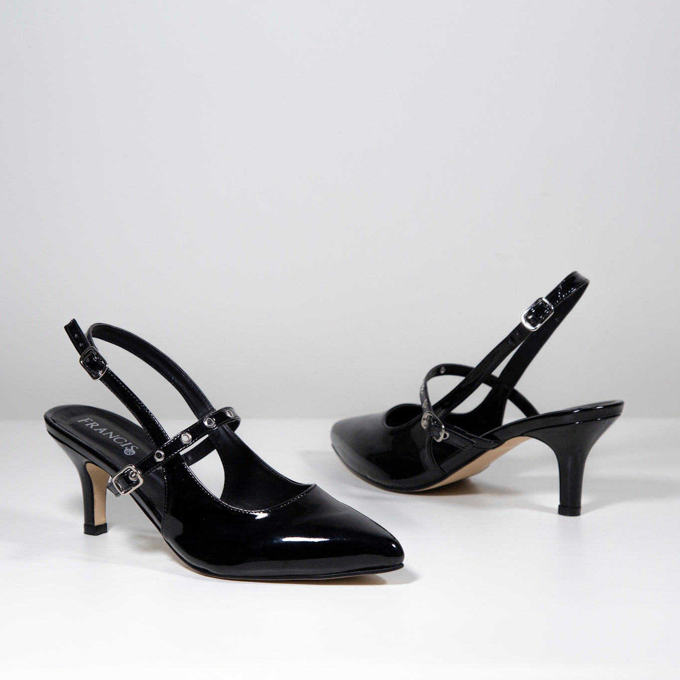 Zapatilla para dama de la marca Francis en colores came y negro. Este modelo de tacón de 6.00 cm de altura es elegante y versátil. Su diseño destalonado con tira delgada y hebilla proporciona un ajuste cómodo y estilizado. Además, cuenta con acabado en piel lisa, añadiendo un toque sofisticado a tu look.