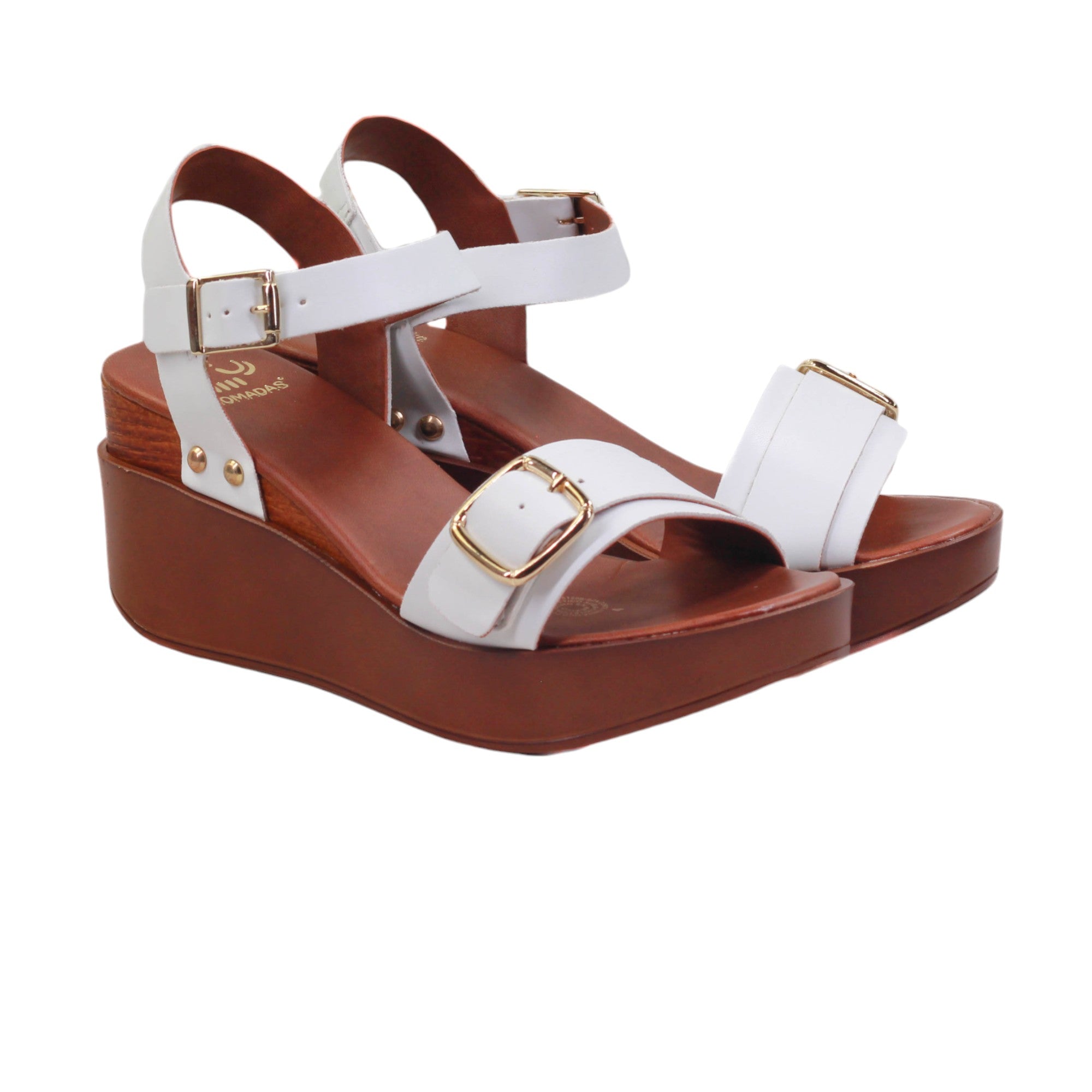 Sandalia para dama marca Nómadas en colores blanco y coñac, es un modelo de plataforma alta con platilla sobresaliente de la misma plataforma, lo cual te da más altura. Es una sandalia de Confort que te proporciona un calce perfecto y te brindará comodidad y estilo en cada paso.
