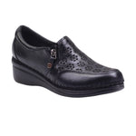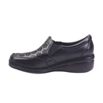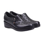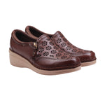 Calzado para dama marca Lobo Solo en colores Caoba y negro. Este zapato casual está elaborado en piel vacuno con elegante diseño troquelado floral que permite mayor frescura. Su interior forrado en textil proporciona suavidad al contacto con el pie. Ideal para el uso diario gracias a su suela ligera y cómoda con plataforma de 4.00 cm que brinda estabilidad y confort prolongado. El detalle lateral metálico y la costura visible le dan un toque artesanal muy especial.