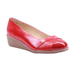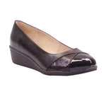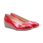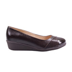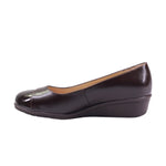 Calzado para dama marca Capricho en colores brown y red. Este zapato fusiona sofisticación y confort en cada detalle. Elaborado en piel vacuna color café oscuro, su diseño presenta un elegante contraste entre el cuerpo de acabado ligeramente texturizado y la punta en charol brillante, que añade un toque refinado y moderno.