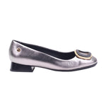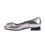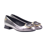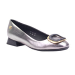 Calzado para dama marca Manet Moda en color inox. Zapato femenino con corte de piel vacuna y forro porcino, ideal para ocasiones formales o semi-formales. Su tacón cuadrado de 2.00 cm brinda comodidad y estabilidad, mientras que el acabado metálico en tono plata le da un toque moderno y elegante. El adorno frontal en forma de hebilla dorada con centro negro resalta sobre la punta redonda, aportando distinción al diseño. El interior en tono oscuro y el pequeño emblema metálico lateral complementan un estilo refinado, perfecto para combinar con vestidos, trajes o conjuntos de oficina.