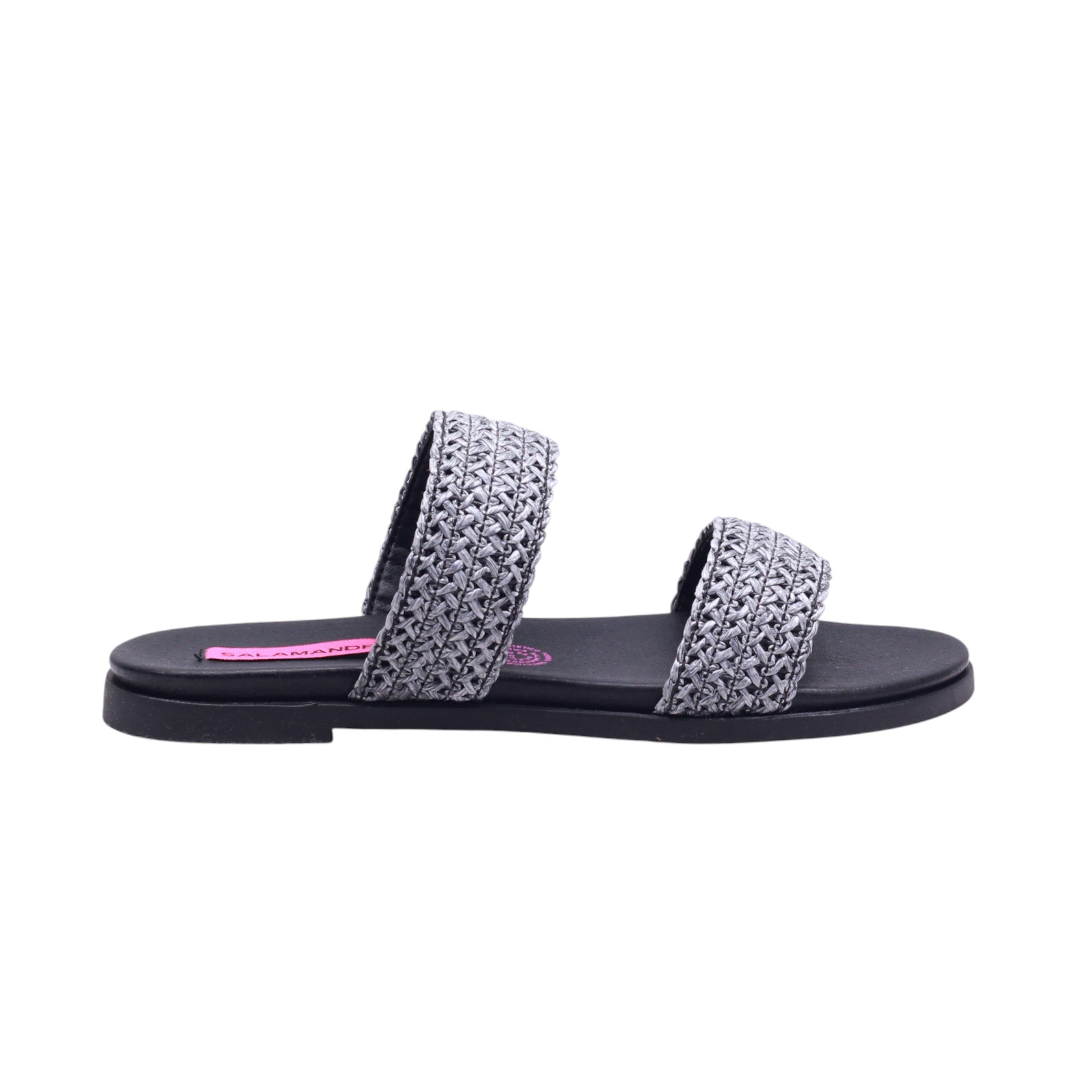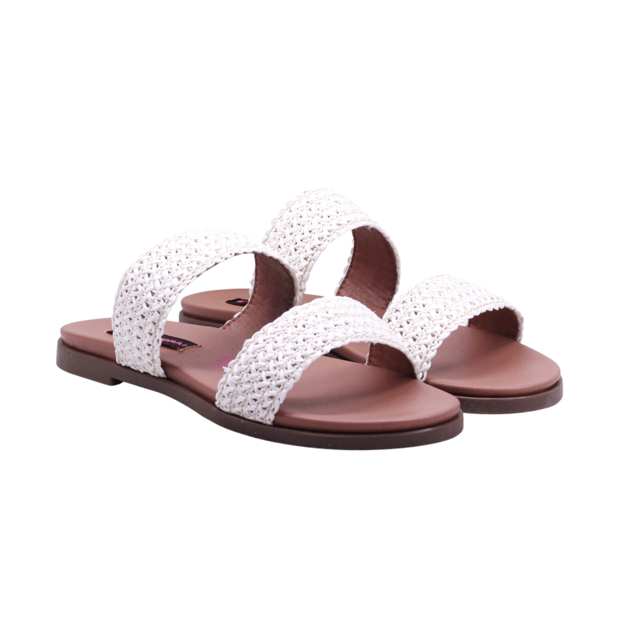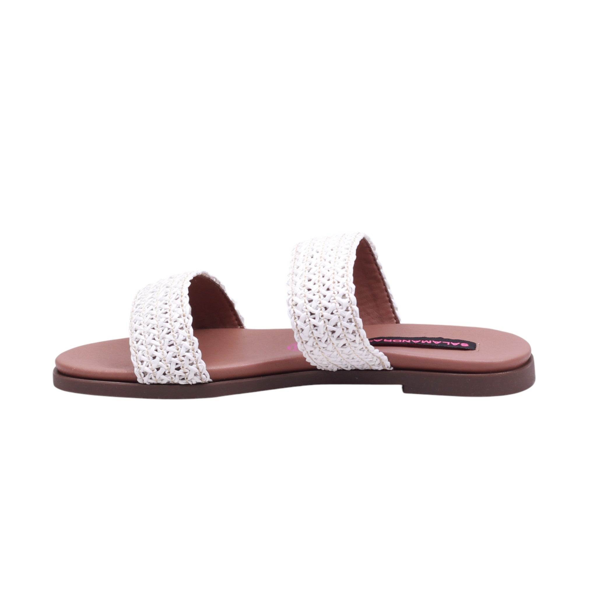 Sandalia de dama elaborada con corte y forro artificial. Su diseño abierto con punta descubierta incluye doble tira ancha sobre el empeine con terminado trenzado que aporta textura y estilo artesanal.