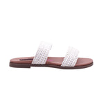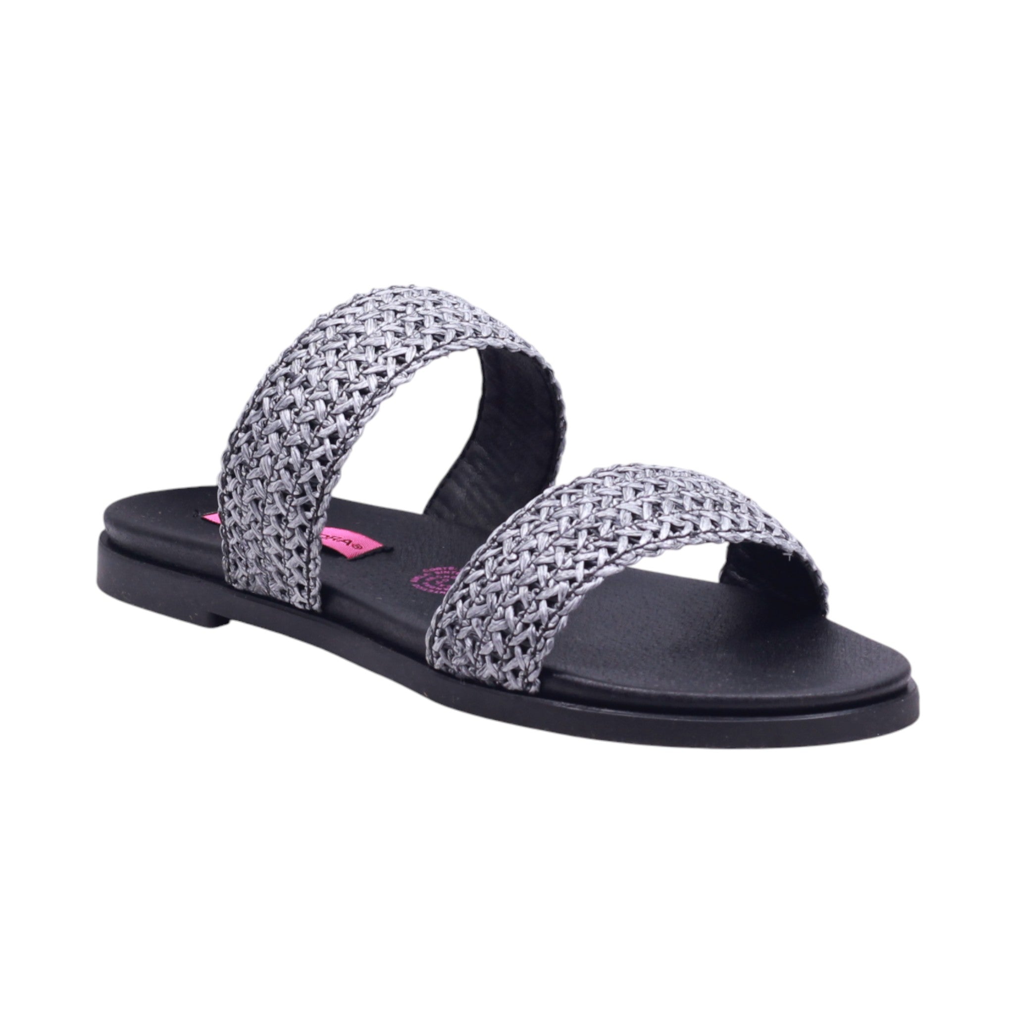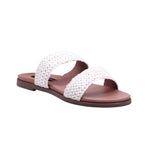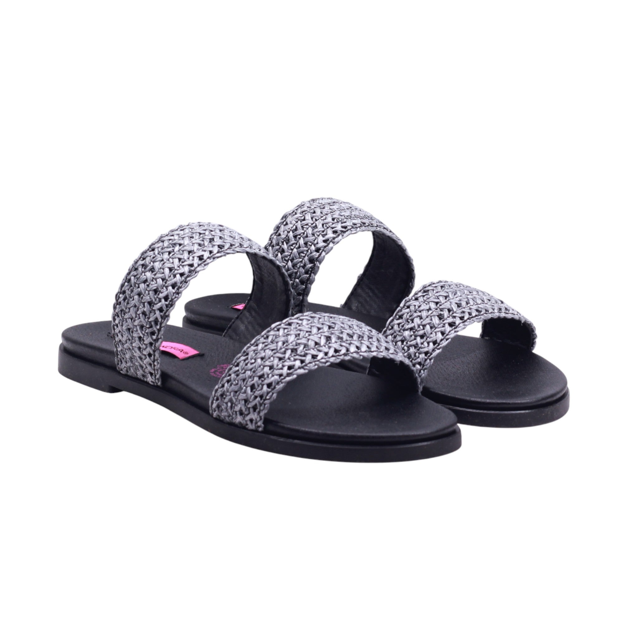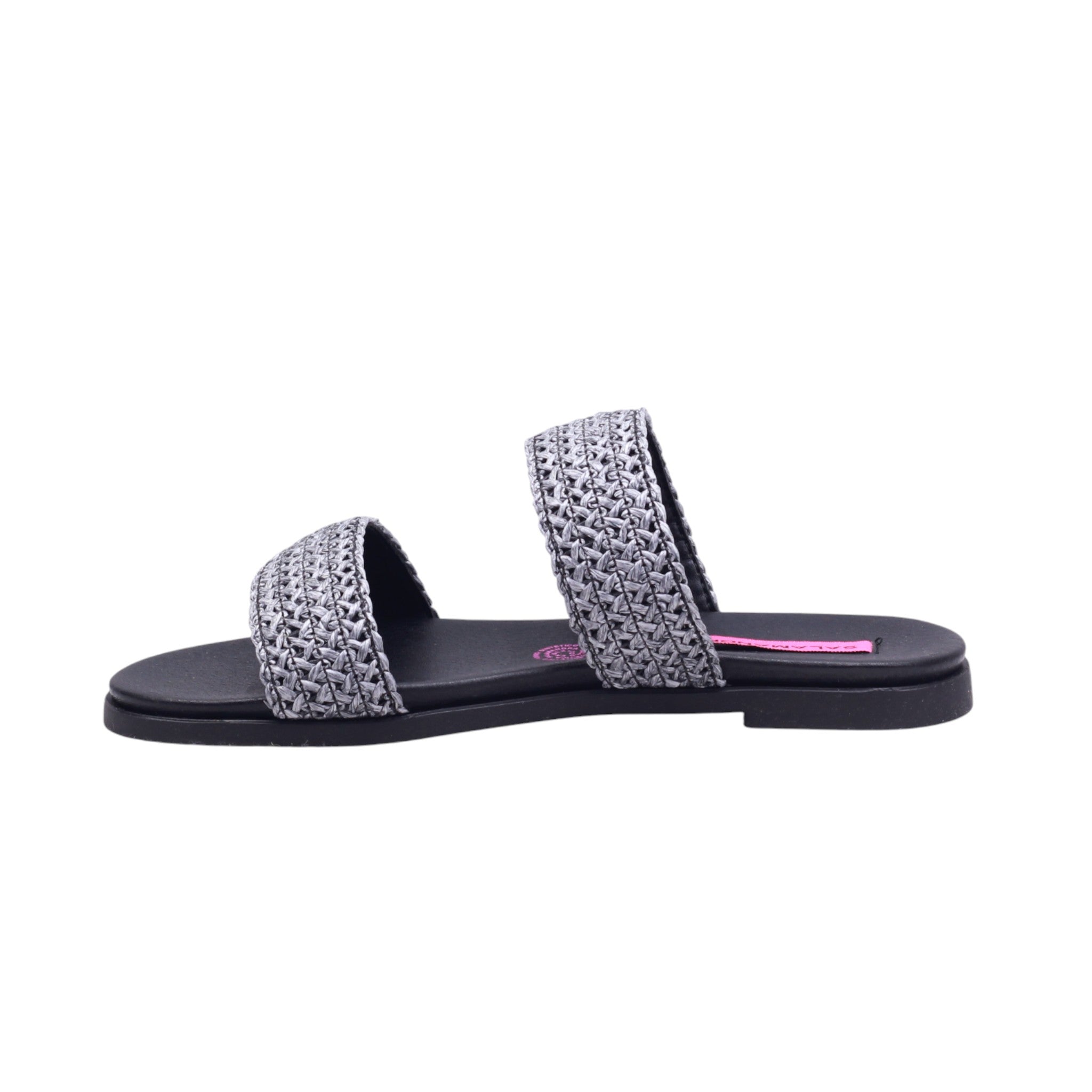 Sandalia de dama elaborada con corte y forro artificial. Su diseño abierto con punta descubierta incluye doble tira ancha sobre el empeine con terminado trenzado que aporta textura y estilo artesanal.