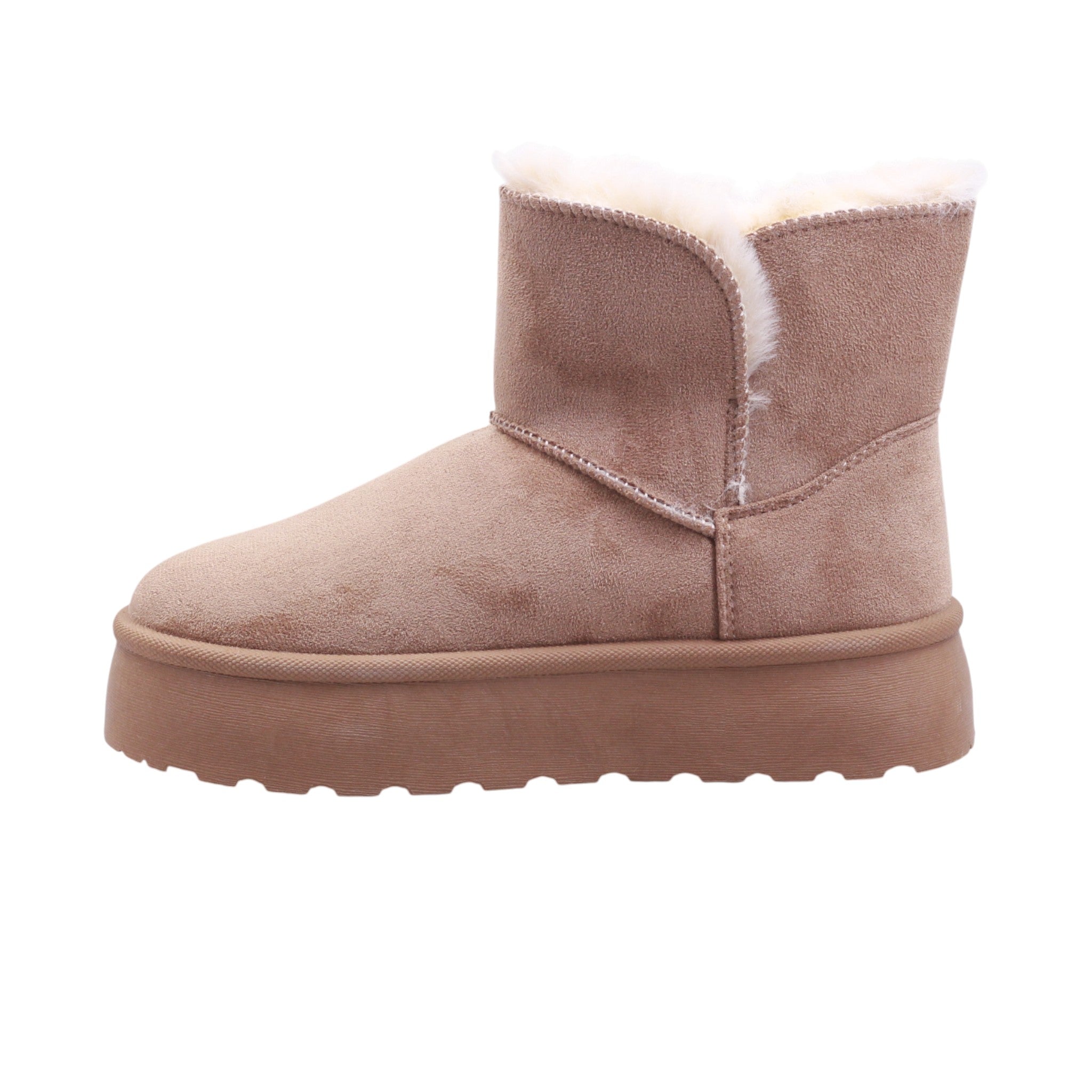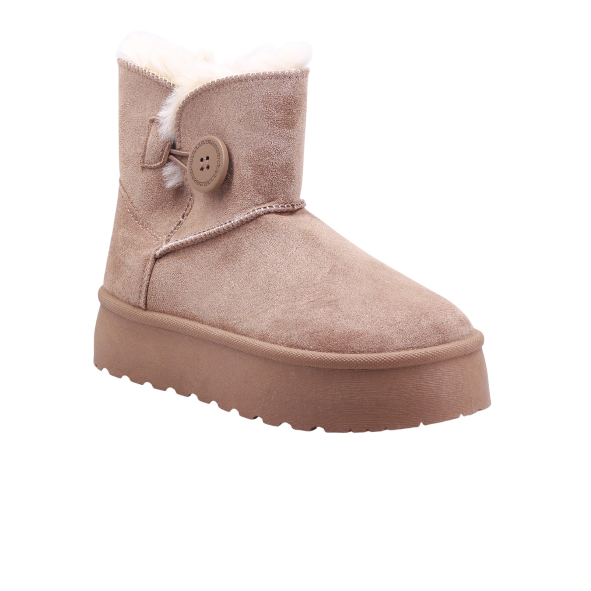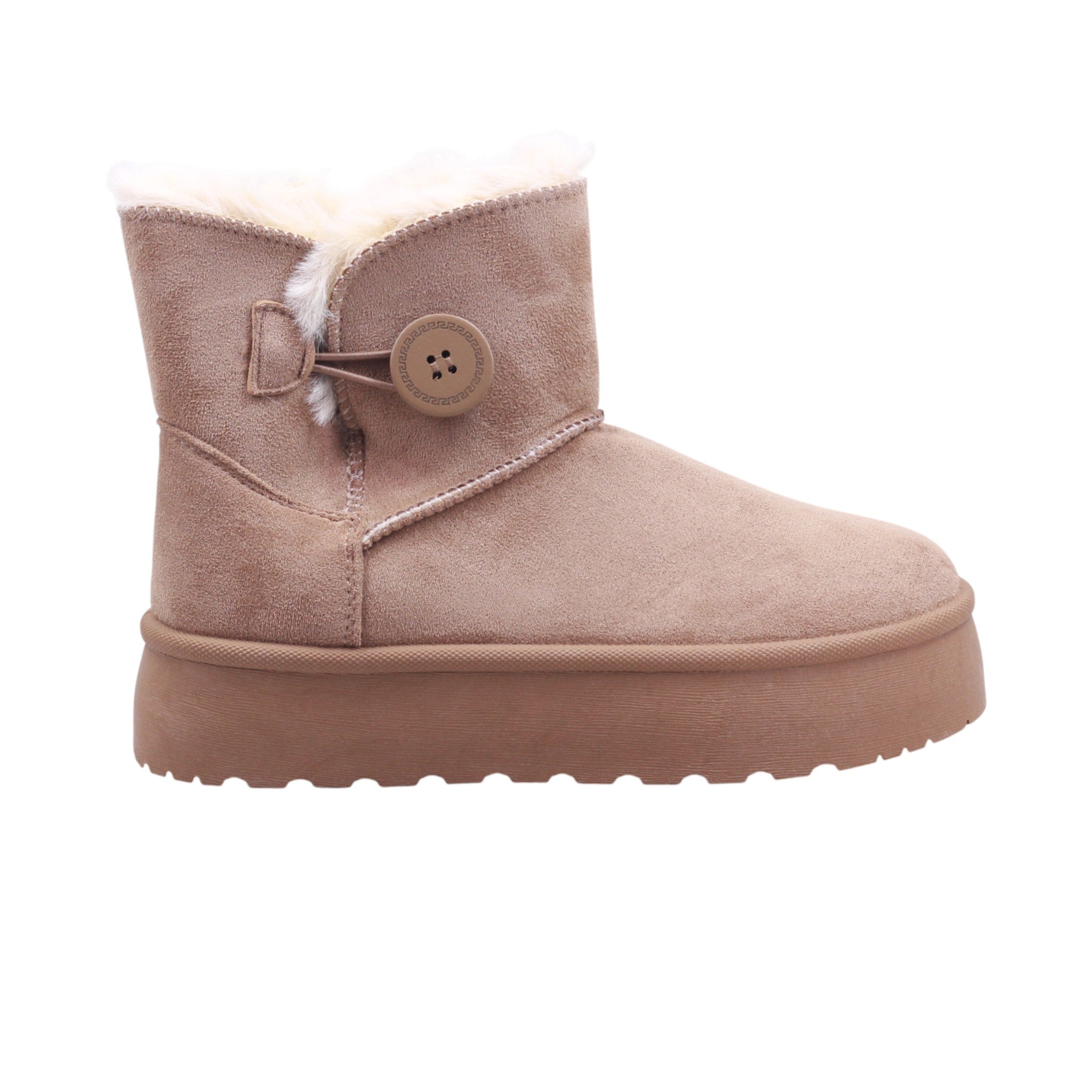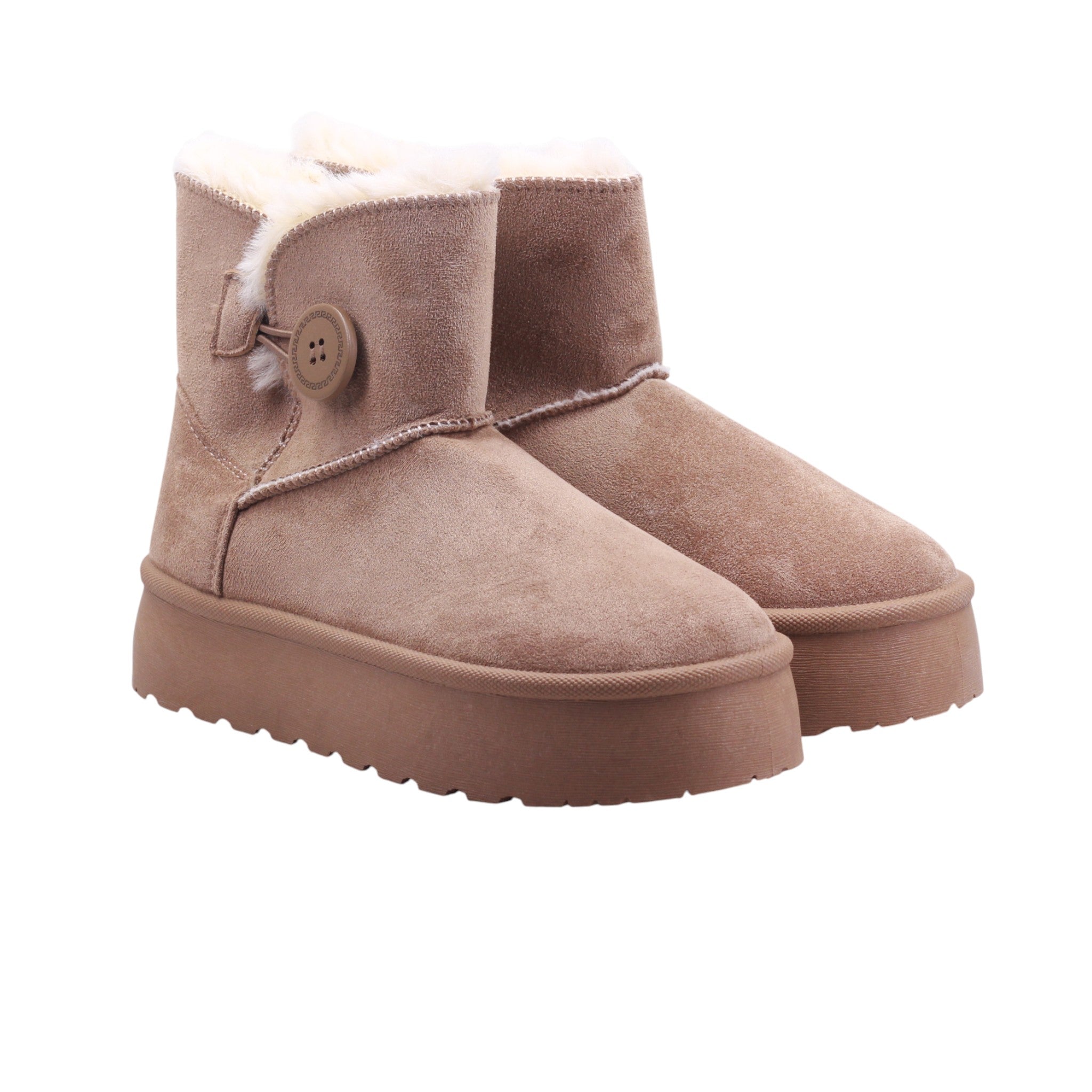 Bota para dama marca Berlin en color taupe. Modelo de corte y forro textil, diseñada para brindar abrigo y comodidad en temporada fría. Su interior está completamente forrado con peluche suave, ideal para mantener el calor en climas bajos. La suela de 4.00 cm con diseño antiderrapante ofrece buena elevación y tracción, perfecta para uso diario. El exterior tipo gamuza en tono camel se complementa con un botón decorativo lateral, unido por una tira textil que añade un toque artesanal y femenino. El tubo de altura media cubre el tobillo y parte de la pantorrilla, ofreciendo protección térmica sin sacrificar estilo. Ideal para looks casuales, acogedores y funcionales.