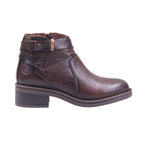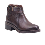 Botín para dama marca Lobo Solo en colores negro y cocoa. Este botín negro está confeccionado en piel vacuna de acabado liso, ofreciendo durabilidad y una estética sofisticada. Su interior con forro textil proporciona comodidad y transpirabilidad para el uso prolongado. El diseño incluye un fajillo decorativo con hebilla metálica en la parte superior del tubo, que añade carácter y un toque moderno al modelo.