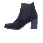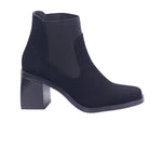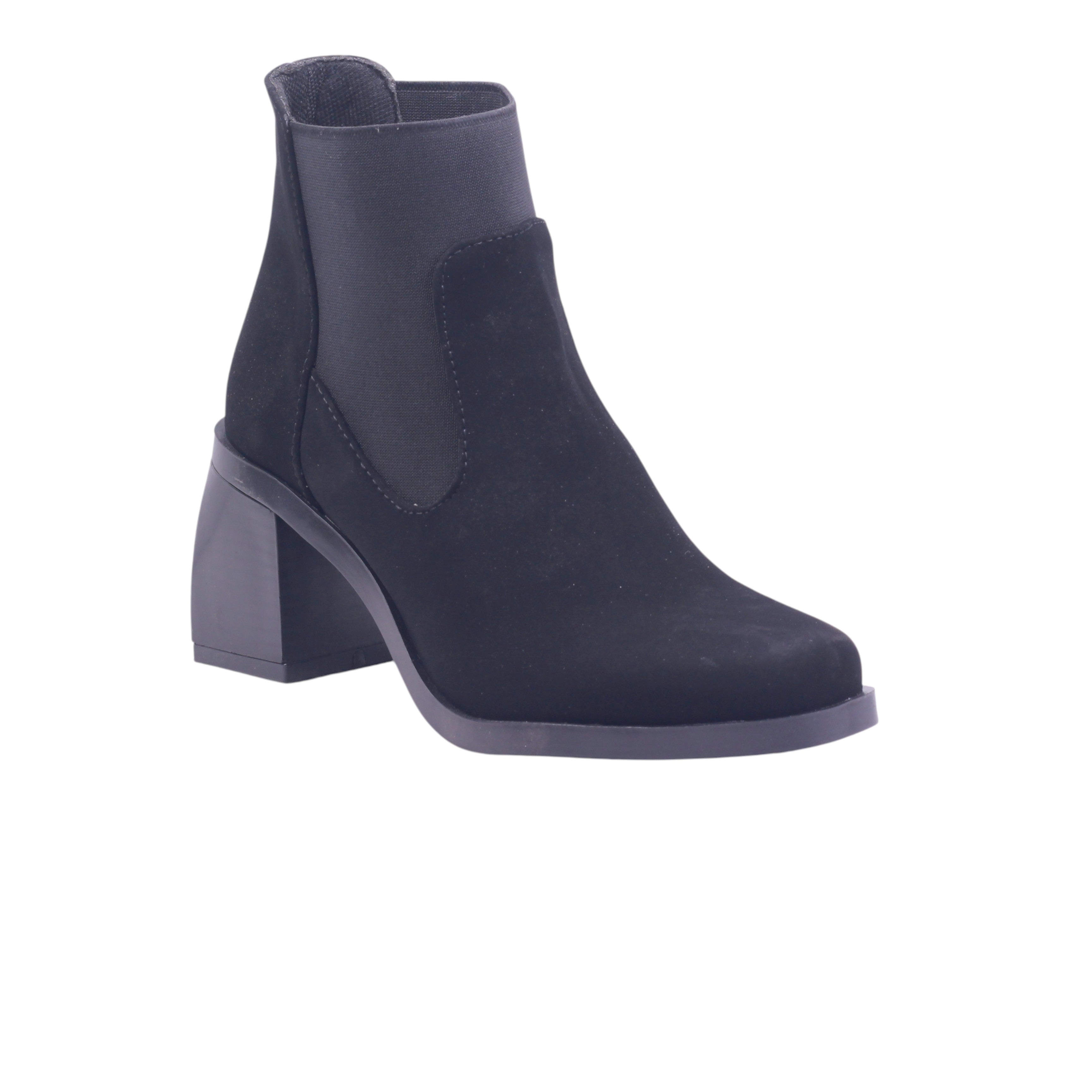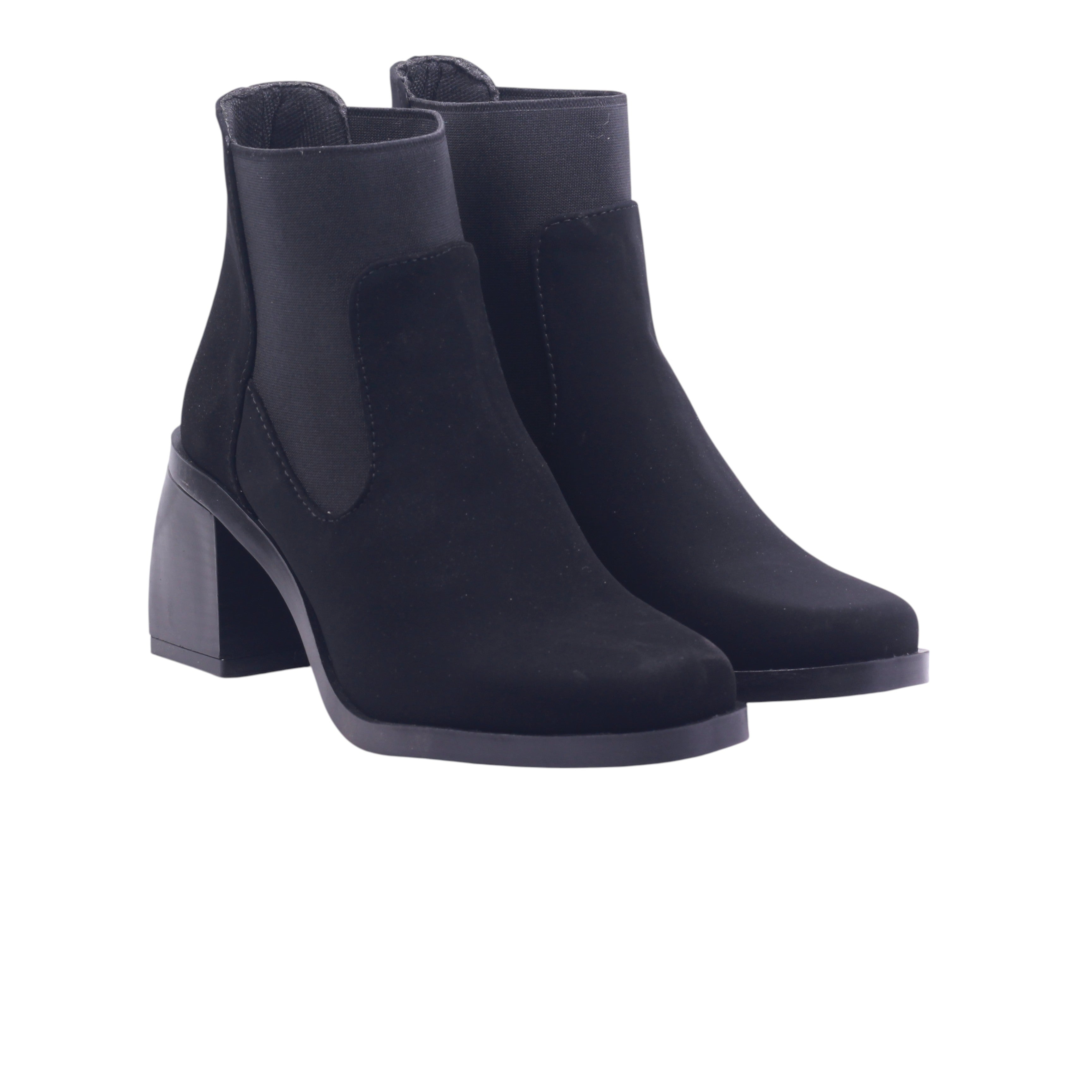 Botín para dama marca Glynn en color negro. Moderno botín de corte y forro artificial con acabado tipo nobuck que aporta textura elegante. Su diseño incluye elástico lateral para un ajuste cómodo y práctico, tubo de 11.5 cm que estiliza el tobillo y tacón de 7.00 cm que brinda altura con estabilidad. Ideal para combinar con looks casuales o semi-formales en temporada fresca.