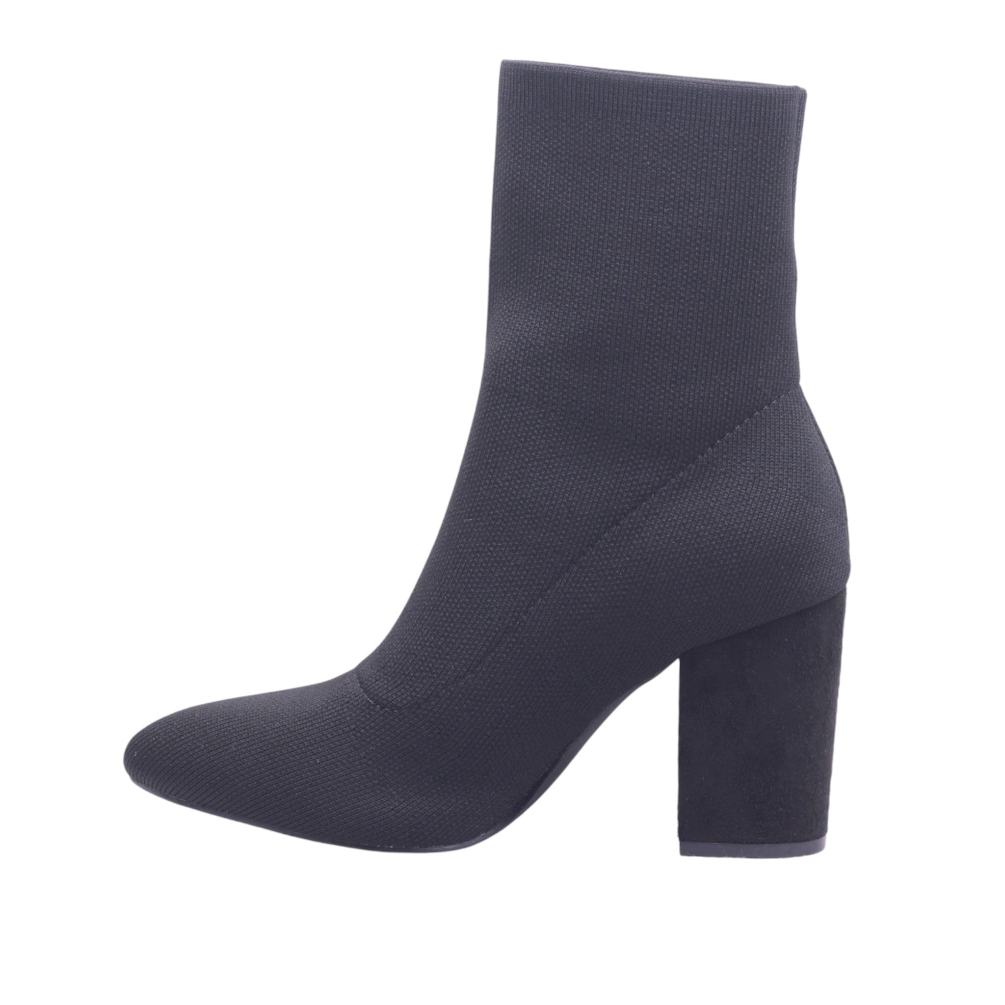 Botín para dama marca Berlin en color negro. Botín de corte y forro textil, con silueta estilizada y moderna. Su diseño tipo calcetín se ajusta al tobillo con suavidad, ofreciendo un calce firme y elegante. El tacón de 8.00 cm tipo bloque aporta altura con estabilidad, ideal para uso prolongado. La punta ligeramente afilada estiliza la figura. El acabado texturizado en tono negro y las costuras limpias refuerzan su estilo minimalista. Perfecto para looks formales, urbanos o combinaciones con prendas ajustadas.