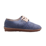 Huarache para dama marca Camina.mx en color azul. Fabricado en piel bovina con forro porcino, este modelo presenta suela de 2.5 cm con dibujo zigzag para mejor agarre. El diseño incluye perforaciones distribuidas en el empeine para ventilación, costuras blancas visibles y cordones beige que contrastan con el acabado mate azul. Ideal para uso diario con estilo relajado y cómodo.