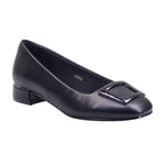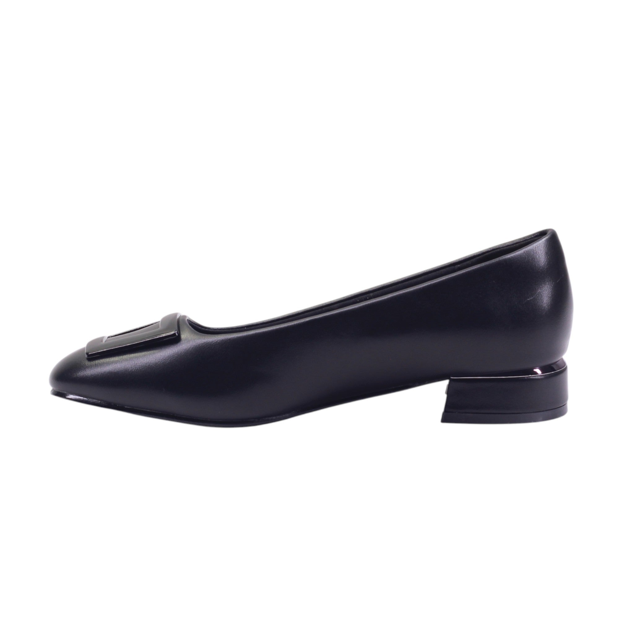 Calzado para dama marca Efe en colores negro y nude. Con corte artificial y forro textil, este modelo presenta diseño cerrado con punta redonda que aporta un aire femenino y atemporal. El adorno cuadrado metálico en el empeine añade un toque sofisticado y el tacón bajo de 2.5 cm ofrece comodidad. Ideal para conjuntos casuales elegantes u ocasiones donde el confort sea prioritario.