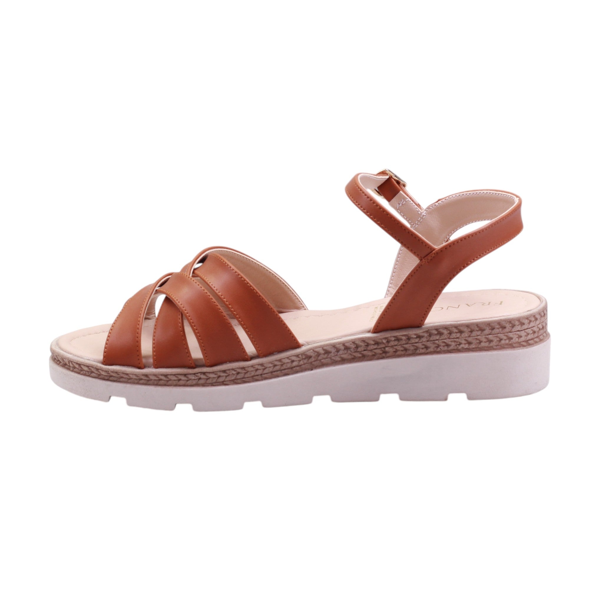Sandalia para dama marca Francis en colores armañac y negro. Diseño fresco con estructura cómoda y detalles artesanales. Esta sandalia está elaborada en piel artificial tanto en el corte como en el forro, con acabado que aporta calidez y versatilidad. El frente presenta un juego de tiras cruzadas que envuelven el empeine con estilo, creando una silueta dinámica y bien equilibrada.