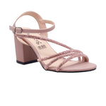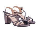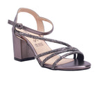 El diseño presenta un acabado metálico con brillo sutil que aporta sofisticación. El frente está compuesto por tiras delgadas que se cruzan sobre el empeine, decoradas con pedrería brillante que añade textura, luz y un toque glamuroso. Estas tiras estilizan el pie y aportan soporte visual sin saturar el diseño.