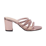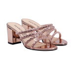 Zapatilla de tacón ancho en tono oro rosado con pedrería decorativa
