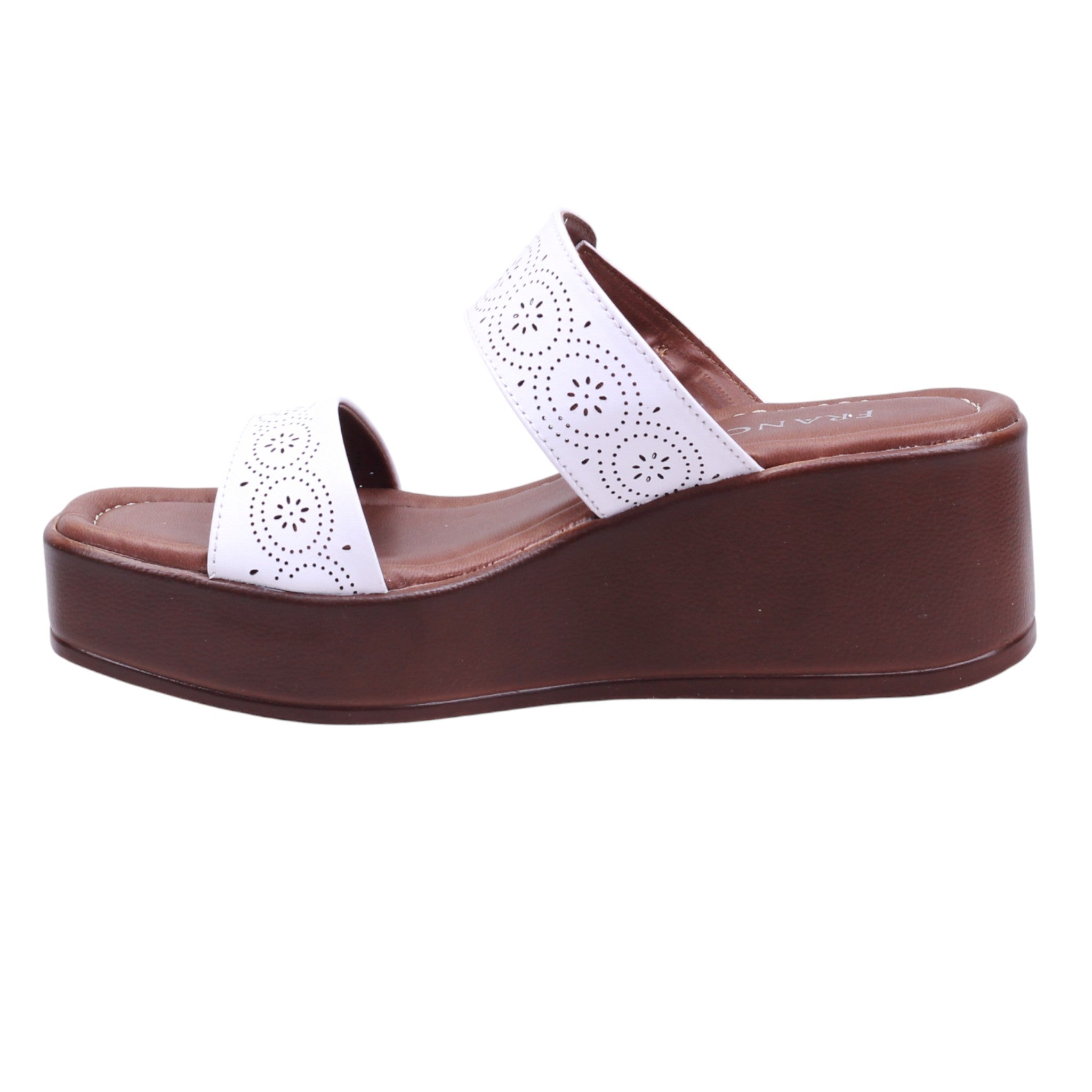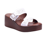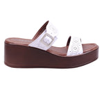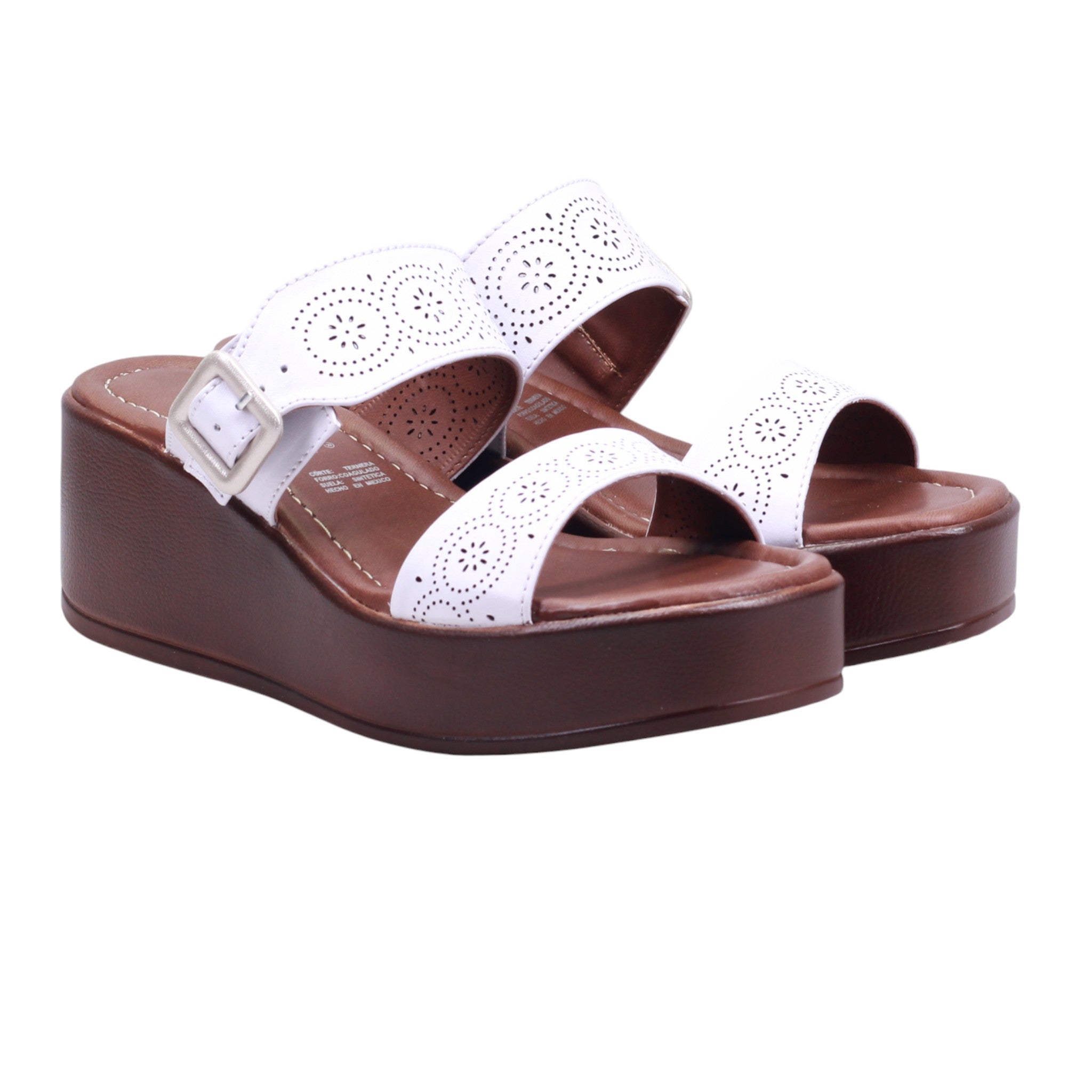 Plataforma para dama marca Francis en color blanco. Modelo con corte y forro artificial, ideal para lucir fresca y cómoda en temporada primavera-verano. El diseño presenta doble tira ancha con perforaciones decorativas, que aporta ventilación y un toque artesanal. La plataforma de 6.0 cm con vista madera estiliza la silueta sin sacrificar estabilidad, mientras que la plantilla acolchada mejora el confort en cada paso. El modelo incluye puntera abierta y ajuste al tobillo con hebilla metálica, que brinda firmeza y seguridad al caminar. Perfecta como sandalia casual con plataforma alta, pensada para combinar con vestidos, pantalones fluidos o conjuntos relajados con aire femenino.