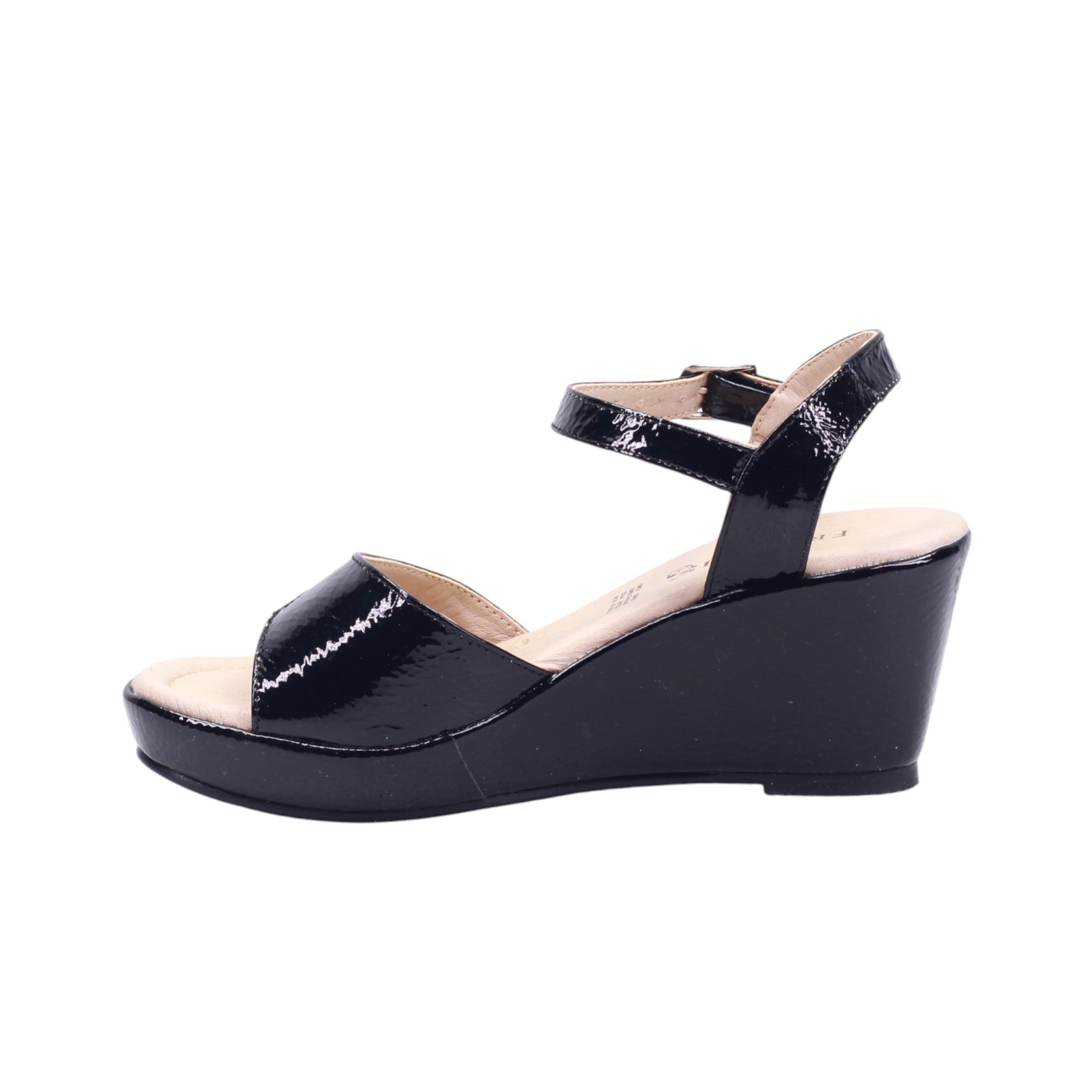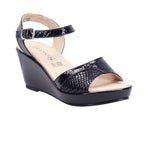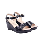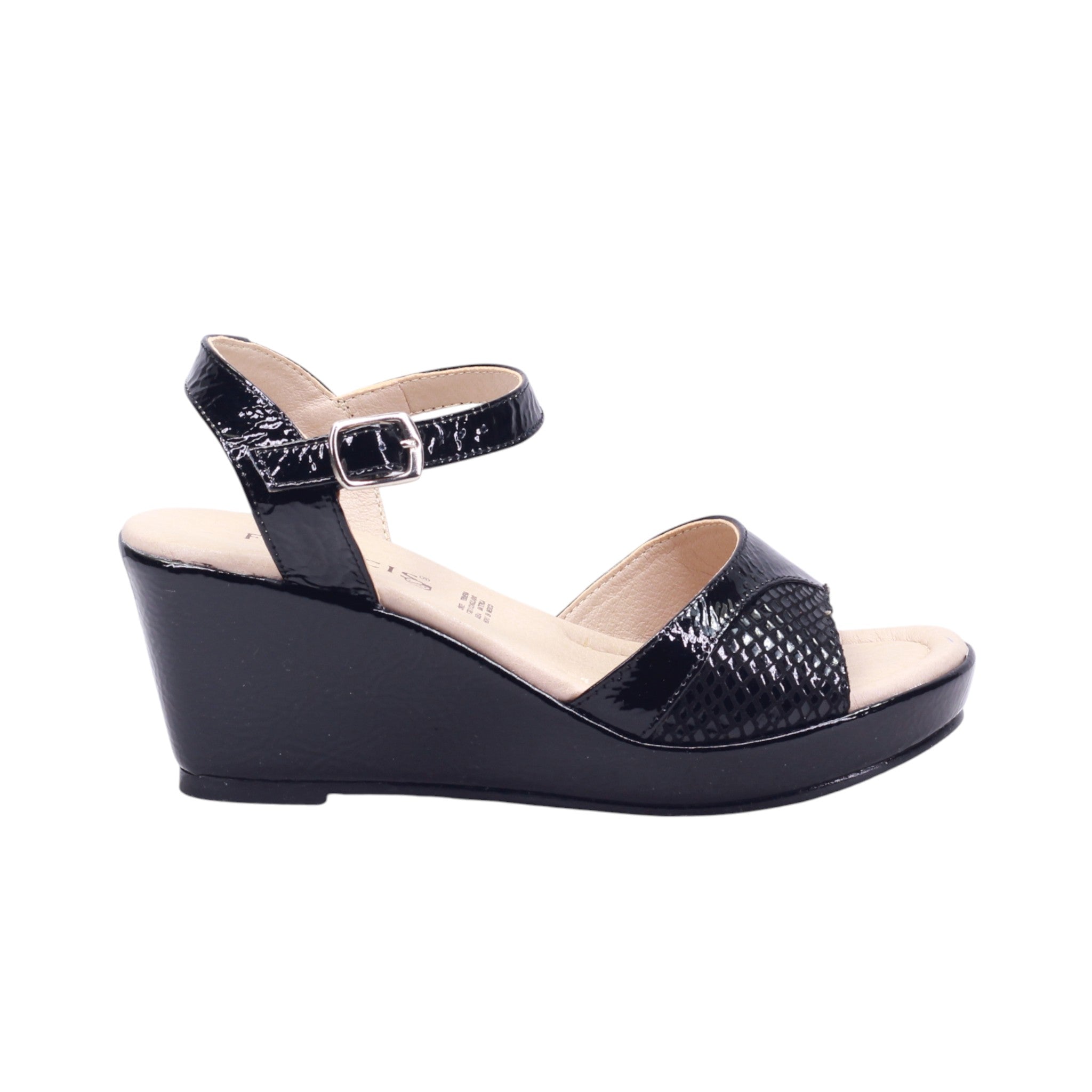 Sandalia para dama marca Francis en colores negro. Sandalia de corte y forro artificial, con plataforma de 7.0 cm, diseñada para brindar altura, estabilidad y estilo en cada paso. El exterior en tono negro presenta acabado brillante con textura en la tira frontal, que aporta contraste visual y un toque moderno. El diseño incluye puntera abierta, tira ancha sobre el empeine y ajuste al tobillo con hebilla metálica plateada, que asegura firmeza al caminar. La planta acolchada en tono beige mejora la comodidad, mientras que la cuña uniforme estiliza la silueta sin sacrificar confort. Ideal para looks casuales, salidas nocturnas o combinaciones urbanas con enfoque sofisticado.