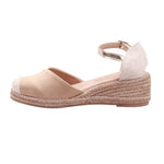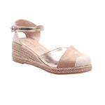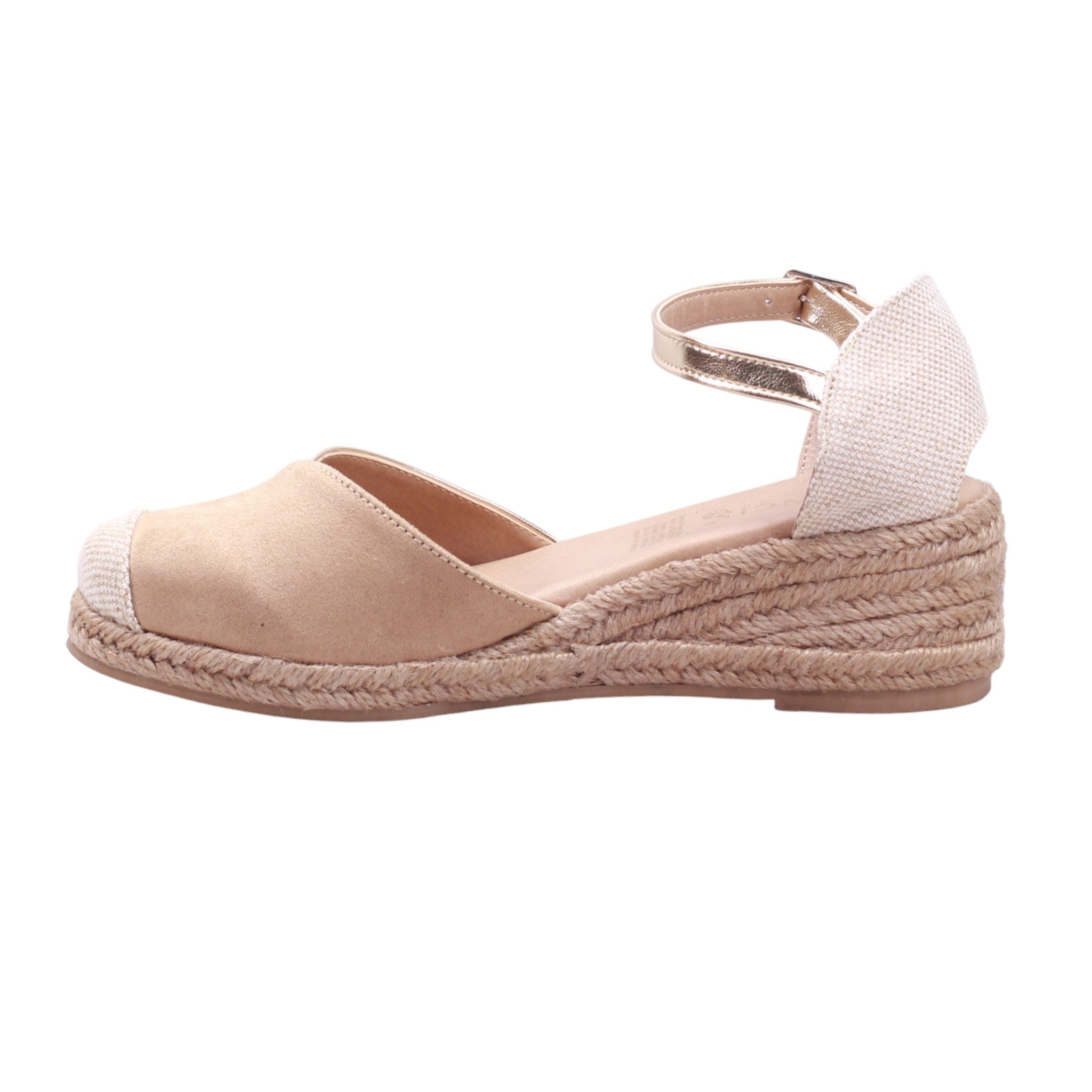 Sandalia tipo alpargata con diseño cerrado al frente, elaborada con corte y forro artificial que brindan estructura ligera y cómoda. La parte frontal combina materiales en acabado tipo gamuza, textil tejido en la puntera y detalles metálicos que aportan contraste y sofisticación. El ajuste al tobillo se realiza mediante una pulsera metálica con hebilla, que además de funcional añade un toque elegante. La plataforma tejida en yute natural tiene una altura de 5.00 cm, ideal para estilizar la figura sin sacrificar estabilidad. El talón está reforzado con textil texturizado que complementa el diseño y proporciona soporte adicional. La suela de goma ofrece buen agarre, haciendo de este modelo una opción fresca y segura para caminar en días calurosos con estilo.