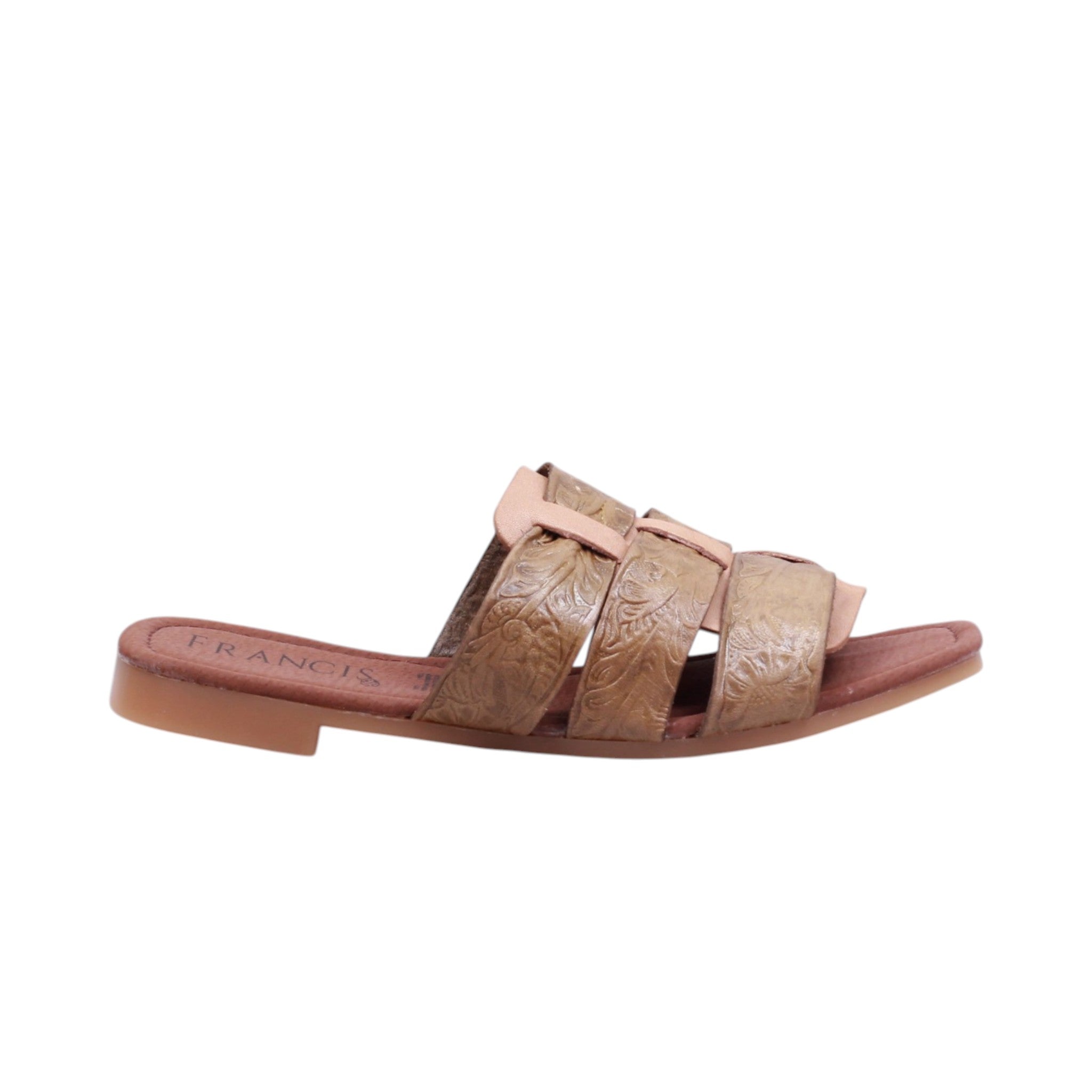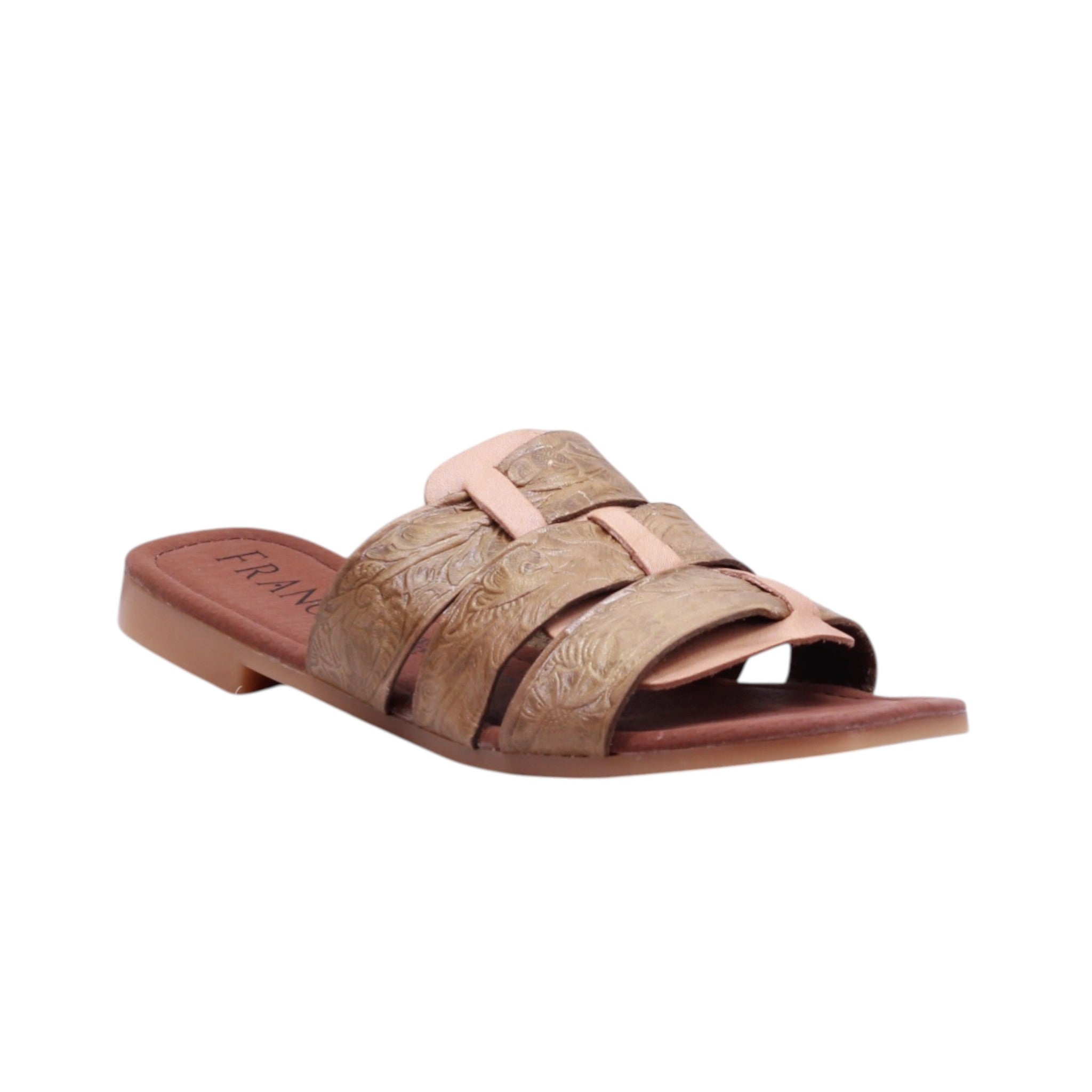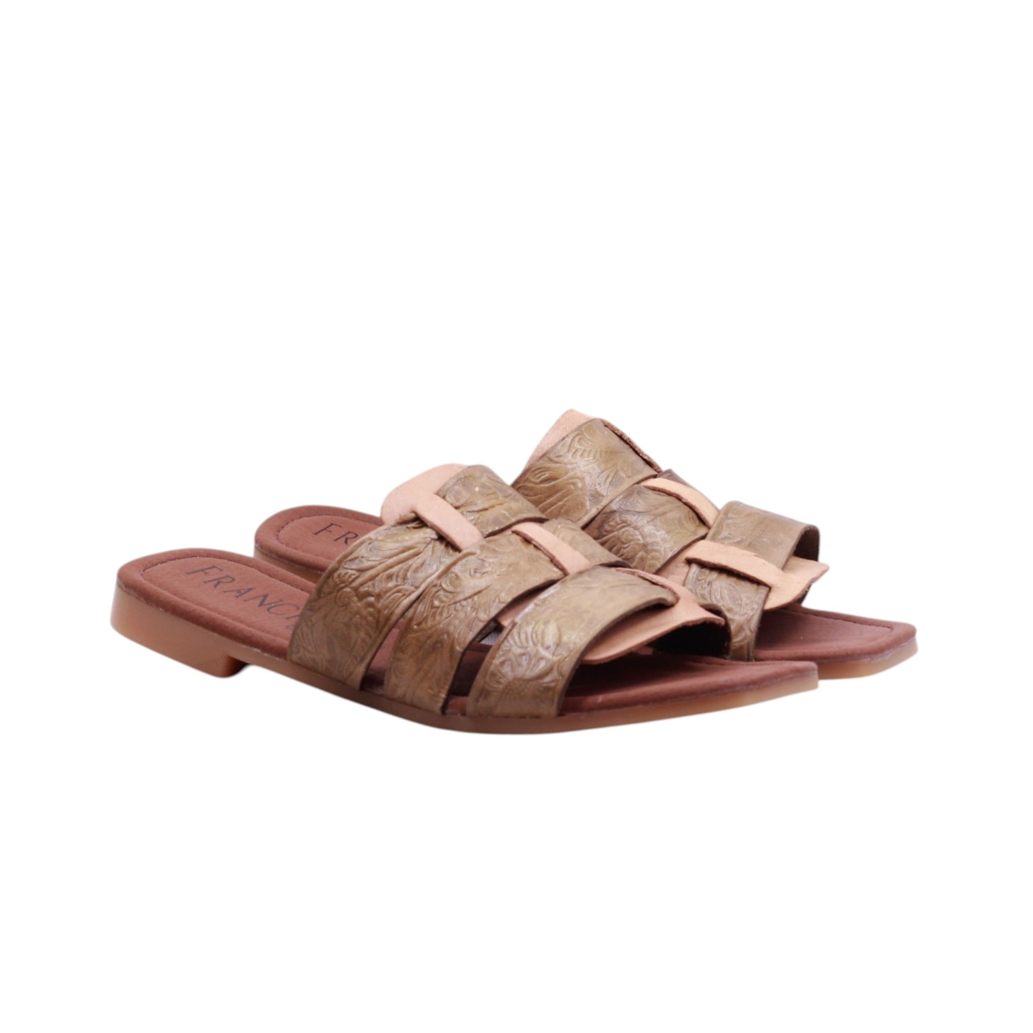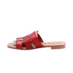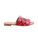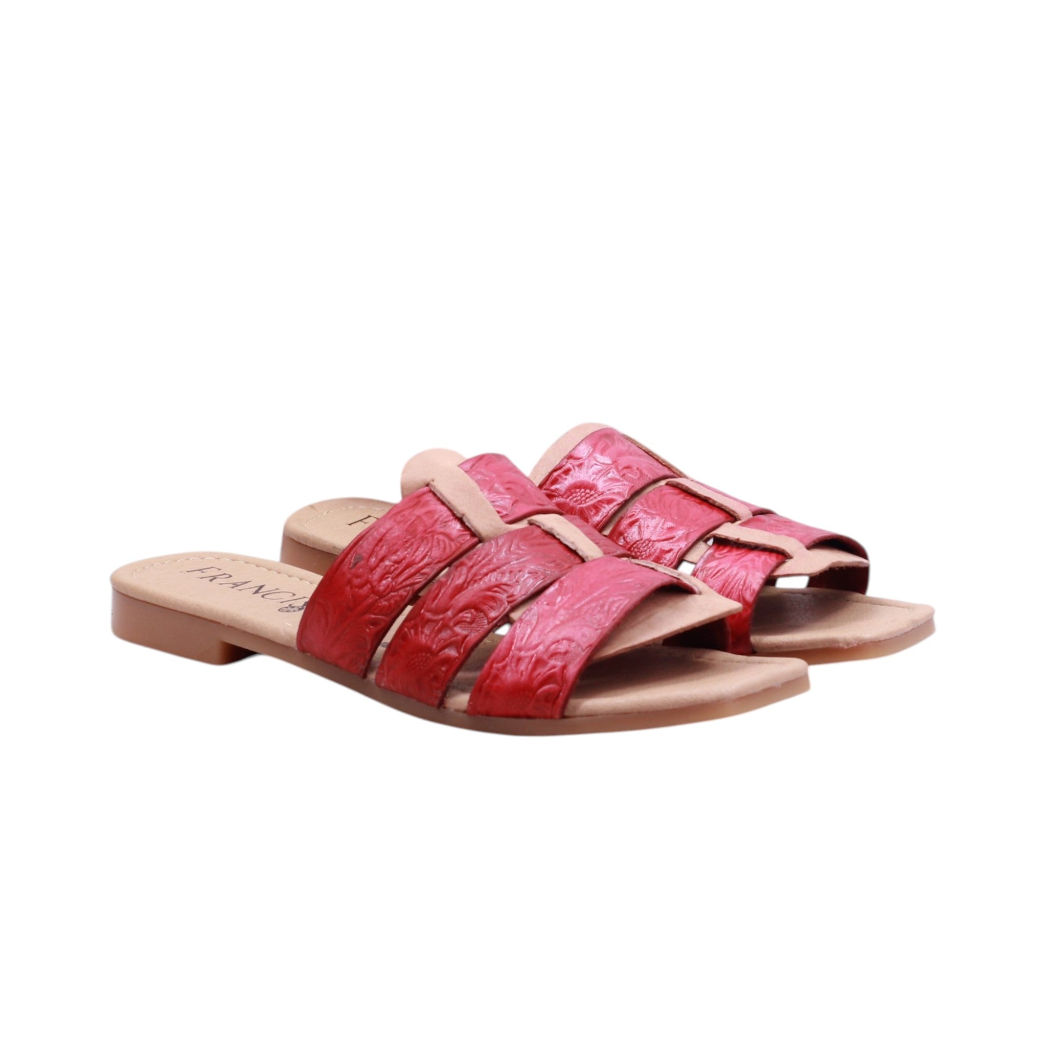 Sandalia de dama elaborada con corte en piel, sin forro y plantilla cómoda. Disponible en colores rojo y verde, cuenta con tacón bajo de 1.0 cm que aporta ligereza y estabilidad. Su diseño incorpora triple tira ancha en el corte, con textura decorativa que realza su estilo artesanal. Además, una tira vertical central conecta las tiras superiores, aportando soporte adicional y un detalle distintivo. El diseño abierto brinda frescura y comodidad, convirtiéndola en un modelo versátil para uso casual con un aire artesanal único.