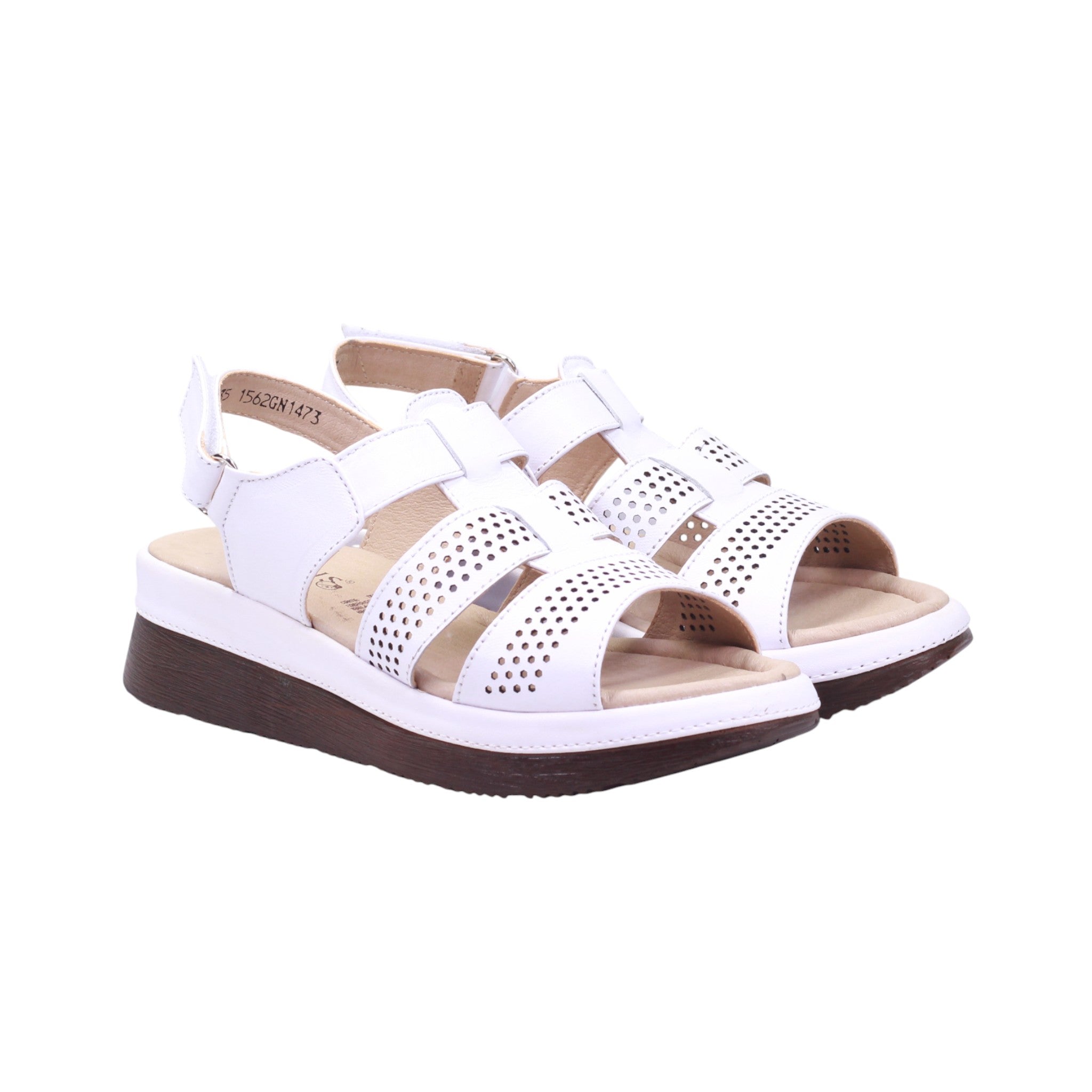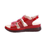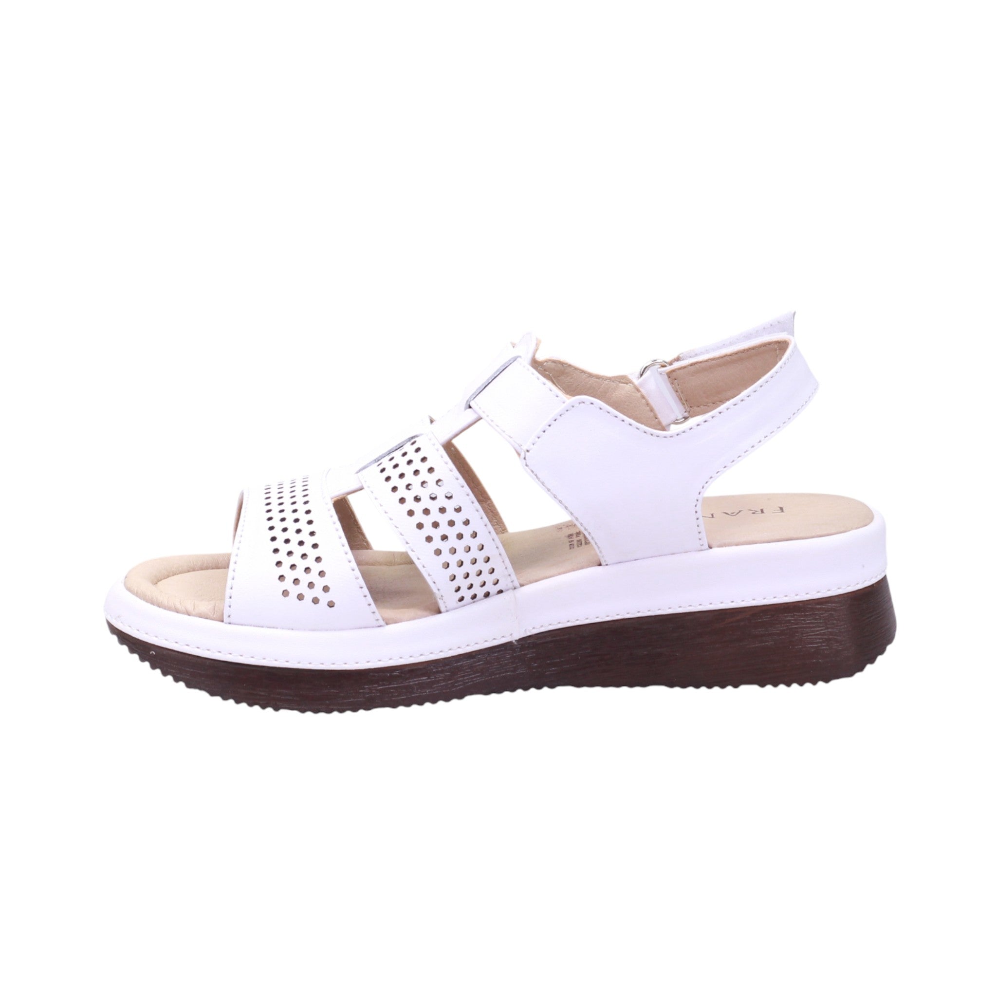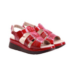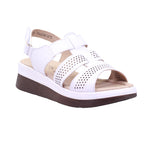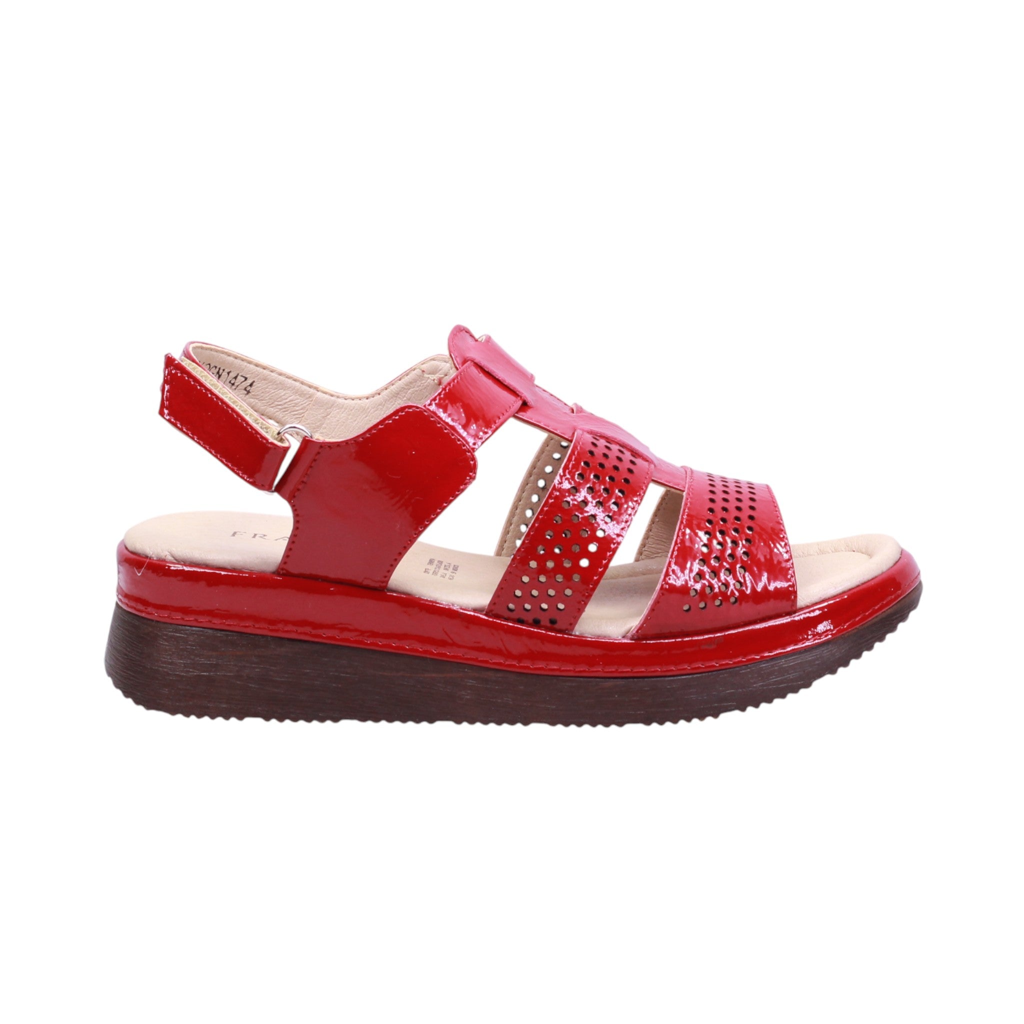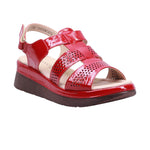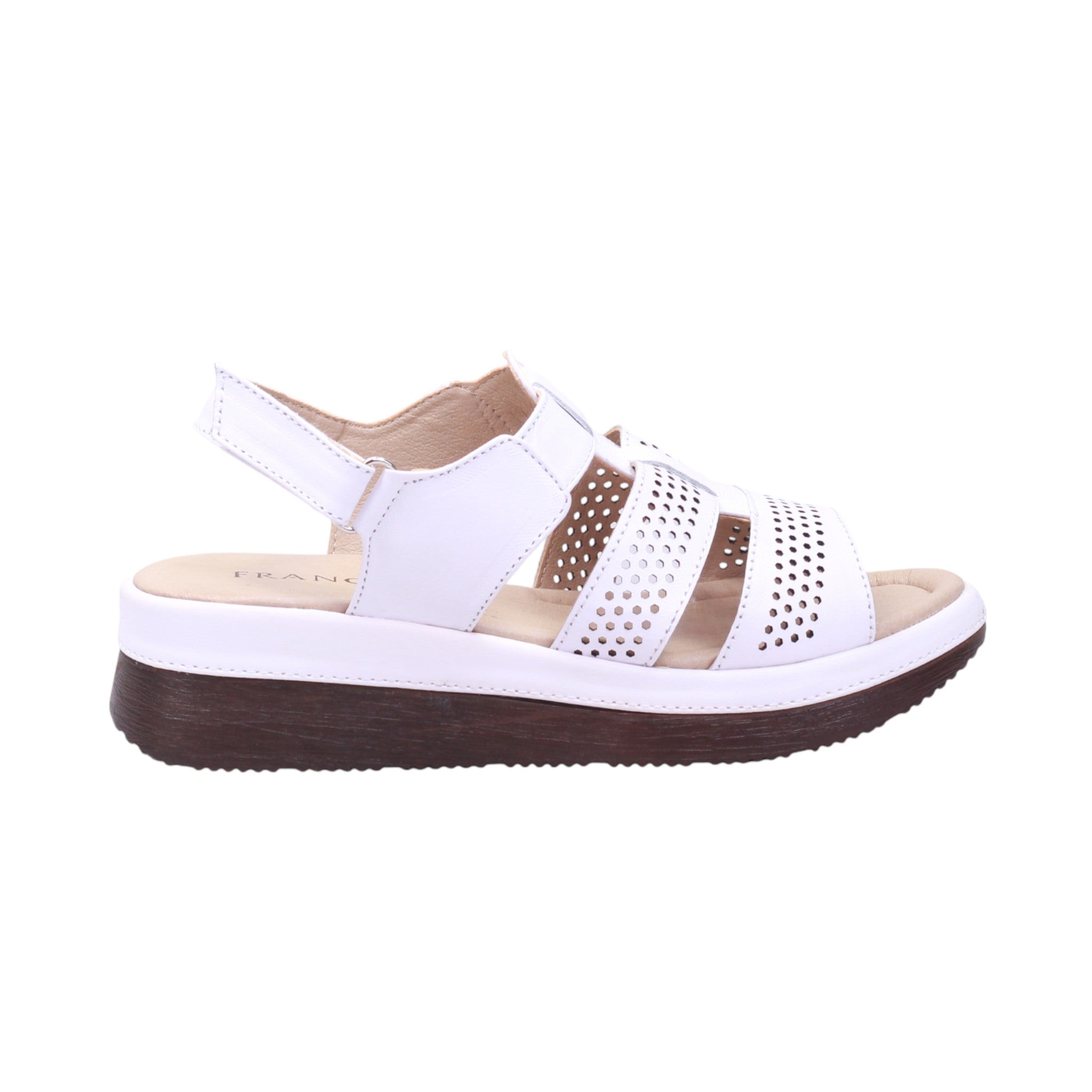 Sandalia con plataforma para dama marca Francis en colores blanco y rojo. Modelo de corte y forro artificial, con plataforma de 4.5 cm y ajuste trasero con velcro, diseñada para brindar comodidad, frescura y estilo en el uso diario. El diseño incluye puntera abierta, talón cerrado y tiras superiores con perforaciones decorativas, que aportan ventilación y un toque moderno. La plantilla acolchada en tono beige mejora la sensación de confort, mientras que la suela bicolor con base café y entresuela blanca ofrece contraste visual y buena tracción. Ideal para climas cálidos, caminatas urbanas o actividades cotidianas con enfoque práctico y femenino.