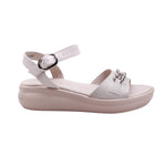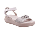 Sandalia de diseño moderno en color Silver. Elaborada con corte de piel porcina y forro artificial, en tono claro que aporta frescura y versatilidad. La parte frontal está compuesta por una tira texturizada que cubre los dedos, adornada con una cadena metálica decorativa en tono plata que añade un toque de estilo urbano y sofisticado.