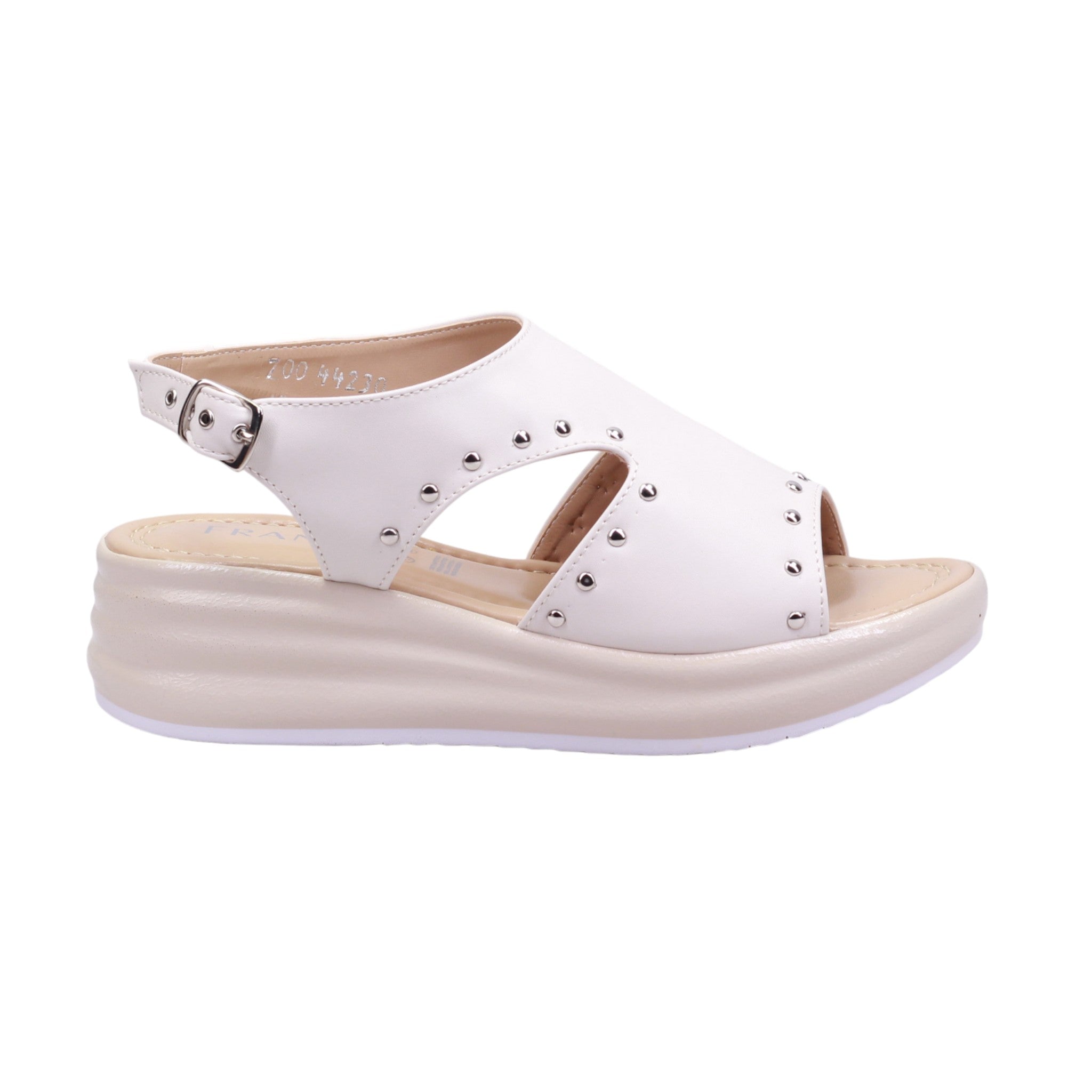 Plataforma para dama marca Francis en color late. Modelo con corte y forro artificial, ideal para lucir fresca y cómoda en temporada primavera-verano. El diseño incluye puntera abierta, detalle calado en el corte y estoperoles metálicos decorativos que aportan un toque moderno y femenino. La correa trasera tipo slingback con hebilla metálica permite un ajuste seguro, mientras que la plataforma uniforme en tono beige claro brinda estabilidad y contraste visual. La plantilla acolchada mejora el confort en cada paso, convirtiéndola en una sandalia casual con estilo, perfecta para combinar con vestidos, pantalones fluidos o conjuntos relajados.