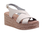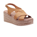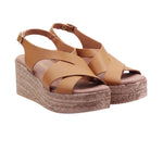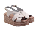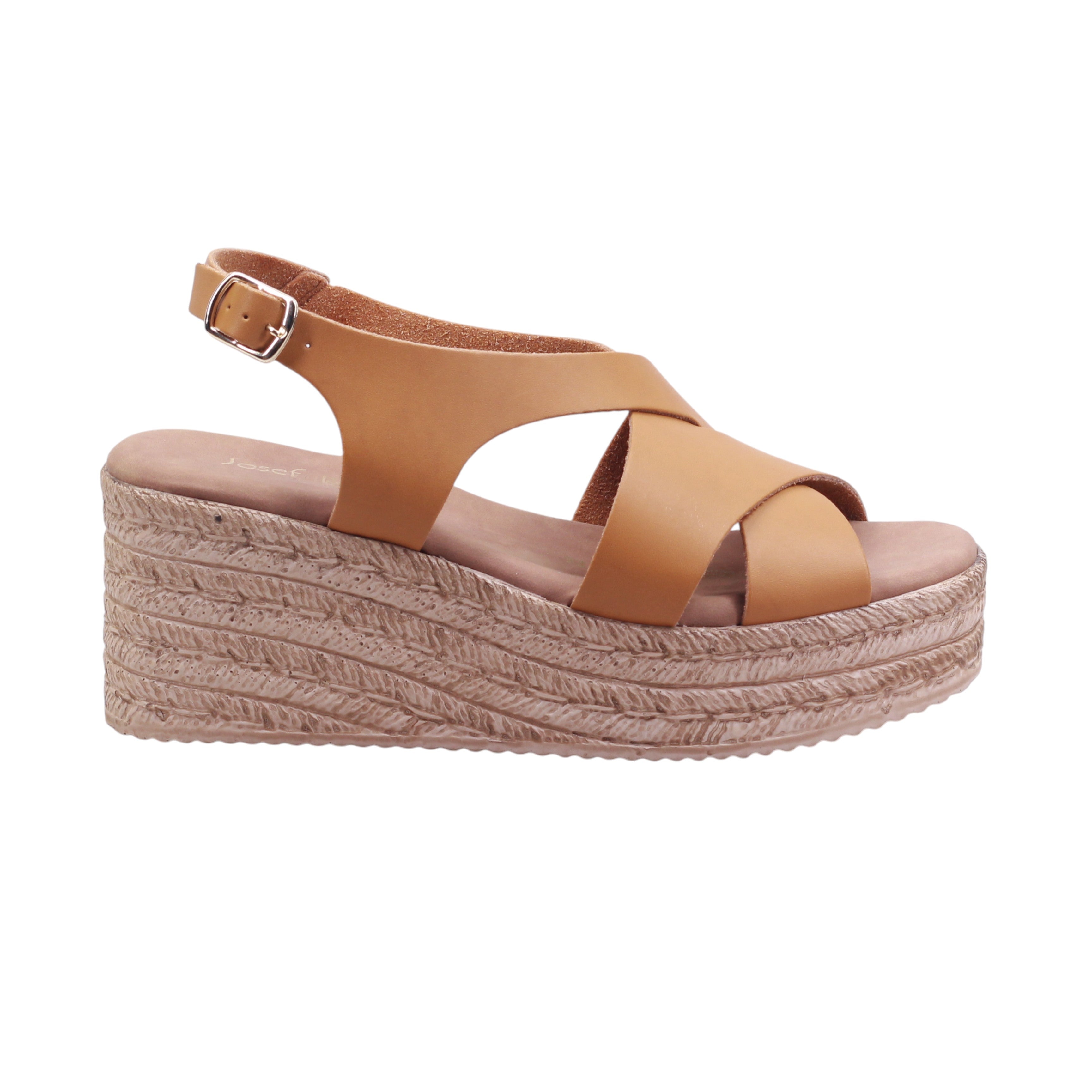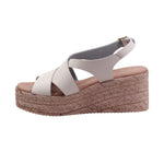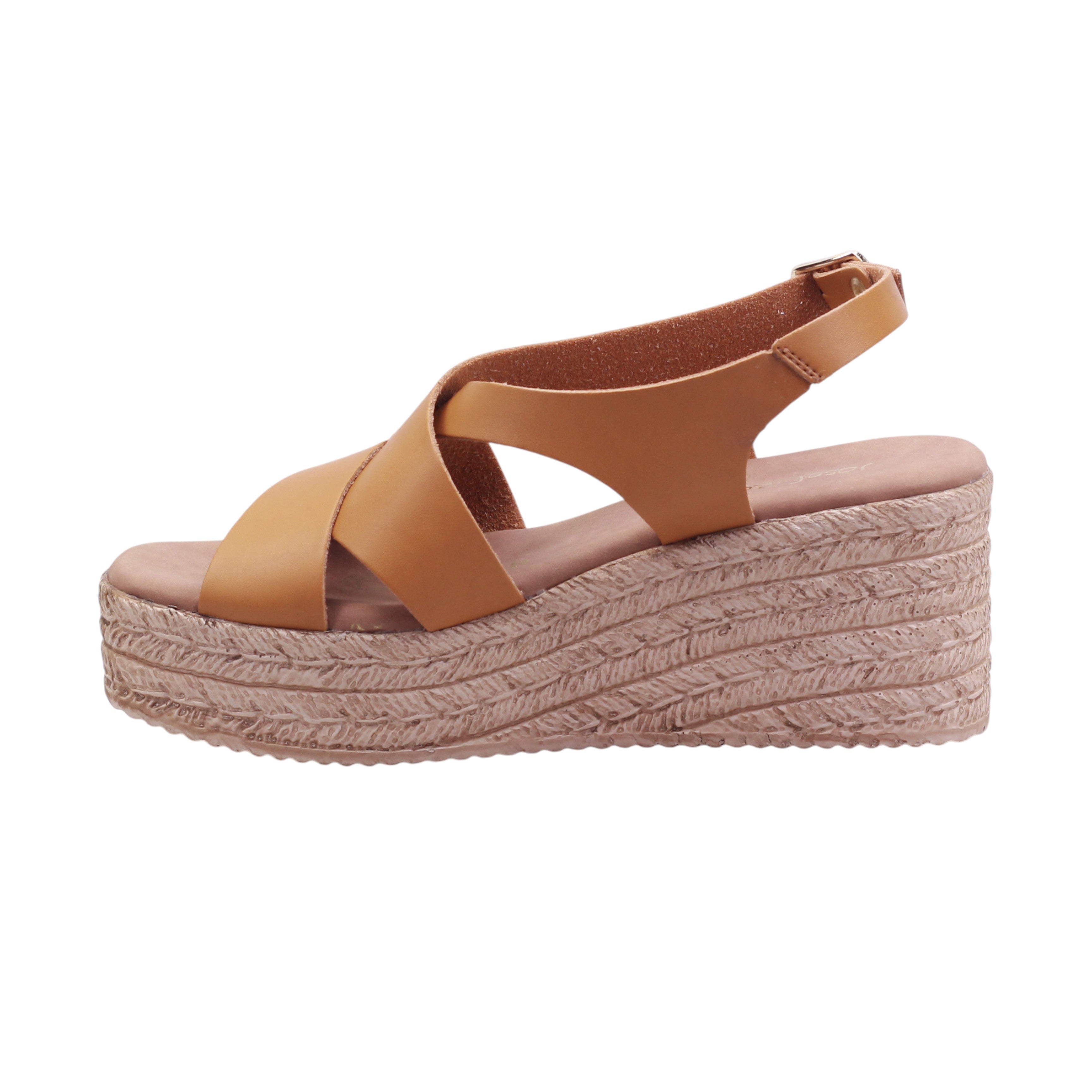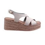 Plataforma para dama en colores avellana y late. Modelo de corte artificial sin forro, diseñada para brindar altura con estilo veraniego. La plataforma de 6.5 cm está revestida con diseño tipo tejido en acabado yute, que aporta textura natural y un look artesanal. Las tiras superiores se cruzan sobre el empeine en tono neutro, formando una estructura firme y cómoda. El ajuste se realiza mediante correa al tobillo con hebilla metálica, asegurando un calce estable. La plantilla acolchada en tono claro ofrece confort adicional, mientras que la suela con textura antiderrapante garantiza seguridad al caminar. Ideal para looks casuales, de temporada cálida o combinaciones boho chic.