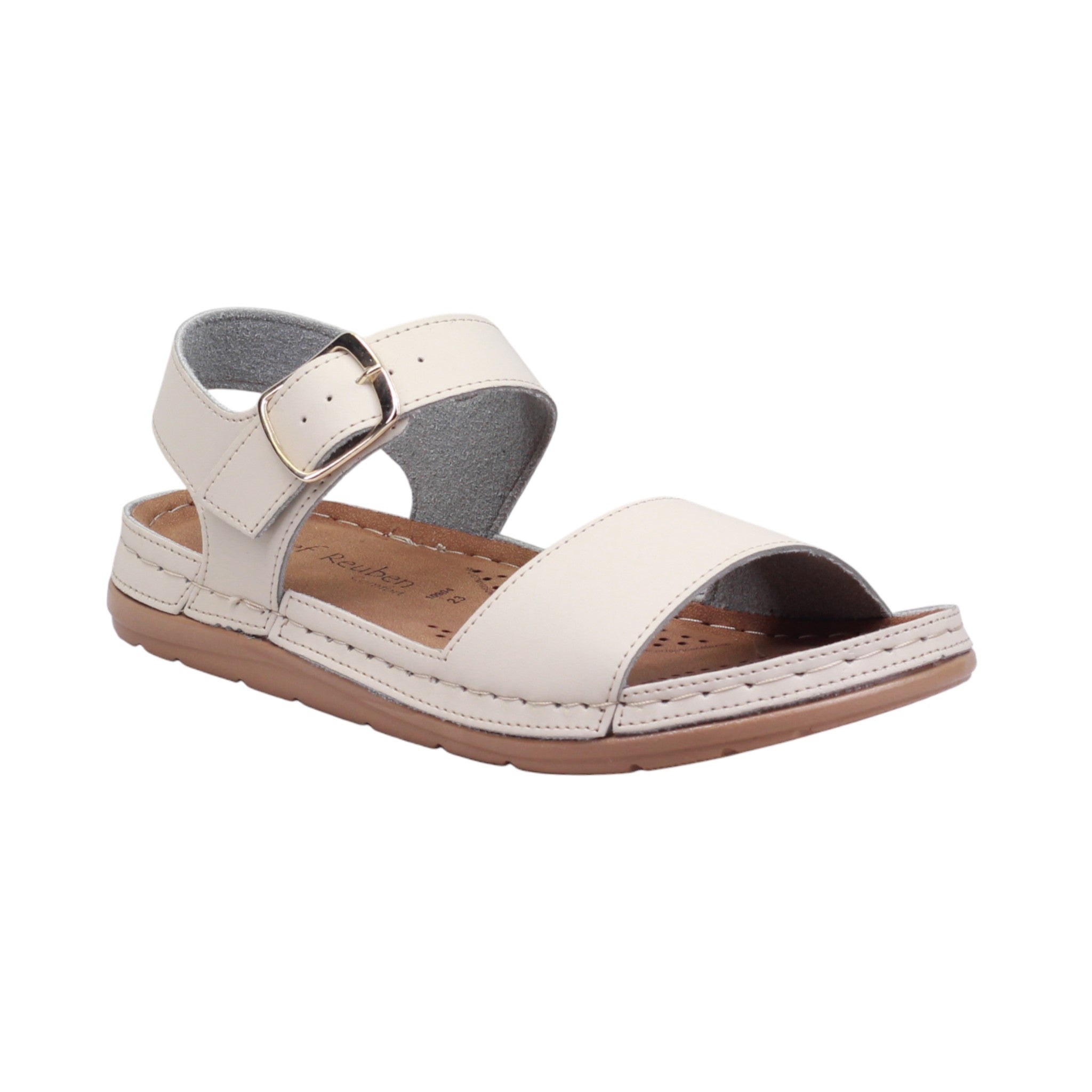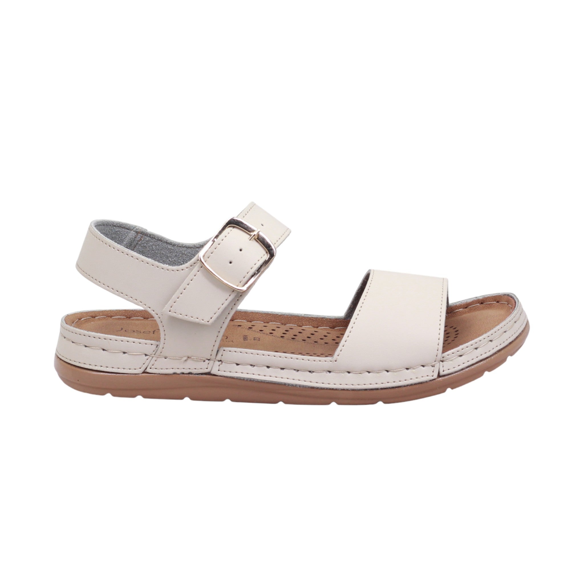 La plantilla acolchada en tono beige cuenta con perforaciones para transpiración y contorno anatómico que favorece la comodidad. La suela sólida en tono café claro tiene una altura de 1.5 cm, perfecta para caminatas ligeras o actividades cotidianas.