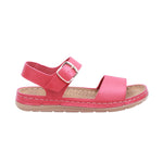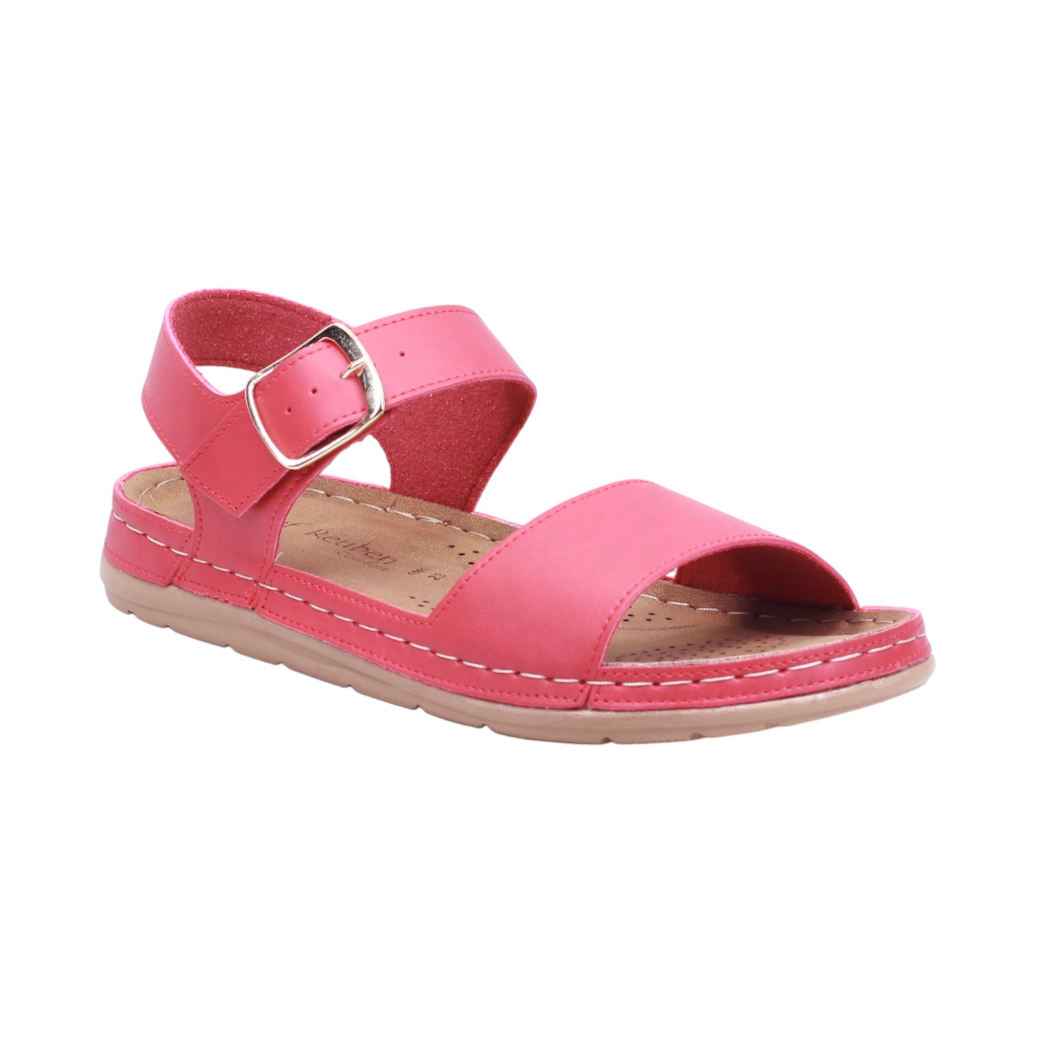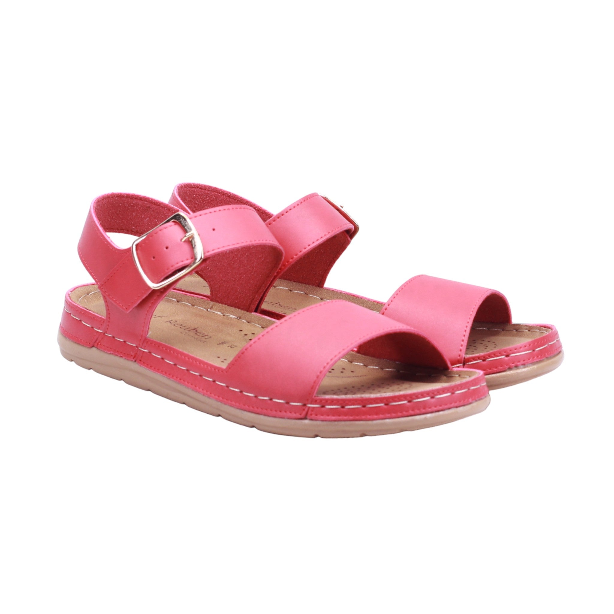 Sandalia casual disponible en colores oro y rojo, elaborada con corte artificial sin forro. Su diseño abierto presenta tiras cruzadas al frente que brindan soporte y estilo, acompañadas de una correa trasera cerrada con hebilla metálica que permite un ajuste seguro alrededor del tobillo.
