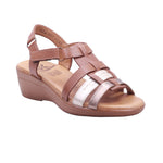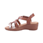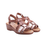 Sandalia para dama marca 20 Horas en color camel. Modelo de corte, forro y plantilla vacuno, con suela tipo cuña de 4.5 cm de altura, diseñada para brindar comodidad, soporte y estilo en el día a día. El diseño incluye puntera abierta y tiras entrelazadas en tonos marrón y metálico, que aportan textura y contraste visual. La parte trasera está cerrada para mayor soporte, y el ajuste al tobillo se realiza mediante hebilla metálica o cierre lateral, según el modelo. La plantilla acolchada mejora la sensación de confort, mientras que la cuña uniforme estiliza la silueta sin sacrificar estabilidad. Ideal para looks casuales, semiformales o de oficina con enfoque moderno y funcional.