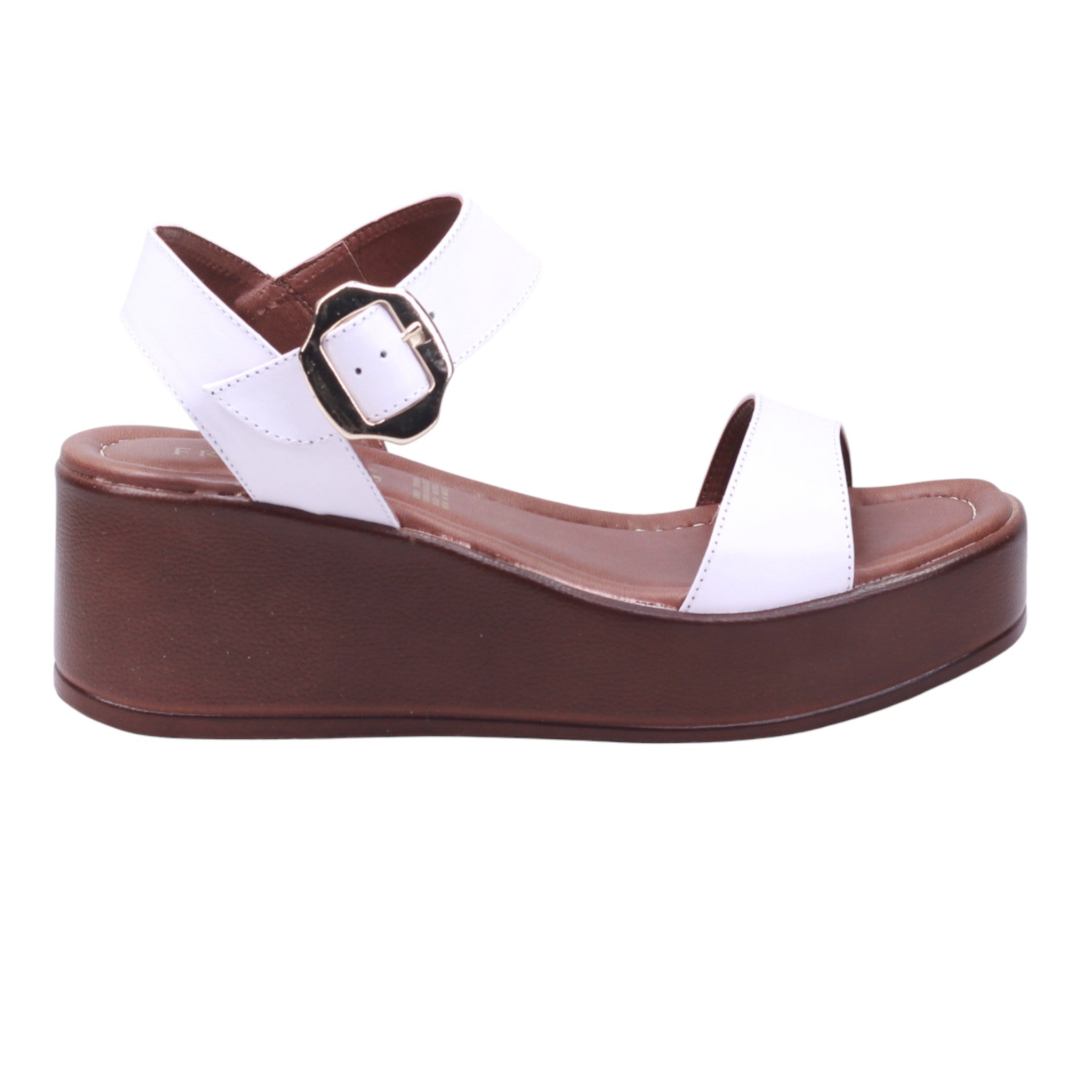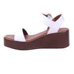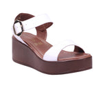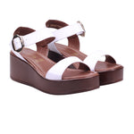 Calzado para dama marca Francis en color blanco. Modelo con corte en piel de ternera y forro en piel coagulada, diseñada para brindar comodidad y estilo en temporada primavera-verano. Su plataforma uniforme de 6.5 cm aporta altura con estabilidad, mientras que el diseño incluye puntera abierta, corte con perforaciones decorativas y ajuste al tobillo con hebilla metálica, que asegura firmeza y soporte al caminar. La plantilla acolchada mejora el confort, convirtiéndola en una sandalia de piel con plataforma alta