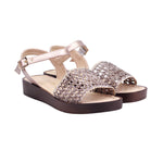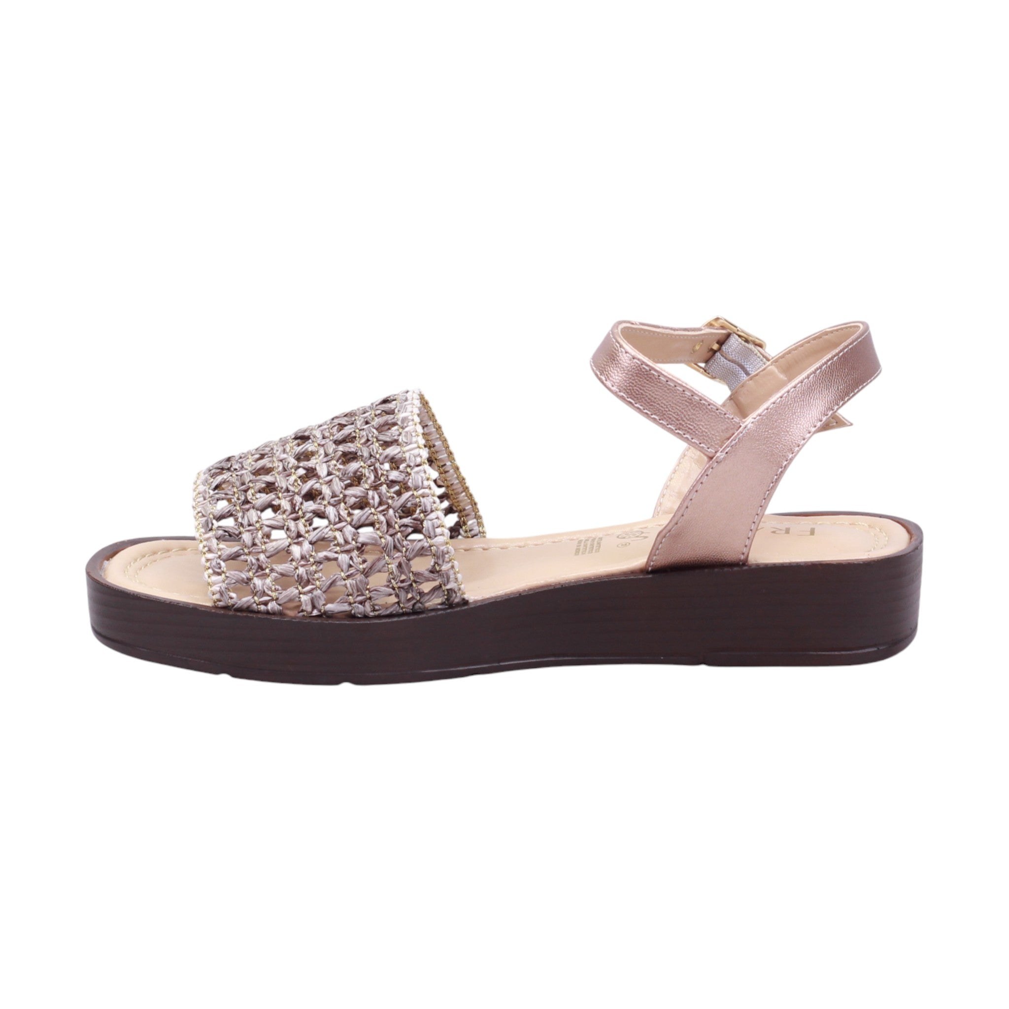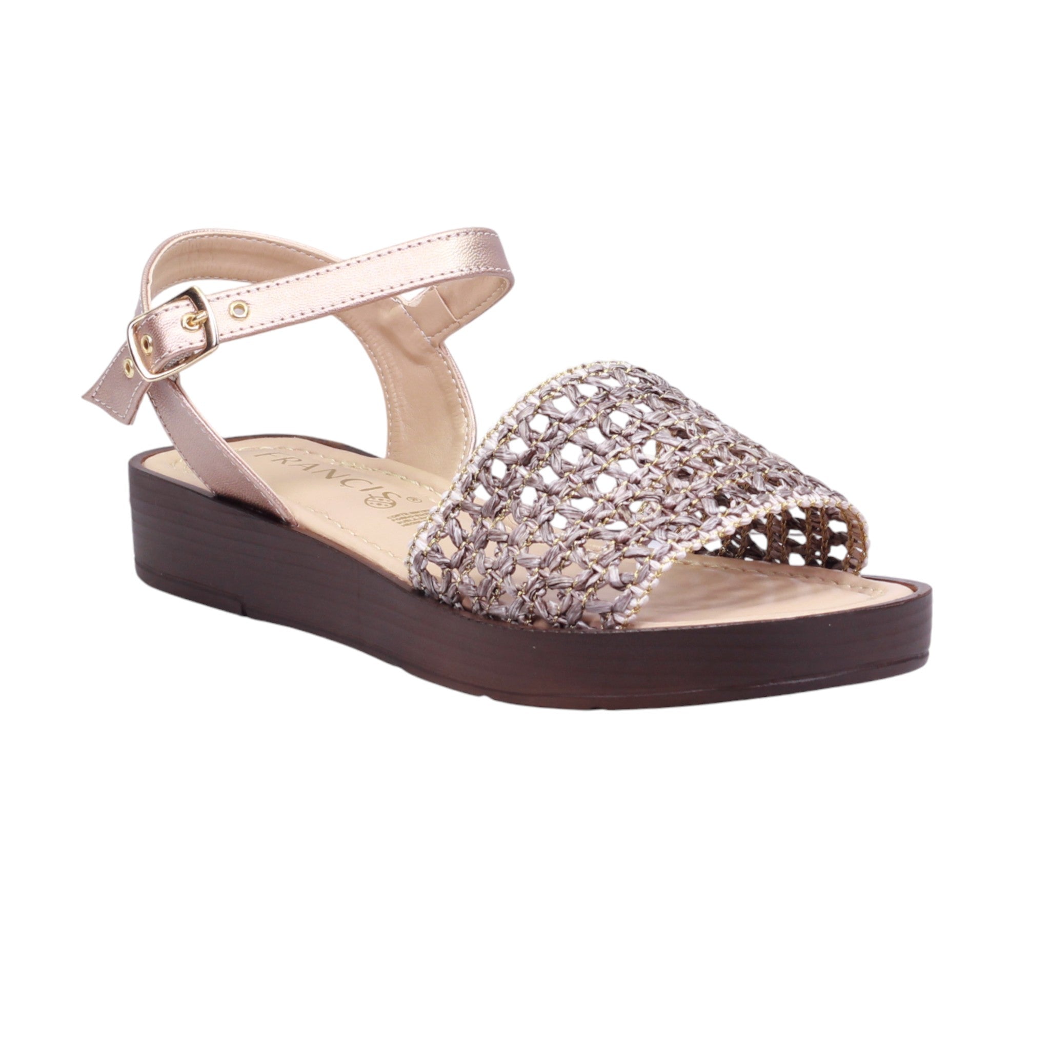 Sandalia para dama con corte y forro artificial, diseñada para brindar estilo y comodidad en temporada primavera-verano. El modelo presenta puntera abierta, tira frontal con acabado tejido metálico, que aporta textura y brillo decorativo, y correa al tobillo con hebilla dorada, que permite un ajuste seguro y elegante. La plataforma ligera de 2.5 cm en tono chocolate ofrece estabilidad sin sacrificar confort, mientras que la plantilla acolchada mejora la experiencia al caminar. La suela con textura dentada brinda buena tracción en superficies lisas. Perfecta como sandalia casual con diseño decorativo, pensada para combinar con vestidos fluidos, pantalones de lino o conjuntos relajados con aire femenino.