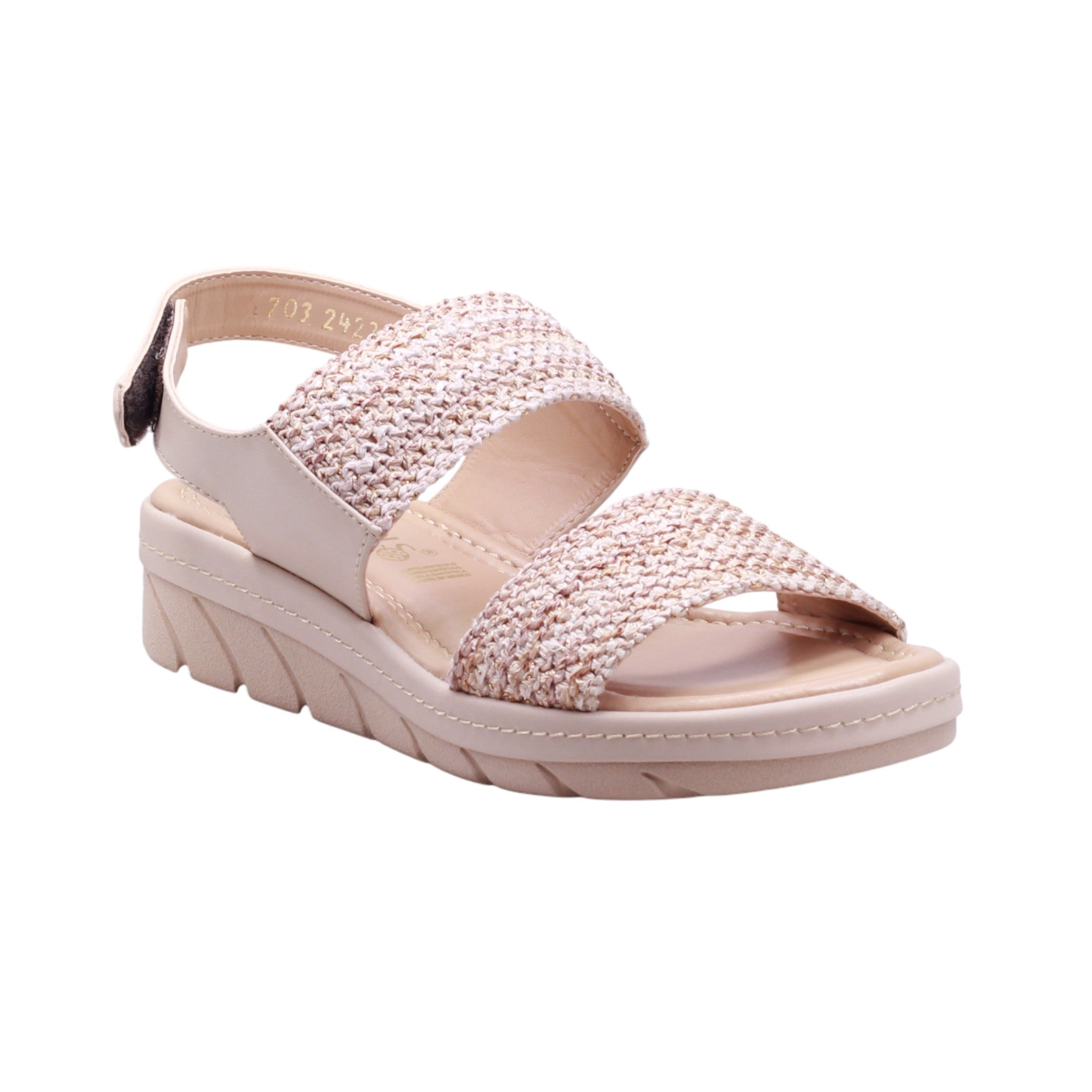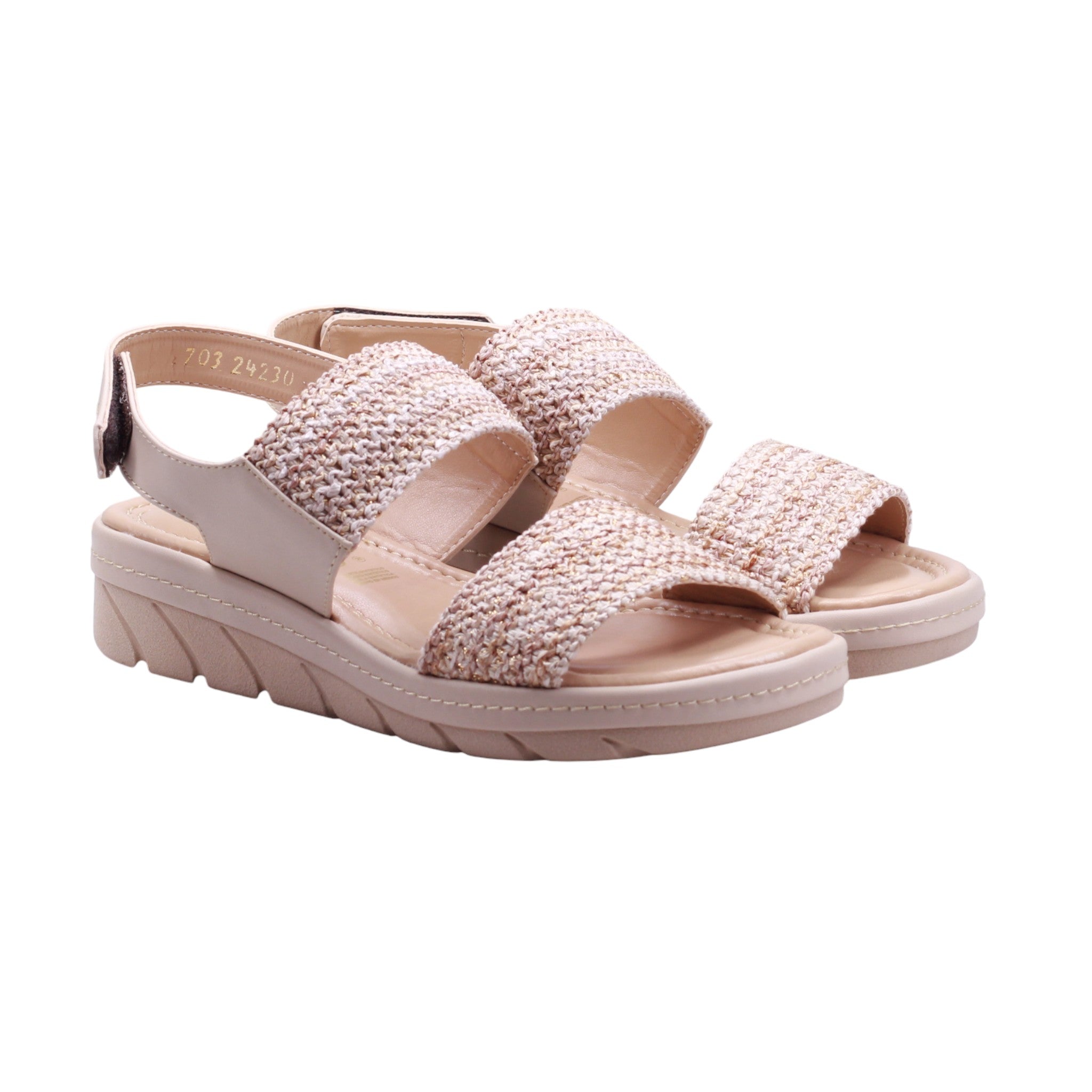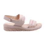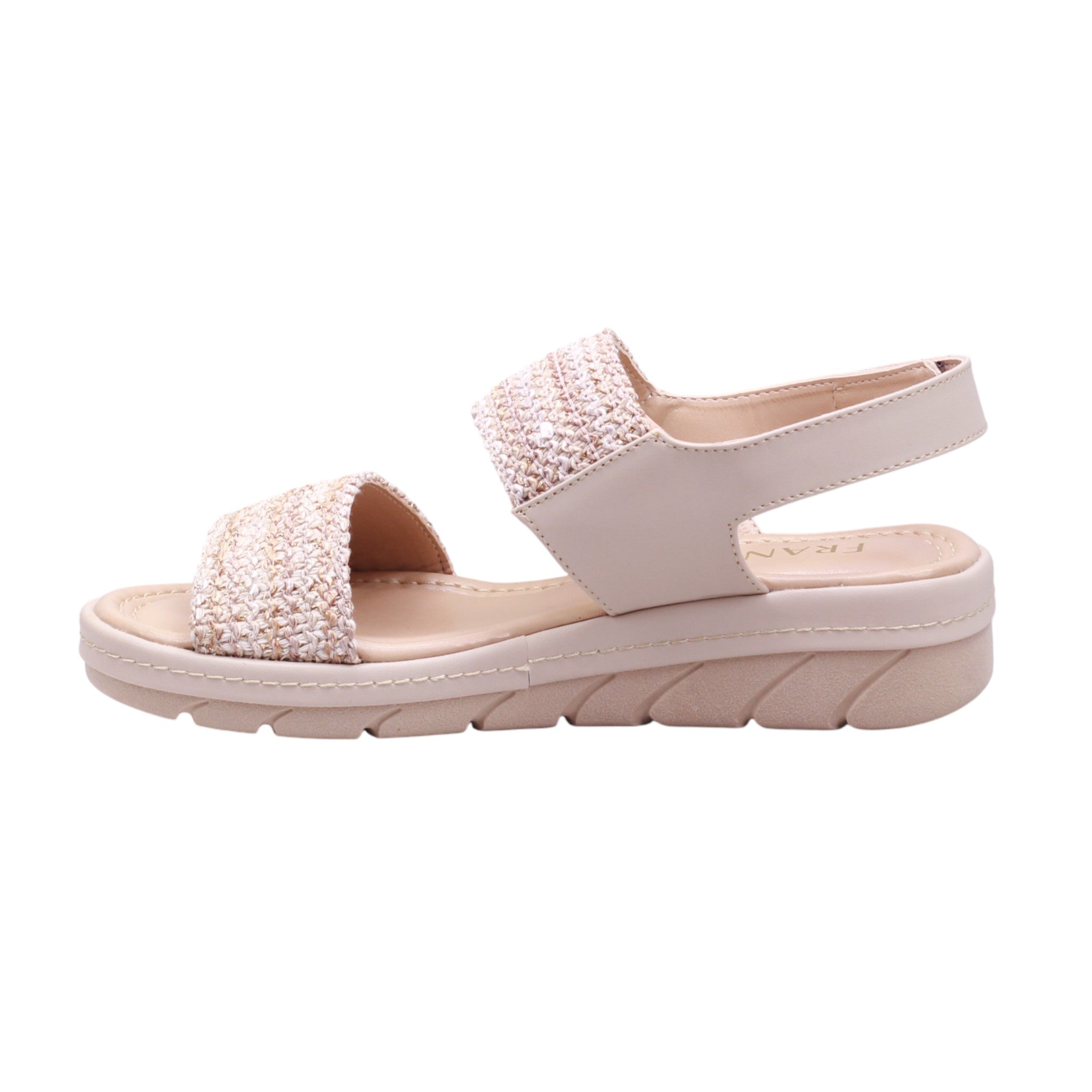 Sandalia para dama con corte y forro artificial, disponible en color nude, ideal para uso diario con estilo y comodidad. El diseño incluye puntera abierta, doble tira frontal en tejido decorativo, y correa acolchada al talón con ajuste de velcro, que permite un calce práctico y seguro. La plataforma ligera en tono beige claro brinda estabilidad y contraste visual, mientras que la plantilla acolchada mejora el confort en cada paso. Perfecta como sandalia casual con diseño textil, pensada para combinar con prendas frescas, pantalones fluidos o conjuntos relajados.