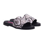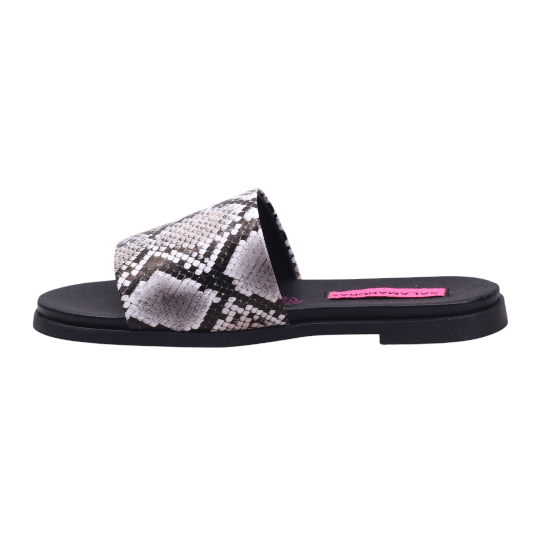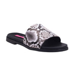 Sandalia tipo slide para dama con corte y forro artificial, ideal para quienes buscan un calzado cómodo con diseño llamativo. El modelo presenta puntera abierta, tira ancha al frente con acabado tipo piel de serpiente en tonos blanco, gris y negro, que aporta textura visual y un estilo moderno. La plantilla en tono negro está ligeramente acolchada para mayor confort, y el tacón bajo permite uso prolongado sin fatiga. La suela plana con ligera elevación ofrece estabilidad y un perfil casual. Perfecta como sandalia urbana con diseño animal print, pensada para combinar con jeans, shorts o vestidos monocromáticos que resalten el estampado.