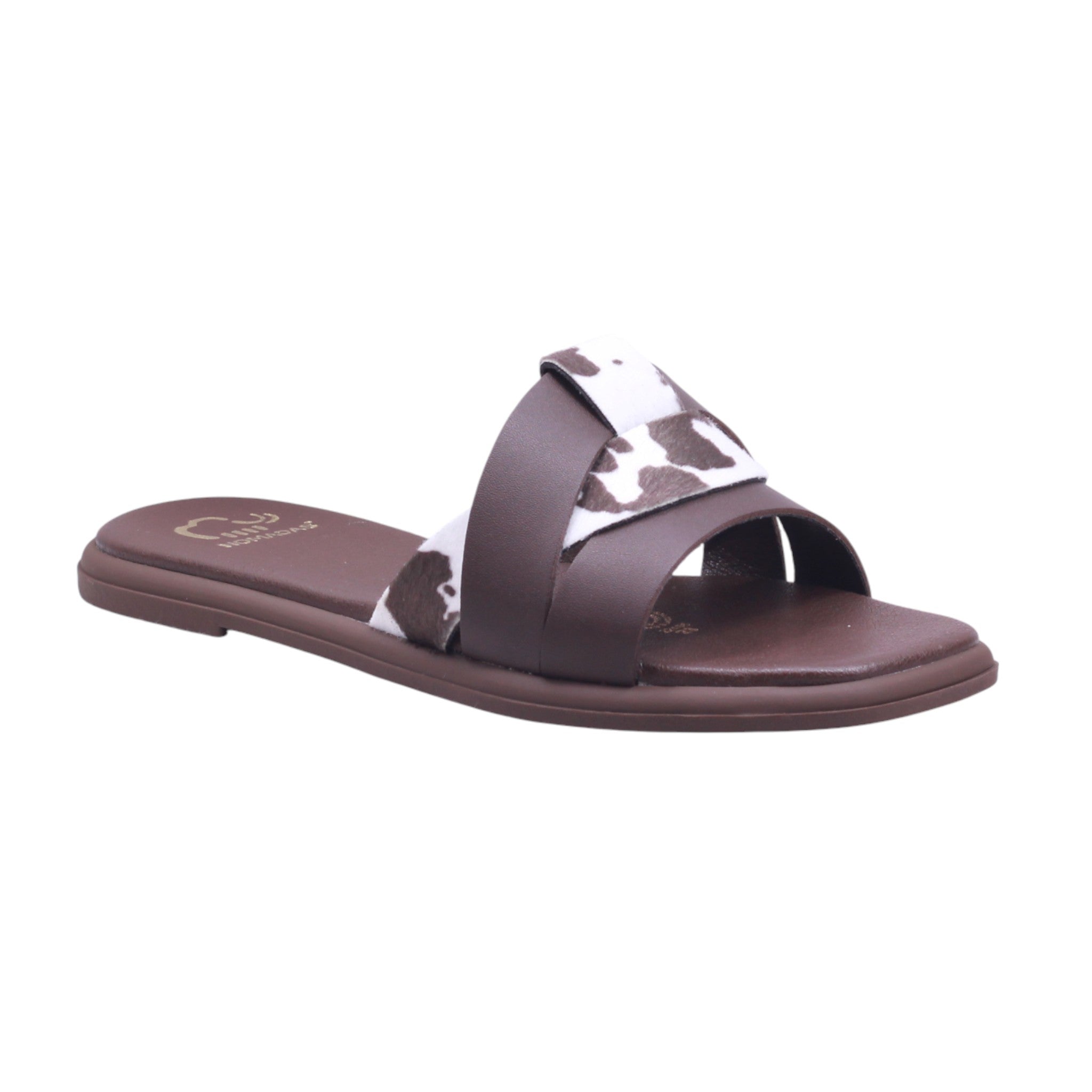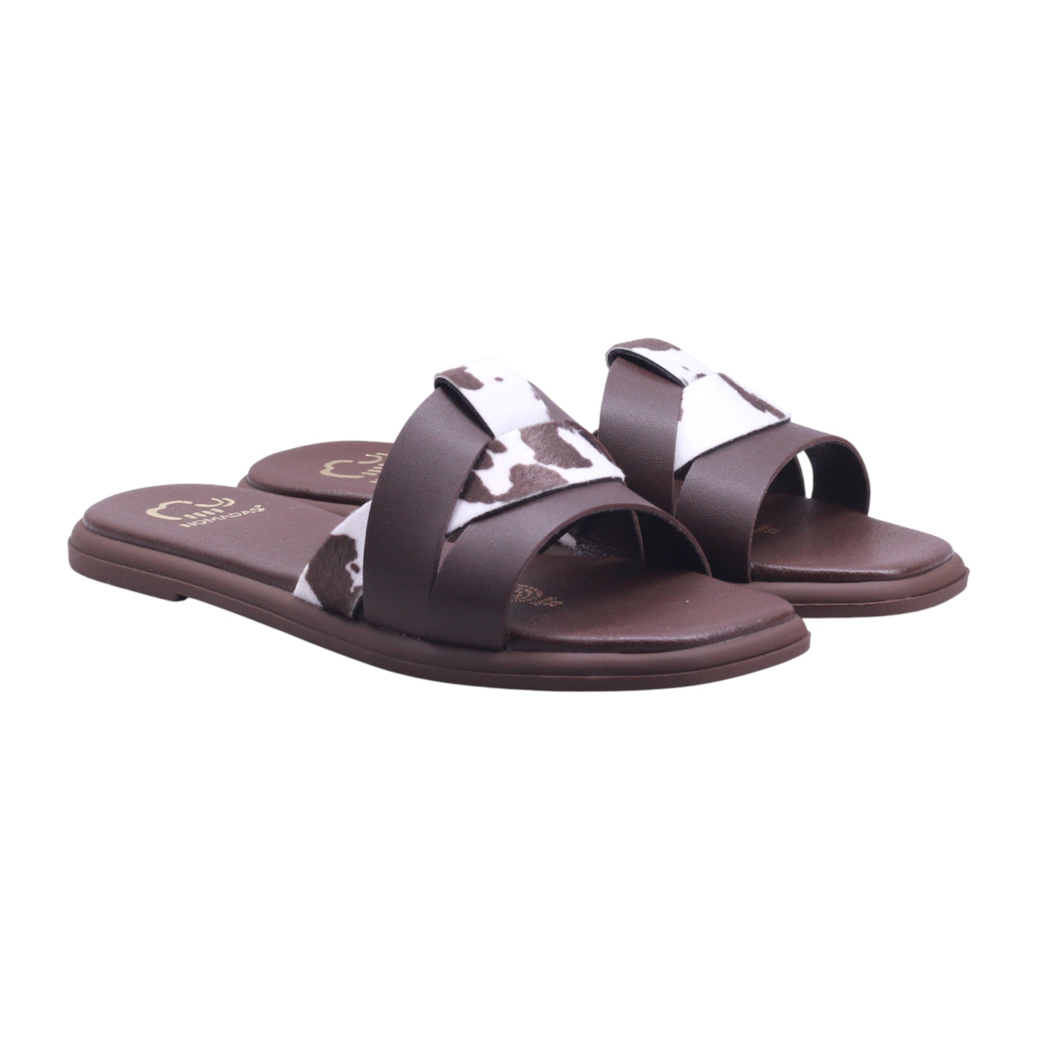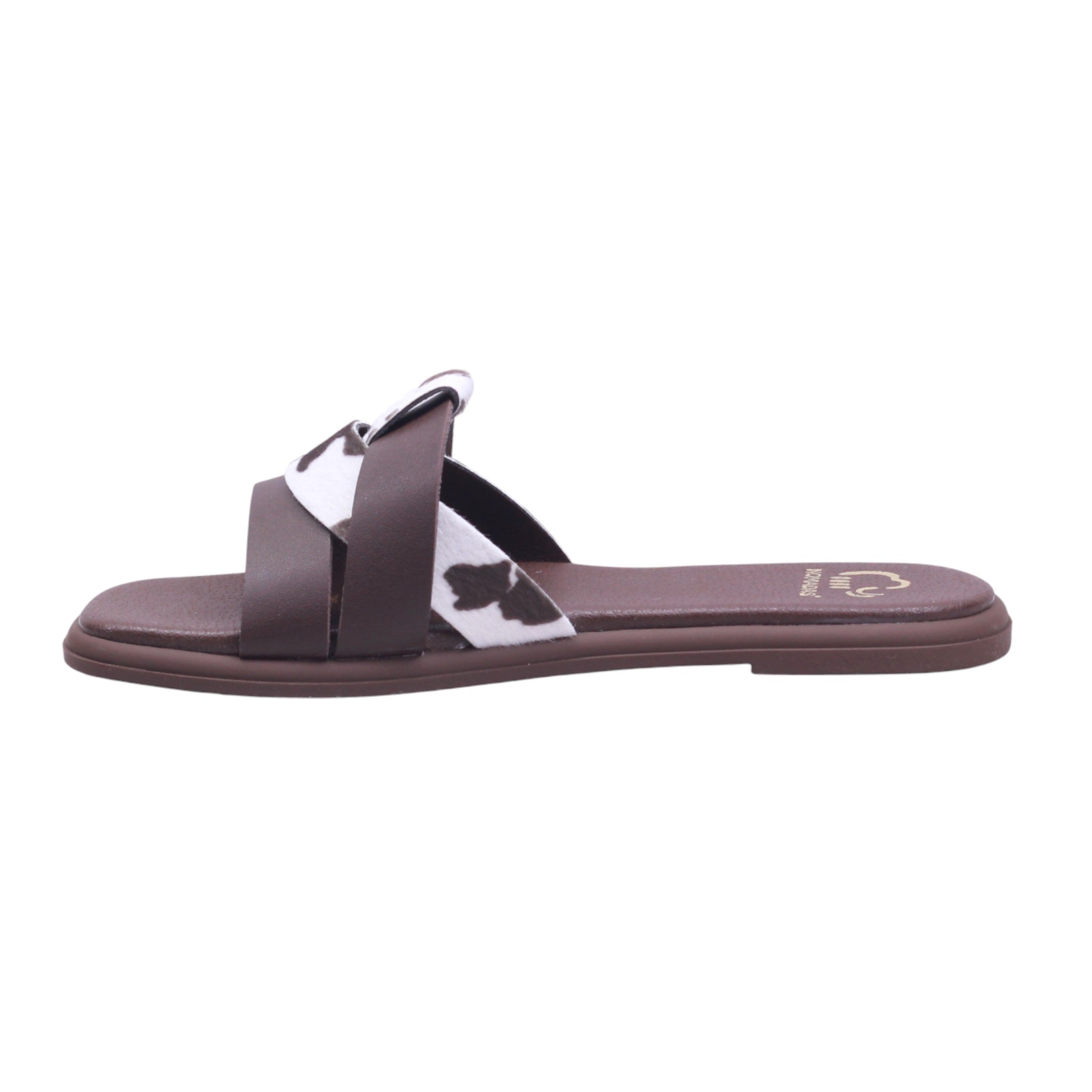 Sandalia para dama con corte y forro artificial, disponible en color café, ideal para quienes buscan comodidad y estilo en un calzado práctico. El diseño tipo metedera incluye tiras cruzadas al frente, combinando material liso con estampado tipo vaquita en tonos blanco y marrón, que aportan un toque moderno y distintivo. El tacón bajo ofrece estabilidad para uso prolongado, mientras que la plantilla acolchada mejora la experiencia al caminar. La suela plana en tono café oscuro complementa el diseño y brinda buena tracción. Perfecta como sandalia casual con diseño original, pensada para combinar con atuendos relajados, jeans o vestidos ligeros.