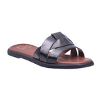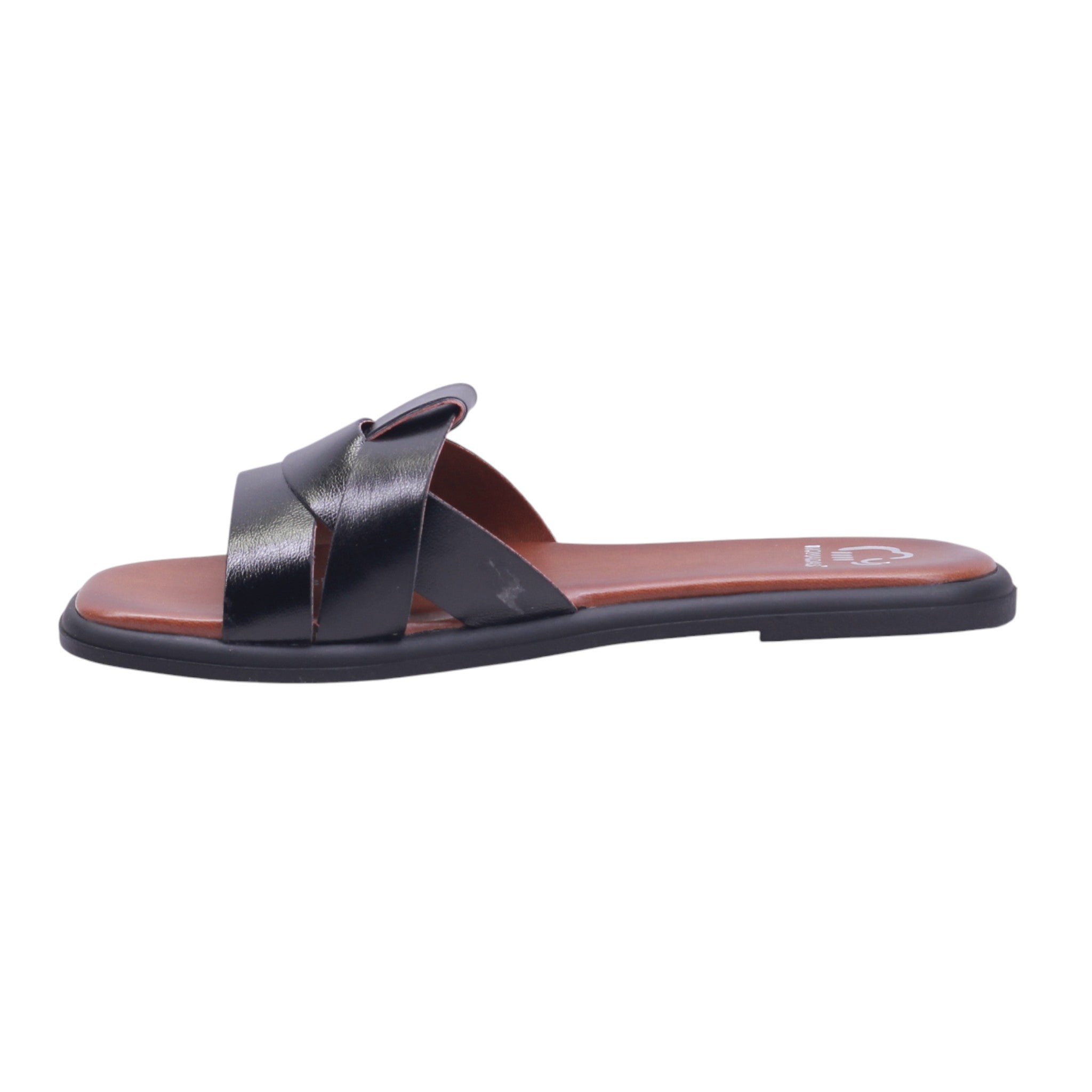 Sandalia para dama con corte y forro artificial, disponible en color negro, ideal para quienes buscan un calzado cómodo con acabado moderno. El diseño tipo metedera incluye tiras cruzadas al frente en material brillante, que aportan un toque elegante y versátil. La puntera abierta permite frescura, mientras que el tacón bajo ofrece estabilidad para uso prolongado. La plantilla acolchada en tono café mejora el confort en cada paso, y la suela plana en tono negro brinda buena tracción. Perfecta como sandalia casual con diseño minimalista, pensada para combinar con jeans, vestidos o conjuntos monocromáticos.