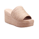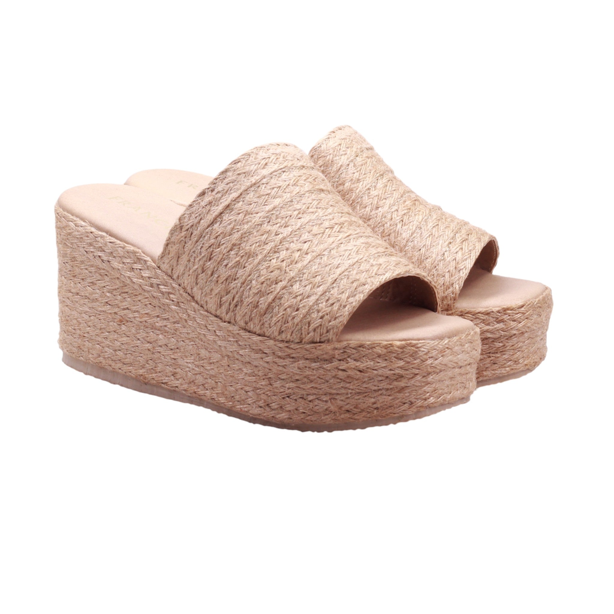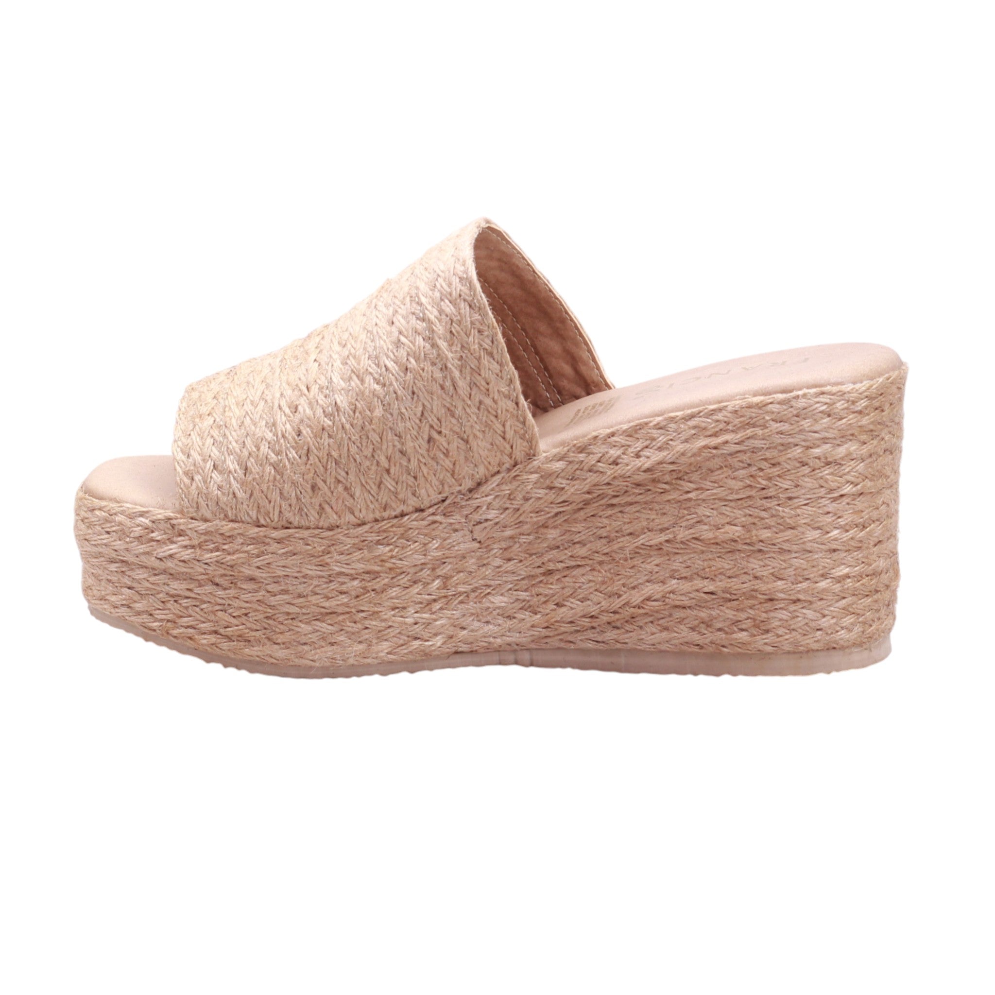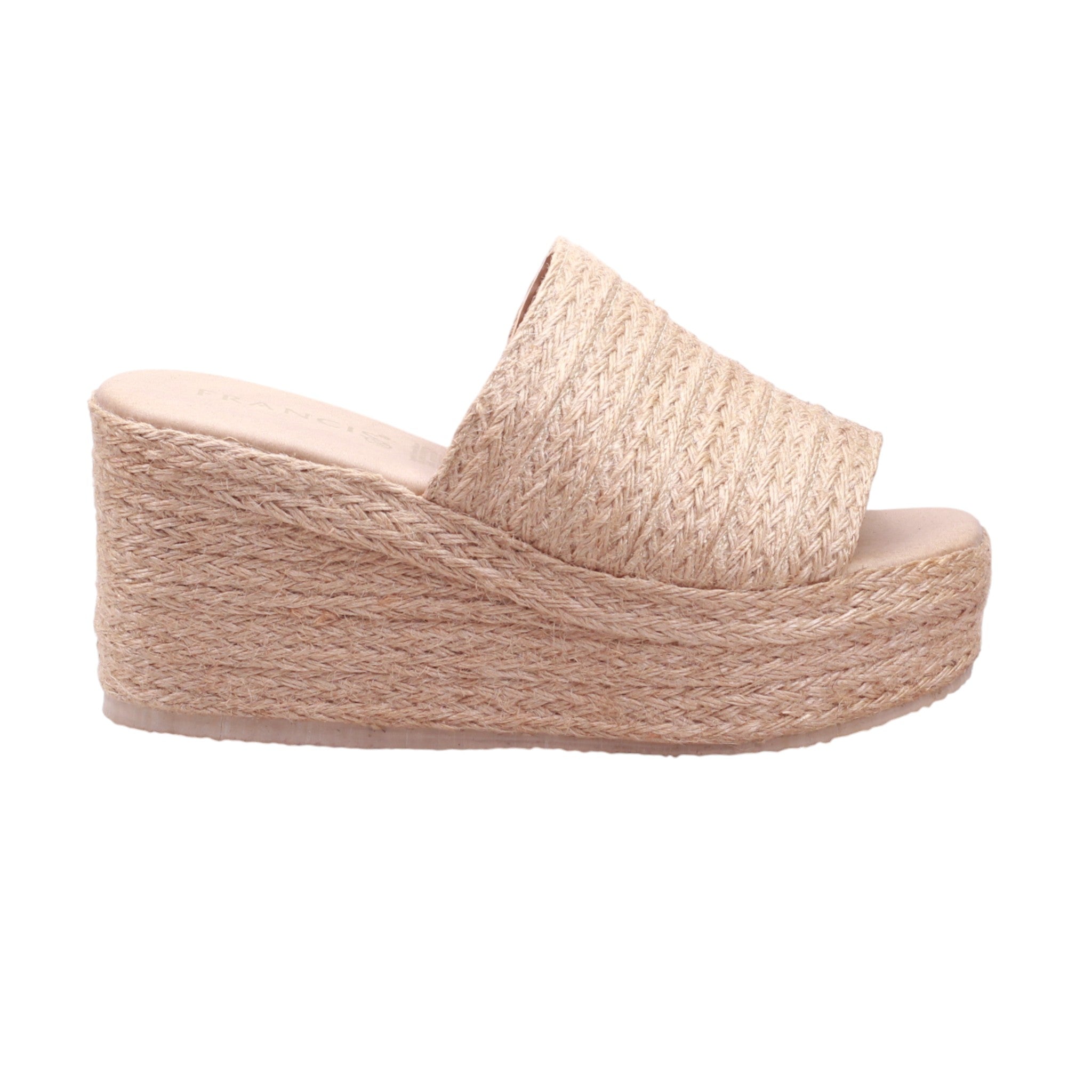 Sandalia tipo cuña en color natural, elaborada con corte y forro artificial que ofrecen estructura ligera y durabilidad. El diseño presenta una banda amplia sobre el empeine, confeccionada en material trenzado que simula fibras naturales, aportando textura rústica y un estilo artesanal. La plataforma tejida en yute tiene una altura de 8 cm, ideal para estilizar la figura sin comprometer la comodidad.