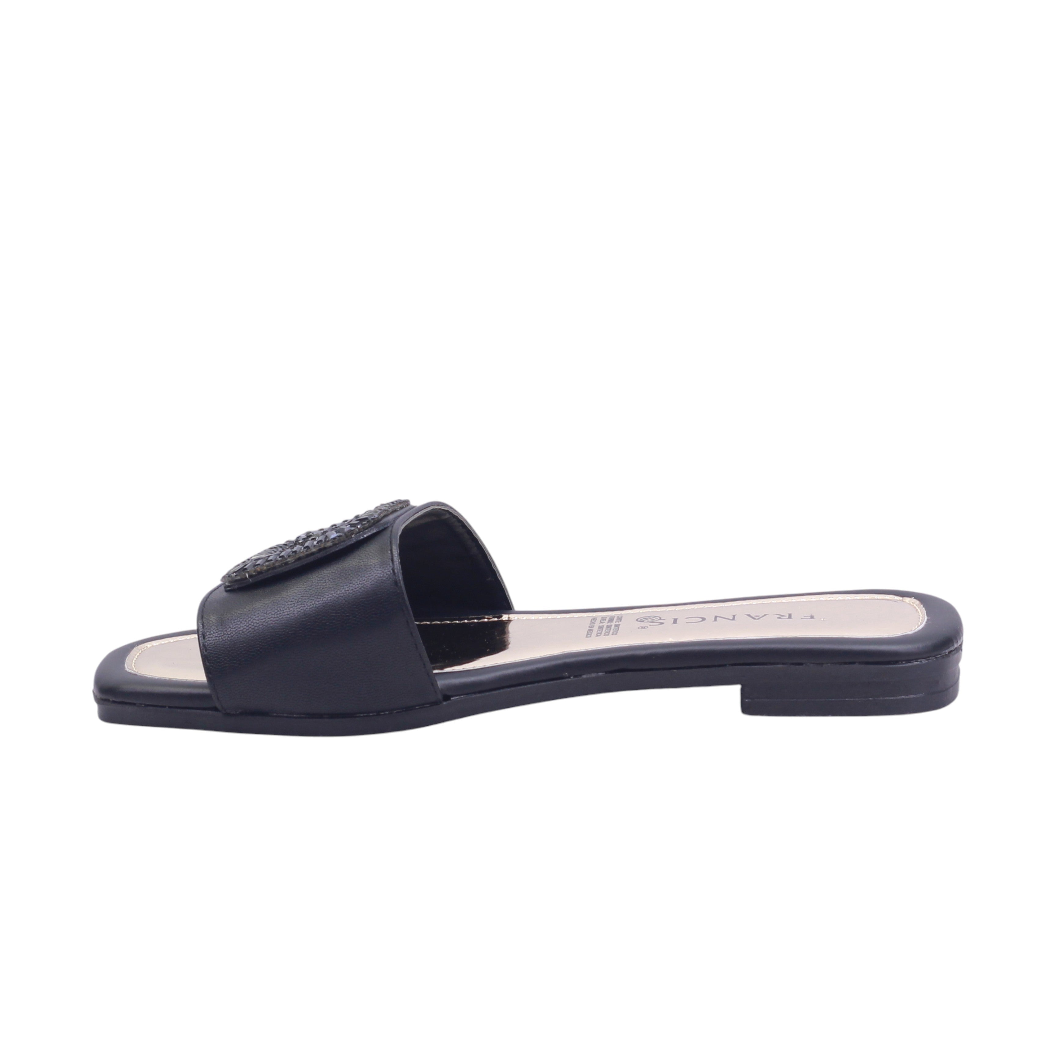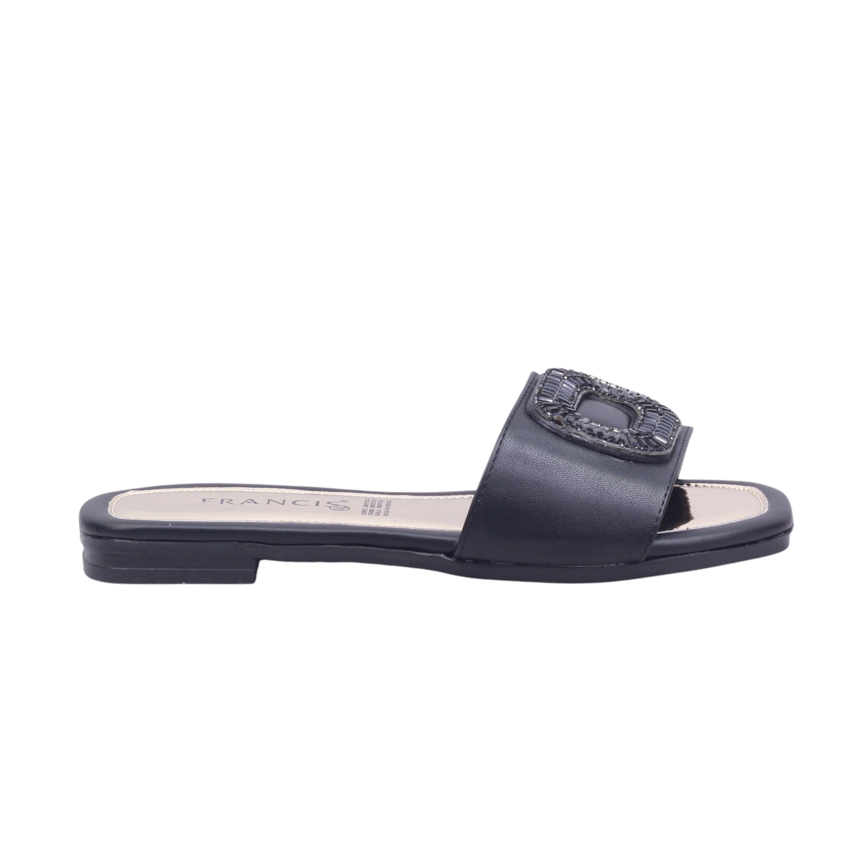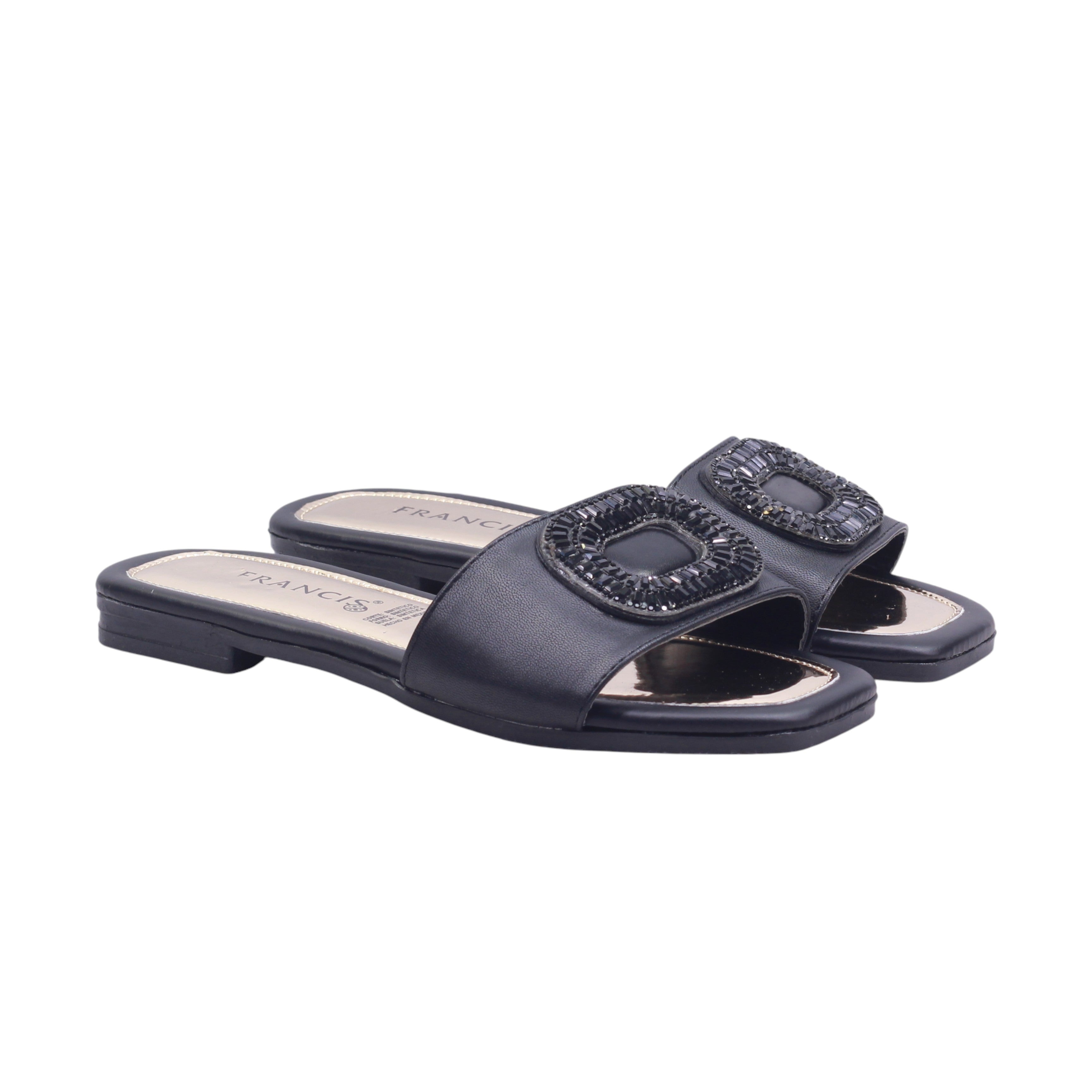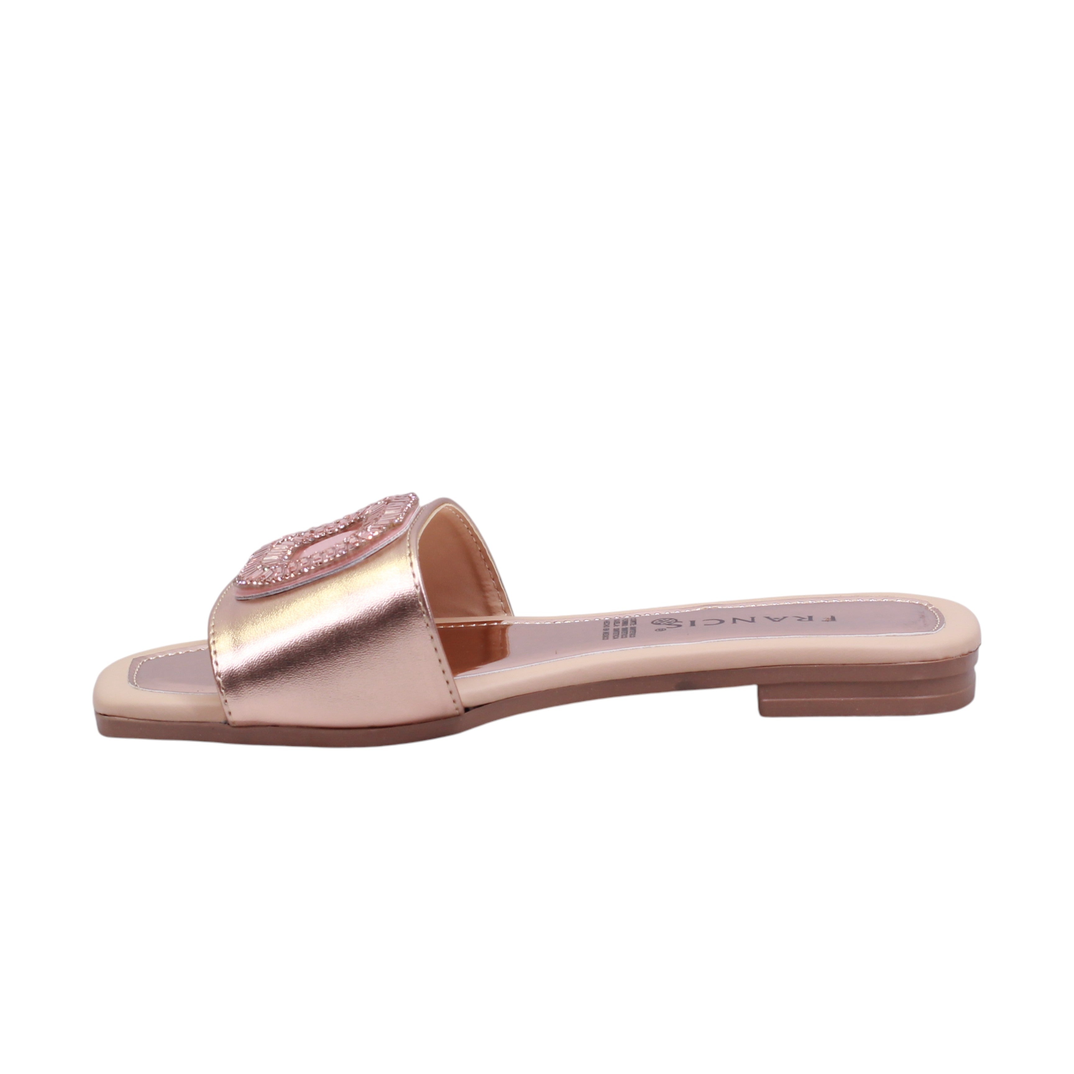 El diseño tipo slide presenta una base en color negro y en tono oro rosado, creando un contraste sofisticado y moderno. La parte superior está compuesta por una banda ancha que cubre el empeine, decorada con un adorno rectangular de gran presencia, compuesto por un centro tipo piedra negra rodeado de pequeñas cuentas metálicas en tono oro rosado. Este herraje está integrado al corte, aportando un toque de lujo sin ser excesivo.