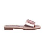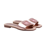 La suela es plana con textura antiderrapante, pensada para brindar seguridad en superficies lisas. El diseño abierto en punta permite frescura, mientras que el acabado brillante y los detalles metálicos elevan el estilo del calzado. Perfecta para combinar con vestidos fluidos, pantalones de lino o conjuntos monocromáticos.