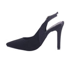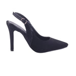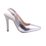 El ajuste se realiza mediante una tira trasera delgada con hebilla metálica, decorada con acabado brillante tipo glitter que rodea el tobillo con un toque glamoroso. Esta tira no solo aporta soporte, sino que también funciona como elemento decorativo, contrastando con la sobriedad del corte principal.